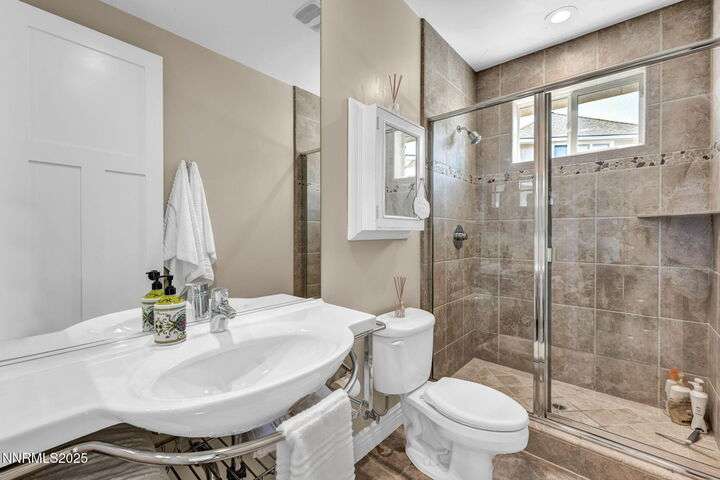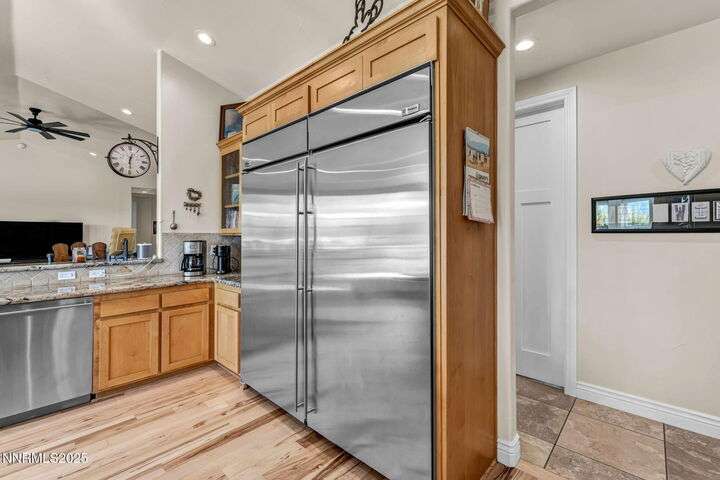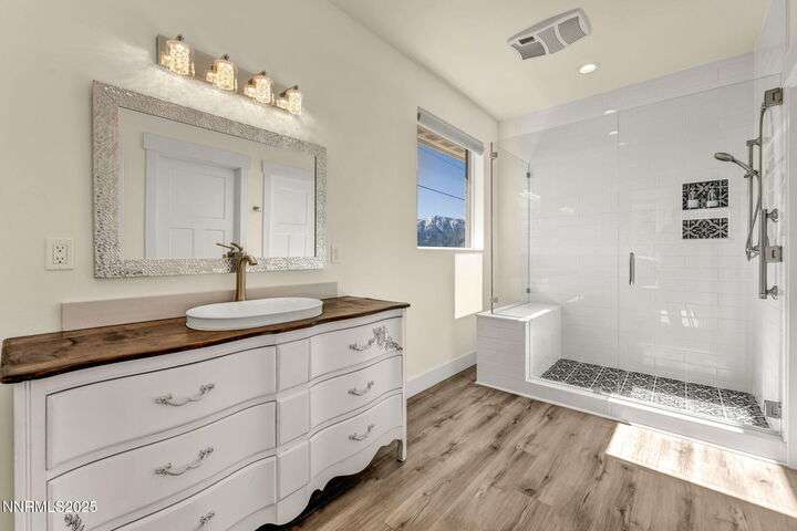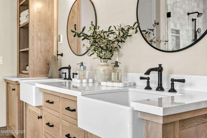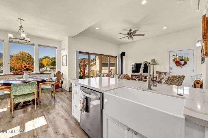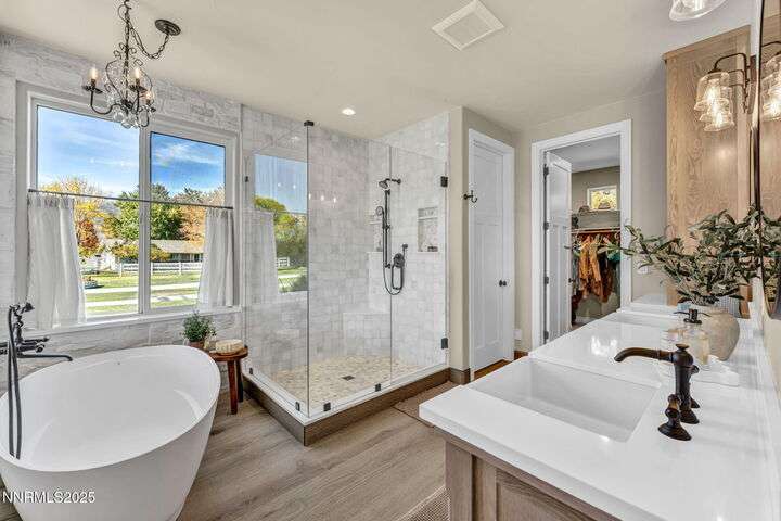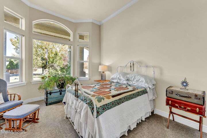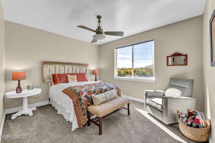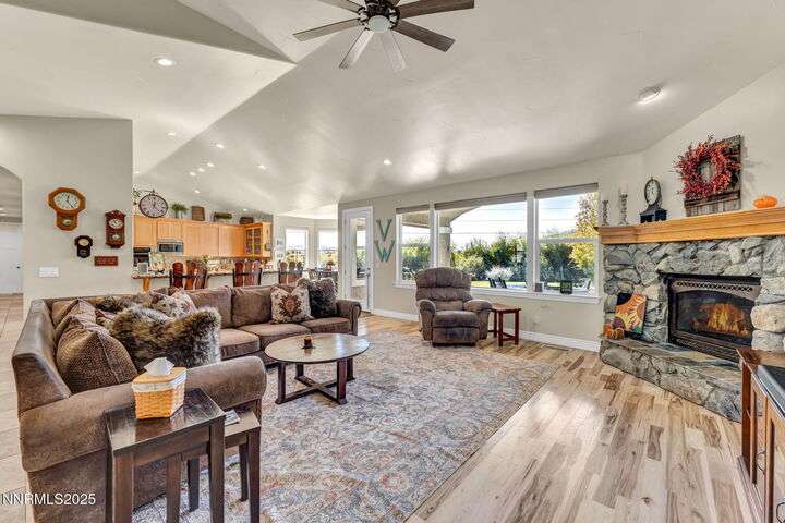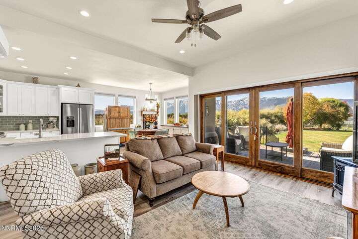 Rural Feel, In-Town Living! Homes like this don't come on the market very often. This stellar home is a rare find as it is located on a private road in the heart of Minden, and sits on a 1.15-acre lot. The 4108-sf main house includes 4 ensuite bedrooms. The primary bedroom boasts a stone soaking tub, separate shower, double sinks and huge walk-in closet. After a soak in the hot tub just off the bedroom, warm your toes by the ensuite fireplace as you enjoy a good book. The spacious great room offers vaulted ceilings, a huge fireplace that features a beautiful stone hearth, ceiling fan and spectacular views of the Sierra Peaks from the picture windows. The kitchen has granite counters and more than ample cabinetry and a full pantry. The Thermador 6 Burner gas cooktop is complimented by GE Monogram double ovens and a built-in microwave. The impressive Monogram Refrigerator/Freezers are two 48 units' side by side. The large breakfast bar, sunny nook and hickory hardwood floors complete the picture. A huge formal dining room can accommodate a large family gathering and is lit by an impressive chandelier. Did someone say laundry? The laundry room is massive with lots of storage, sink and access to the 4-car garage. The back covered patio is perfect for entertaining with an outdoor kitchen, views and privacy. Mature landscaping makes this a park-like setting. The 1408-sf in-law quarters are part of the 3286-sf RV/Shop. This 1-bedroom ensuite with an additional half bath has a well-appointed kitchen with Quartz counters, Whirlpool appliances, refrigerator, mini splits and an on-demand water heater. The comfortable living room offers a small gas stove for those chilly nights. The beautiful 400+ sf Trex deck is visible from the 12-foot double-sliding glass door that frames this outdoor space with exquisite views. Upstairs is a large 315 sf bonus room. Remaining space in the shop (2606 sf) houses extra garage space and two 50-ft-RV-bays. Additional features include an 8x12 shed and 30KW diesel generator capable of running the entire property should the power go out. Words alone do not do this property justice. Please view the videos and website for all the pictures.