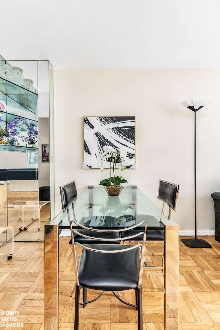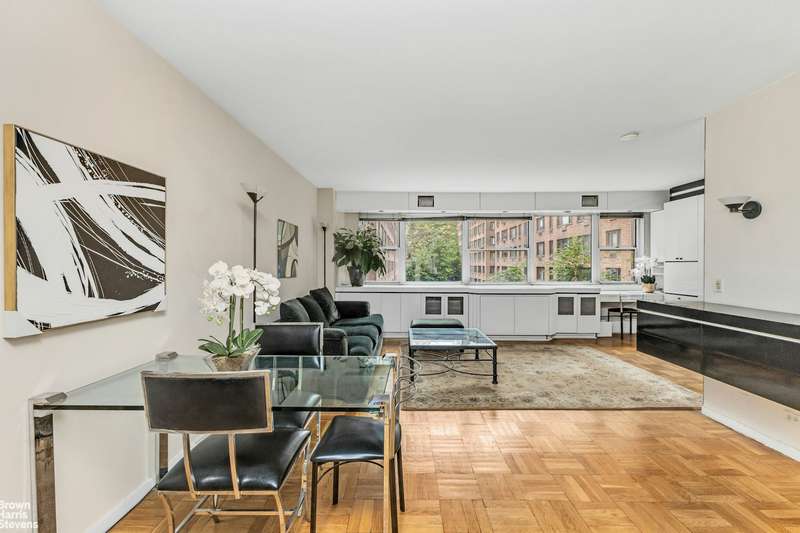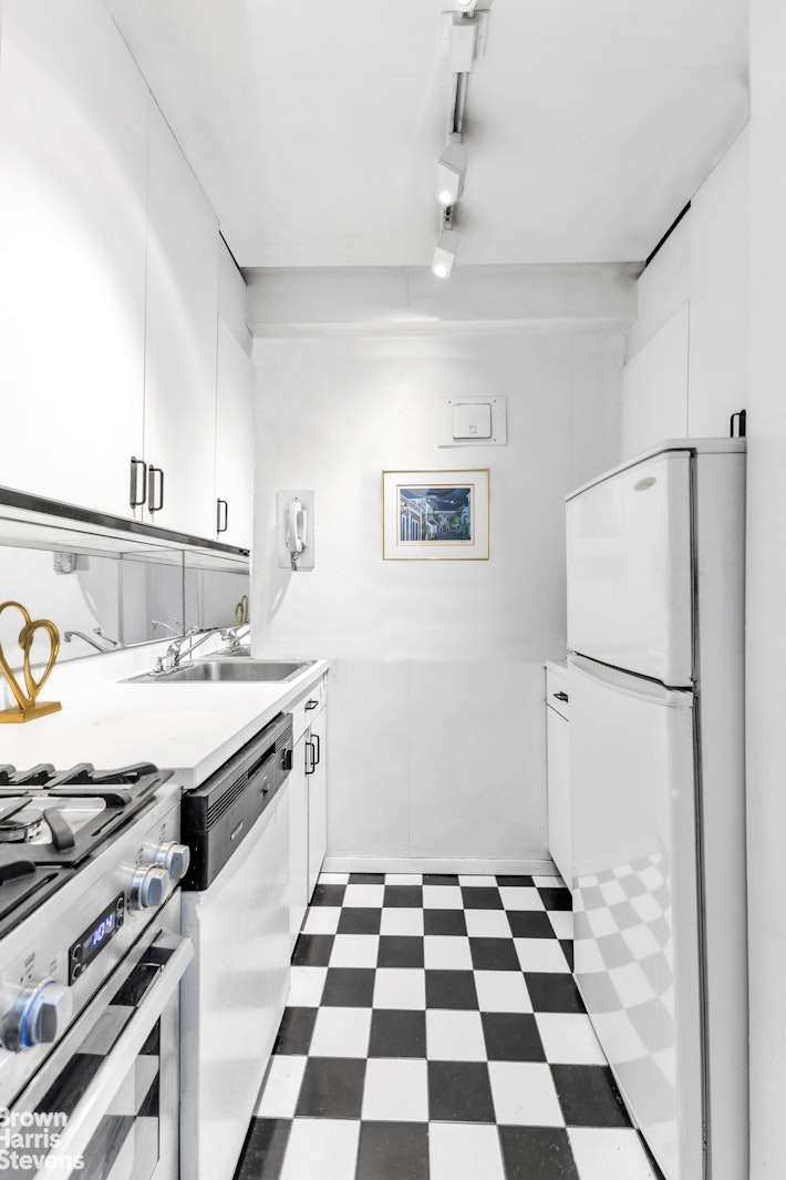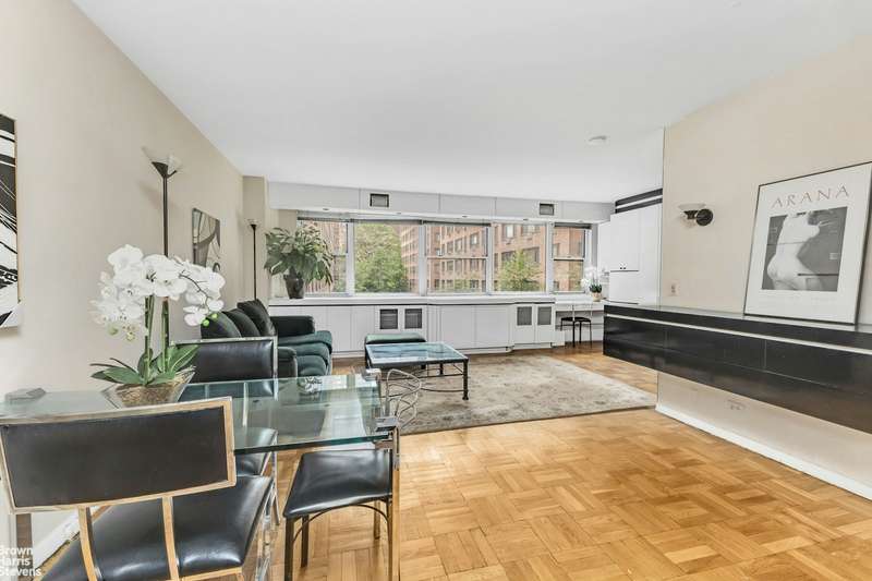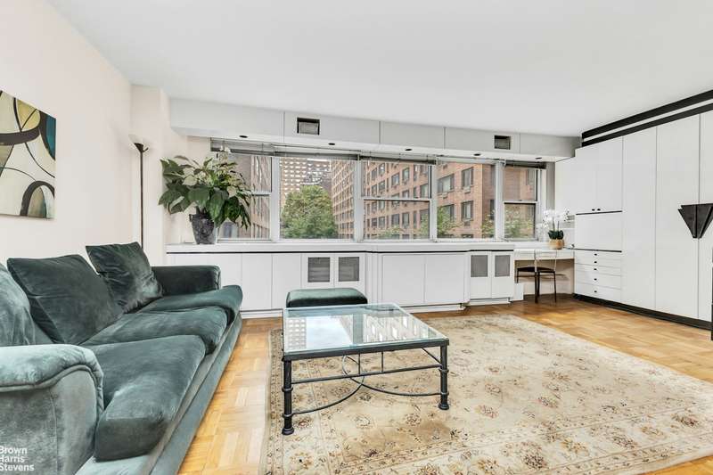 Super spacious large alcove can be closed to accommodate a large sleeping area which is actually a good sized bedroom with 2 closets and its own heating and a/c system. This lovely home or pied a terre faces west with tons of afternoon sun and a lovely view of both the sky and the building gardens below. A full-sized separate kitchen and tons of closets.