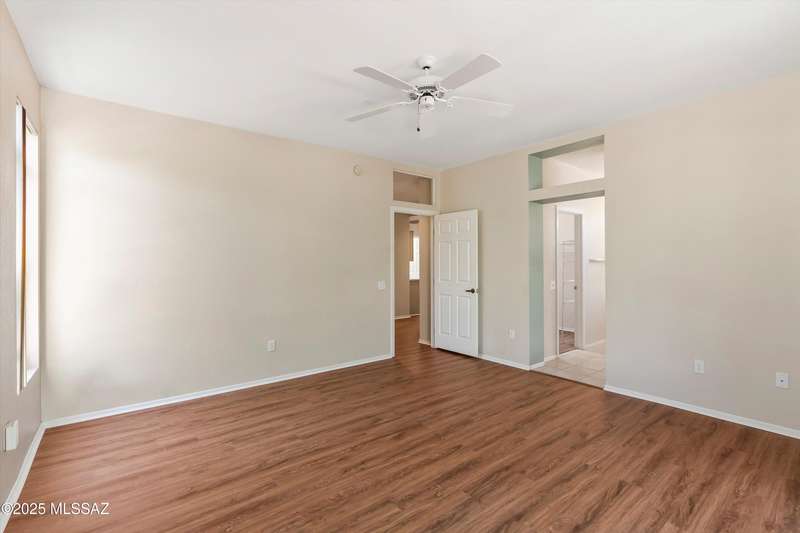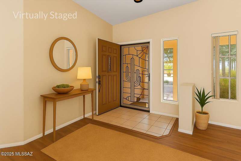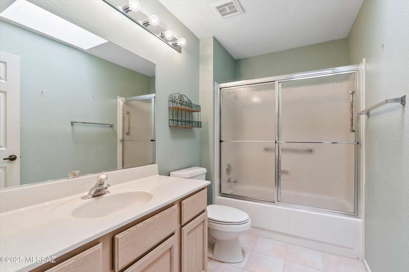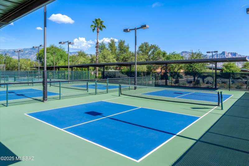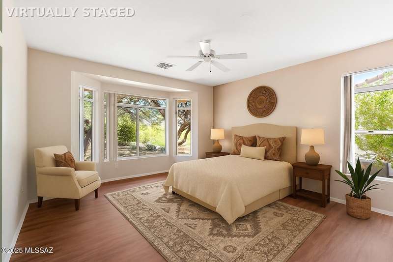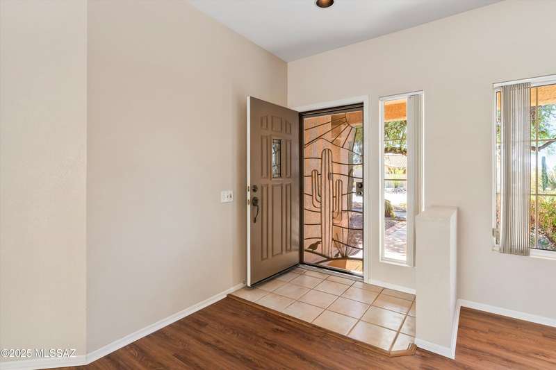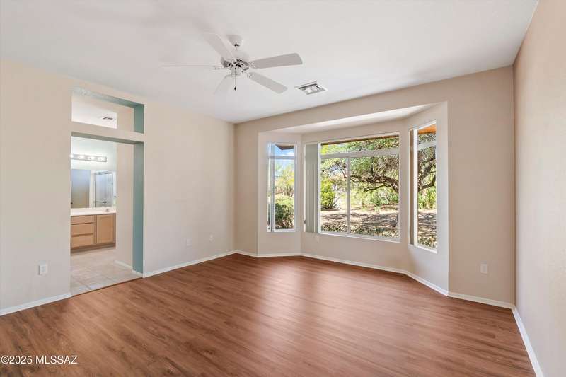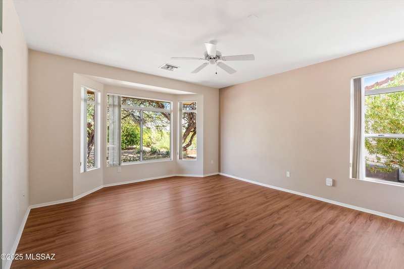 Enjoy this spacious Rio Vista Model on a large lot next to open common area with stunning Catalina Mountain views! This 1,689 sq ft home offers 2 bedrooms, 2 bathrooms, and a versatile office with built-in cabinets and a desk. Features include a gas fireplace, ceiling fans, skylights, and a new HVAC (2024) washer/dryer (2023) and water heater replaced 2020. The open kitchen has a breakfast nook with custom tile artwork and recessed lighting. The primary suite boasts a bay window and walk-in closet with a skylight. Relax on the covered patio while taking in the mountain scenery. The garage is extended and has plenty space for golf cart and storage. Newly installed Luxury Vinyl Plank in 2025. A wonderful home in a beautiful setting