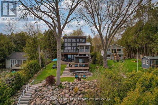 Exceptional Waterfront Retreat on Lake Simcoe! This beautifully renovated home offers 50 feet of prime Lake Simcoe frontage in one of the areas most sought-after locations. With panoramic lake views and a thoughtfully designed layout, this property perfectly blends luxury and relaxation.The main home features a stunning open-concept design with cathedral ceilings and a seamless flow from the living space to the Muskoka room, complete with a cozy fireplace and walkout to a private deck overlooking the lake. The primary bedroom boasts a spa-like ensuite and walk-in closet, offering a serene escape. A separate guest suite ensures privacy and comfort for family and friends.The lower level presents breathtaking lake views, a family sitting room, and double walkouts, enhancing the connection to lakeside living. Outside, youll find a detached bunkie for additional accommodation and a waterside storage shed, versatile for all your waterfront needs.Located just minutes from Highway 400, this property is conveniently nestled between Barrie and Orillia, offering easy access to shopping, dining, and entertainment. Situated in a popular waterfront community, this home is a rare gem for year-round living or weekend escapes! Don't miss your chance to own this slice of paradise!