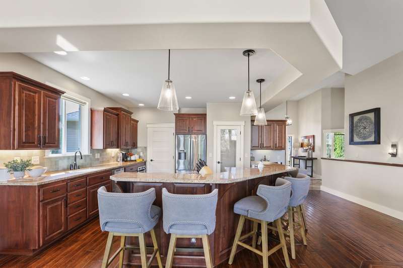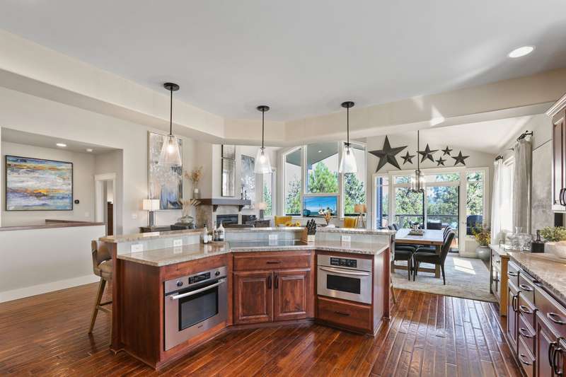 Stunning 5 bed/3 bath view daylight rancher on a secluded cul-de-sac lot in Eagle Ridge! Amazing open floorplan living with large gourmet kitchen with an island, stainless steel appliances including double ovens and new backsplash. Large primary bedroom features a cozy fireplace as well as a completely updated large primary bath with double sinks, large shower and a separate tub. Main floor also has main floor laundry with new cabinets, a den/office or use as a bedroom, large dining area, a recently remodeled 3/4 bath and a large private covered deck plumbed with gas. Full daylight basement with door to large patio with an adjacent pond with a waterfall. Basement also includes a fantastic large family/game room with a pellet stove and waterwall feature as well as 3 bedrooms, redone bath and storage. Home also has solar panels, gas FA heat with central A/C, dog run, 3 car garage, great landscaping with sprinklers and many other updates. Home sits back from the street for lots of privacy