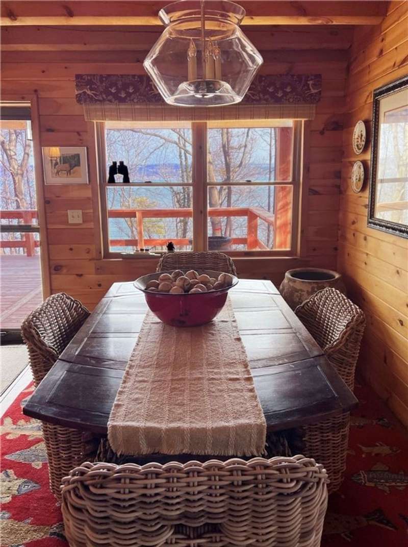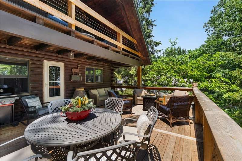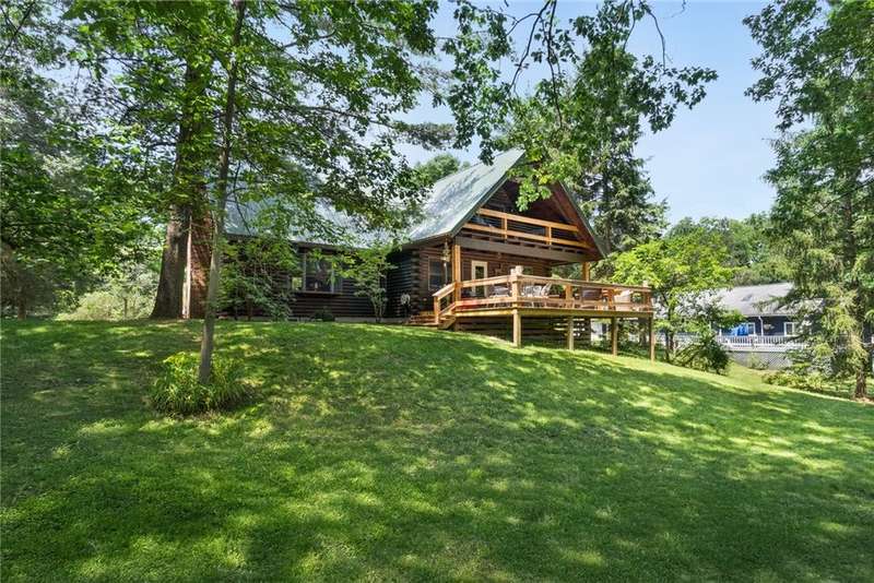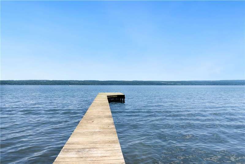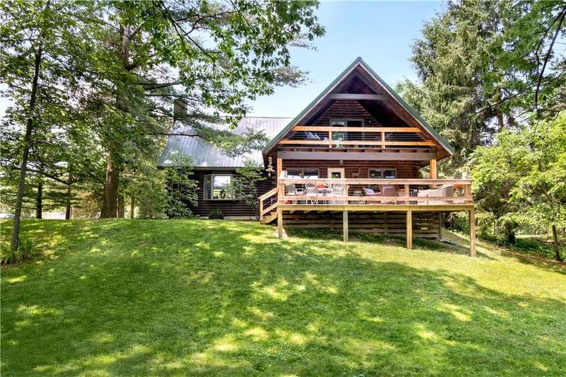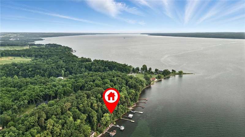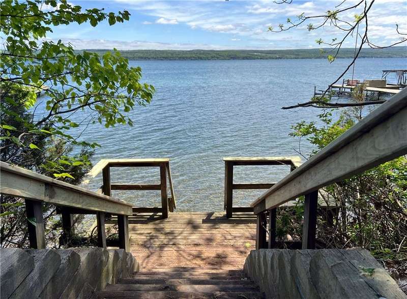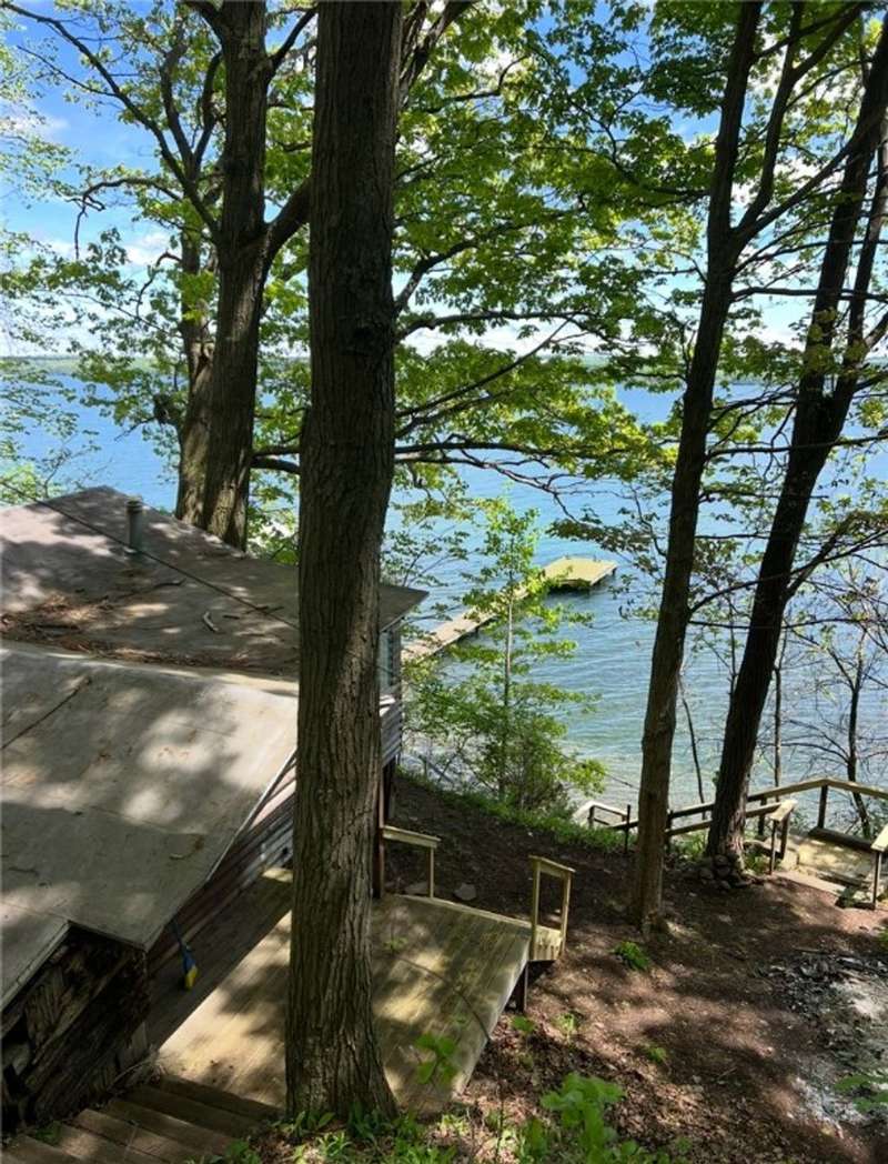 Welcome to this charming and inviting three-bedroom, two-bathroom log home, perched above the sparkling shores of Seneca Lake. Nestled on more than an acre of lush woods, this property provides exceptional privacy and an interior curated for a discerning buyer. Step inside and let the warmth of original hardwood floors, vaulted ceilings, and stunning lake-views welcome you home. The newly built, expansive deck is perfect for relaxing and entertaining friends and family while taking in panoramic views of the lake. The master suite boasts uninterrupted lake views with its very own private walk-out deck. Enjoy cooking with a full view of the lake in a spacious kitchen featuring ample counter space, a large sink, full-size appliances, and convenient access to the outdoors for grilling. A cozy second cottage at lake level offers so many possibilities?ideal for transforming into a guesthouse, art studio, or short-term rental opportunity. With 100 feet of private shoreline, the property includes a generously sized permanent dock that easily accommodates large boats, along with wide steps that lead directly to the beach. Other charming details include a detached two-car garage, generous level yard space, buried propane and utility lines that maintain the property's pristine appearance. Whether you're watching the leaves change in the fall, cozying up by the wood stove in the winter, or soaking in golden sunsets over the summer, this one-of-a-kind property offers year-round beauty and peaceful lakefront living.Log home is 1,672 sq ft, and waterside bunk house/ cottage is approx 800 sq ft.