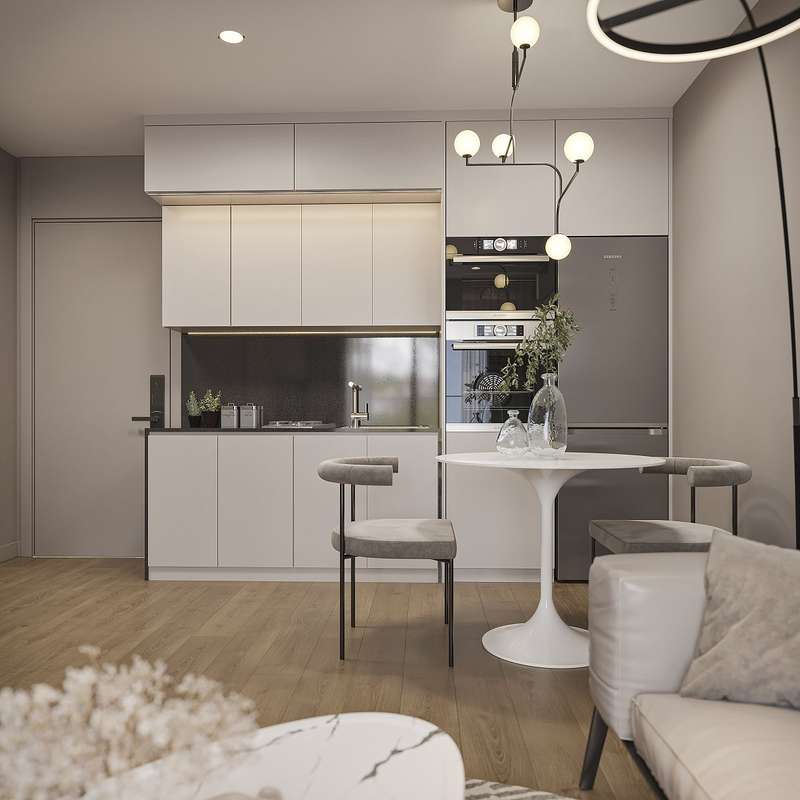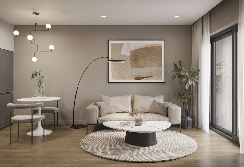 The apartments have a 1-bedroom, an open-plan kitchen, living room, bedroom, balcony, shower cabin, quality branded armatures, a steel door, ceramic and wooden floor coverings, electronic blinds, aluminum window system, natural gas heating system, air conditioning, and quality design kitchen types of equipment.