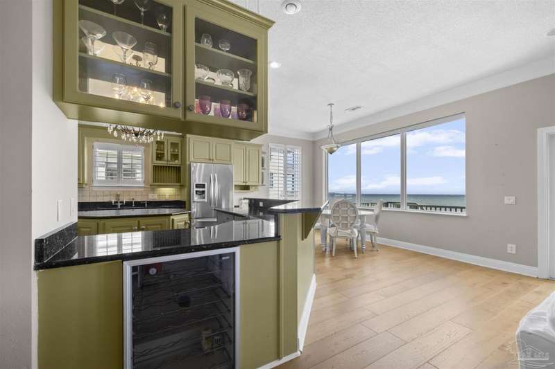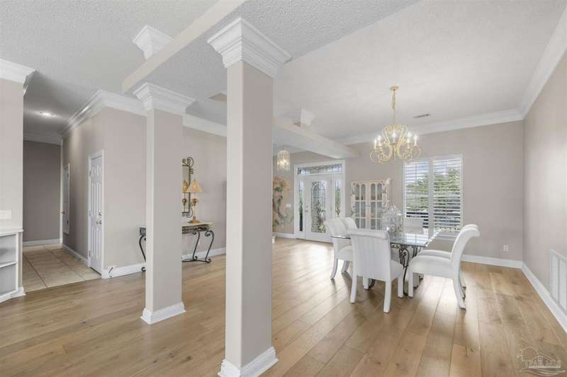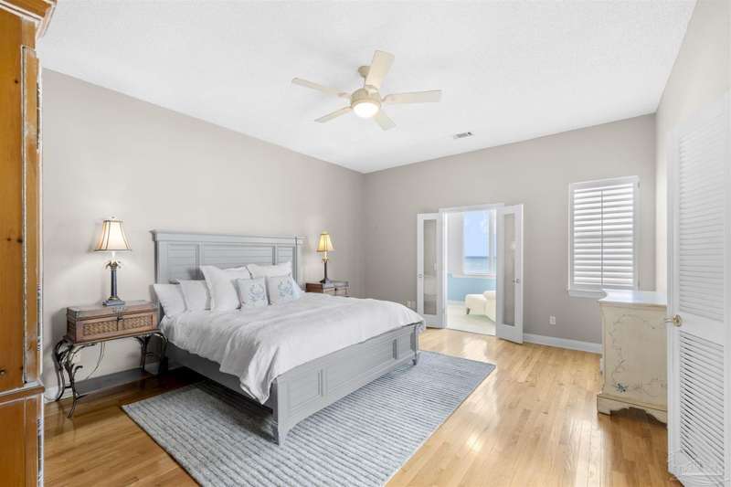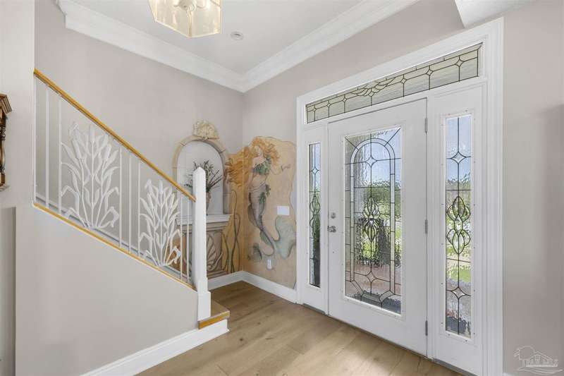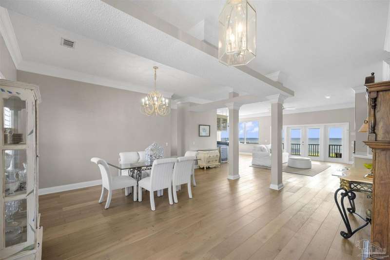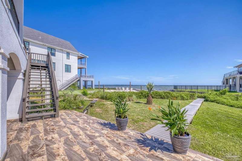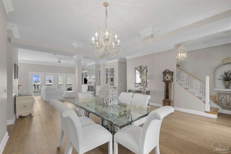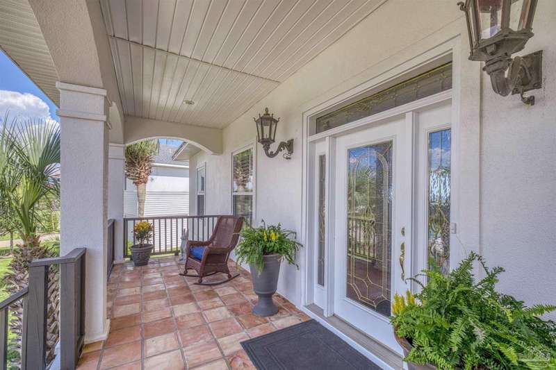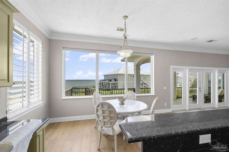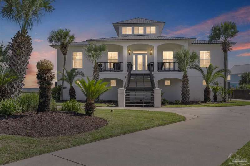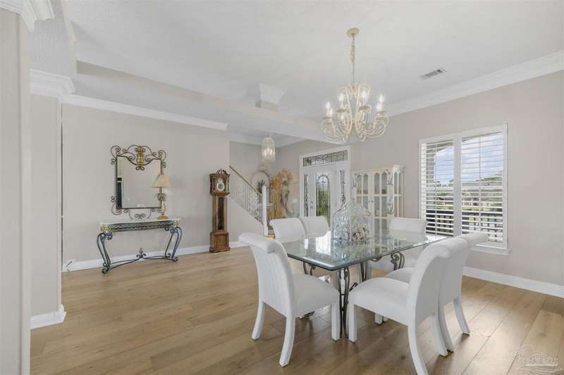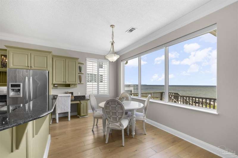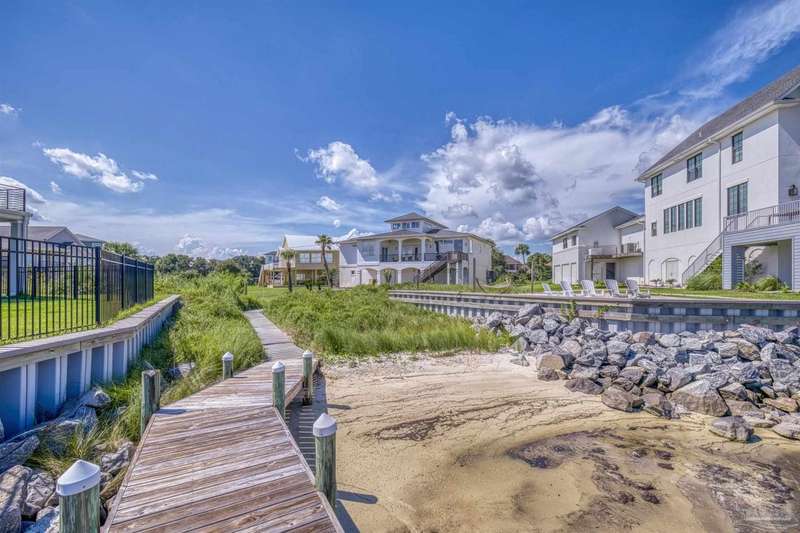 Welcome to your slice of Gulf Coast paradise-this spectacular 3-bedroom home offers graceful waterfront living with every upscale touch. Nestled in a sought-after gated neighborhood, the property boasts expansive porches with breathtaking water views, a walkway to a private beach, and your very own swimming dock, perfect for morning paddles or sunset serenity. Inside, rich oak wood floors add timeless warmth throughout. The master suite is a sanctuary of comfort with an attached sunroom or office, opening directly onto the porch overlooking the water. The spa-like bath features a double vanity, jetted tub, walk-in shower, and private water closet. The kitchen pairs form with function-granite countertops, stainless steel appliances, and a charming dumbwaiter add modern elegance. A spacious bonus room on the third floor wraps you in light with panoramic Pensacola Bay views, ideal as a media room, art studio, or peaceful hideaway. Outside, a circular drive leads to the oversized side-entry garage, offering ample space and convenience, while the durable metal roof completes the picture of longevity and coastal resilience. With its captivating views, thoughtful layout, and premium finishes, this home is your gateway to tranquil waterfront living. Schedule your private tour and experience Windrose Circle for yourself.