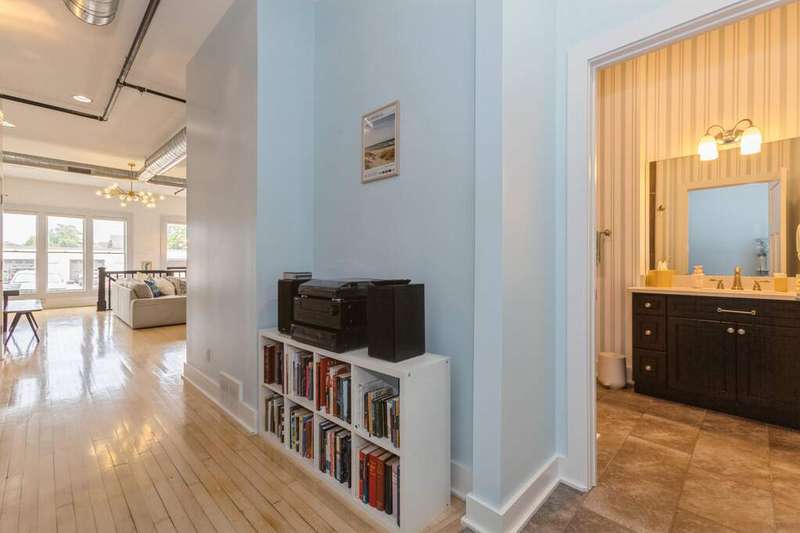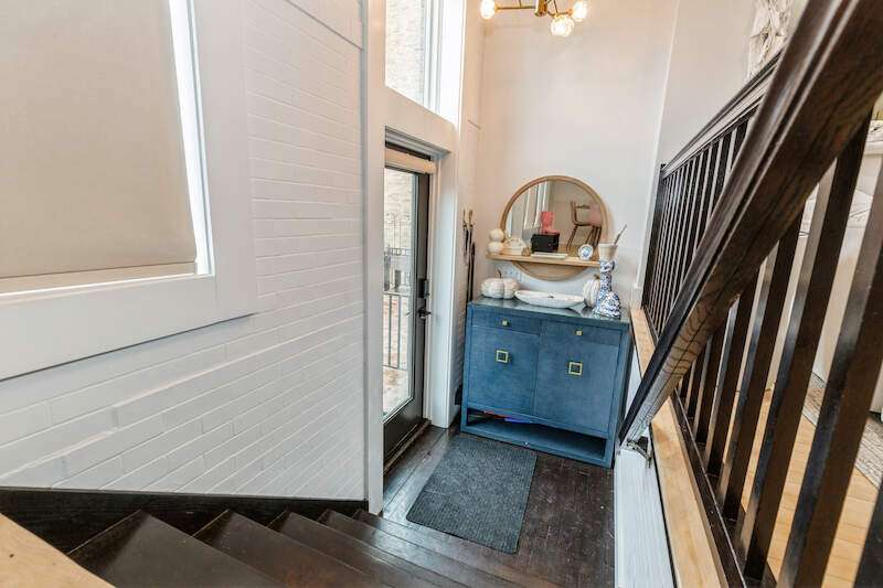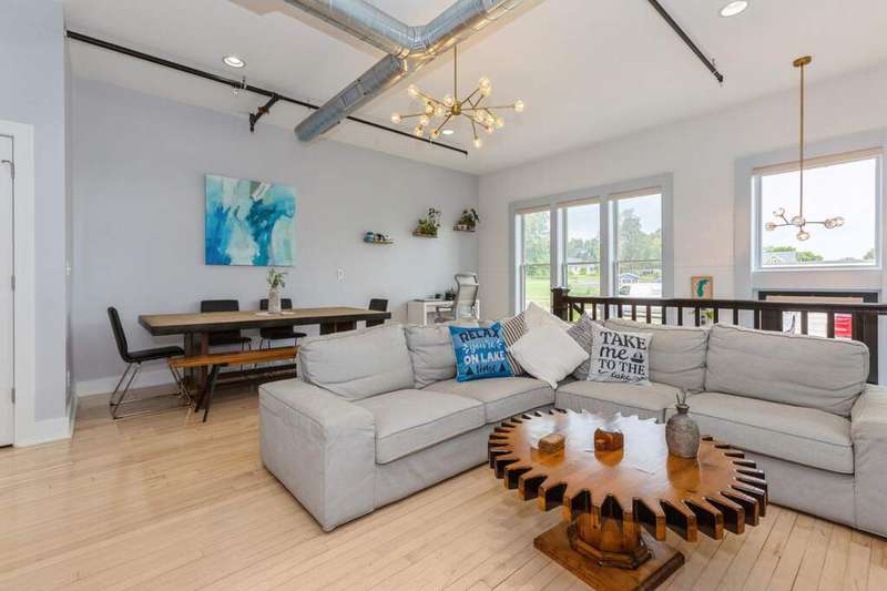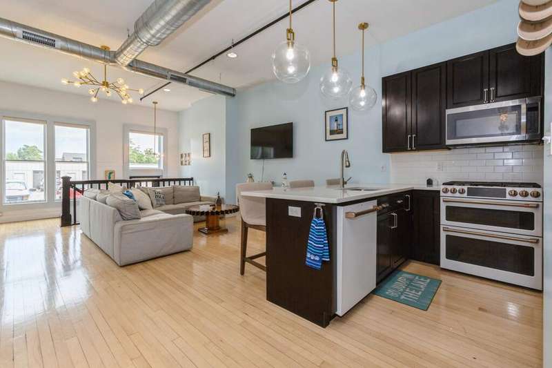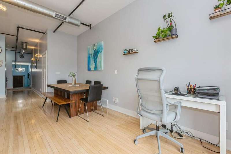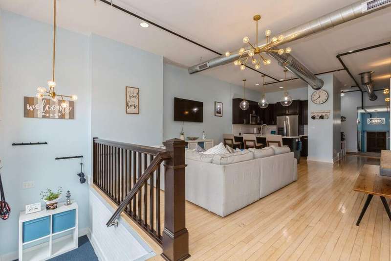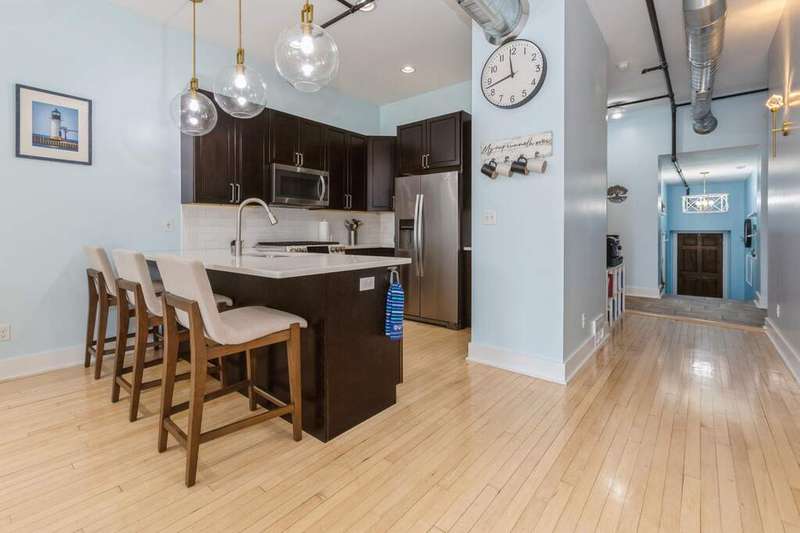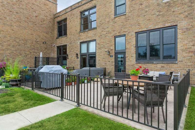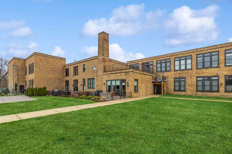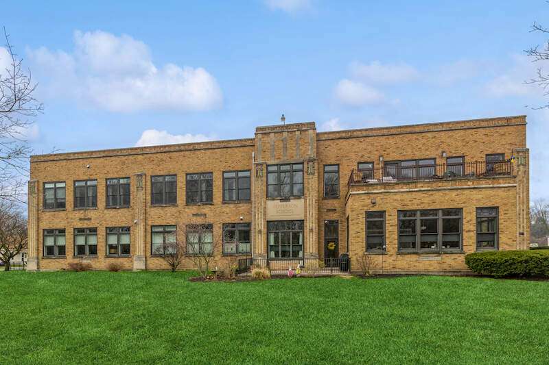 Don't miss the opportunity to own a piece of history with this two-story condo in the Jefferson School Lofts! This large unit is over 1600sq ft and is the perfect combination of modern convenience and original charm with exposed brick, 12ft ceilings, open floor plan, and the only condo with the original oak gym floors from the 1930's. Recent updates include new paint, wall paper accents, premium kitchen appliances, quartz countertops, and custom cabinets. The main floor also has a full bath and welcoming foyer. The second floor features a premium primary suite with dual vanity and large tile shower. There is also laundry and an additional bedroom/office. The exterior features of the condo includes a large paver patio, designated parking space plus a 1 car garage with additional storage. The association amenities include updated fitness room, covered picnic area and fence enclosed dog park. All of this near downtown, and only a 3 block walk to beautiful Lake Michigan sunsets!