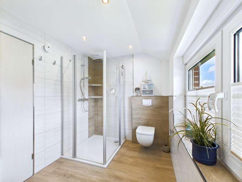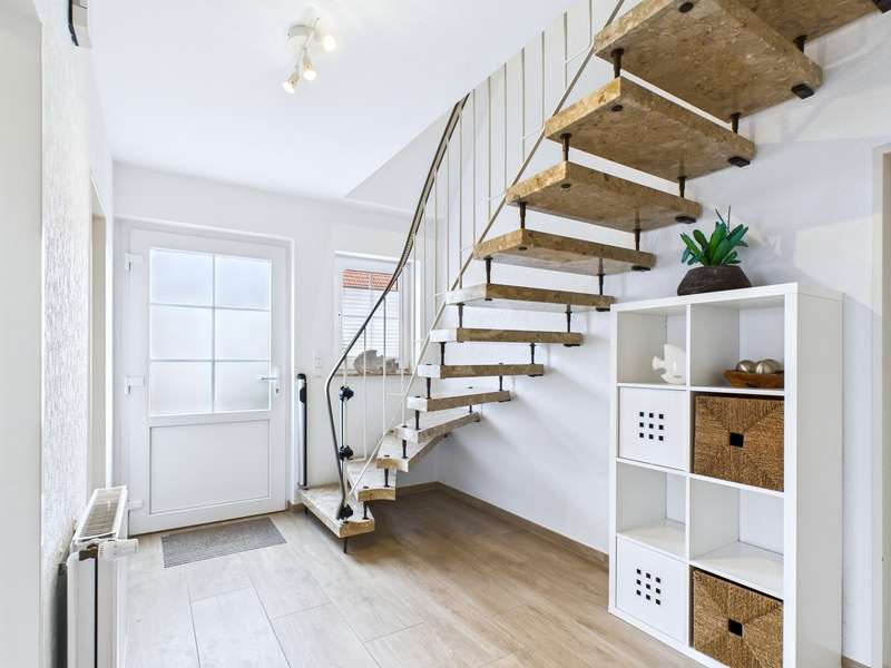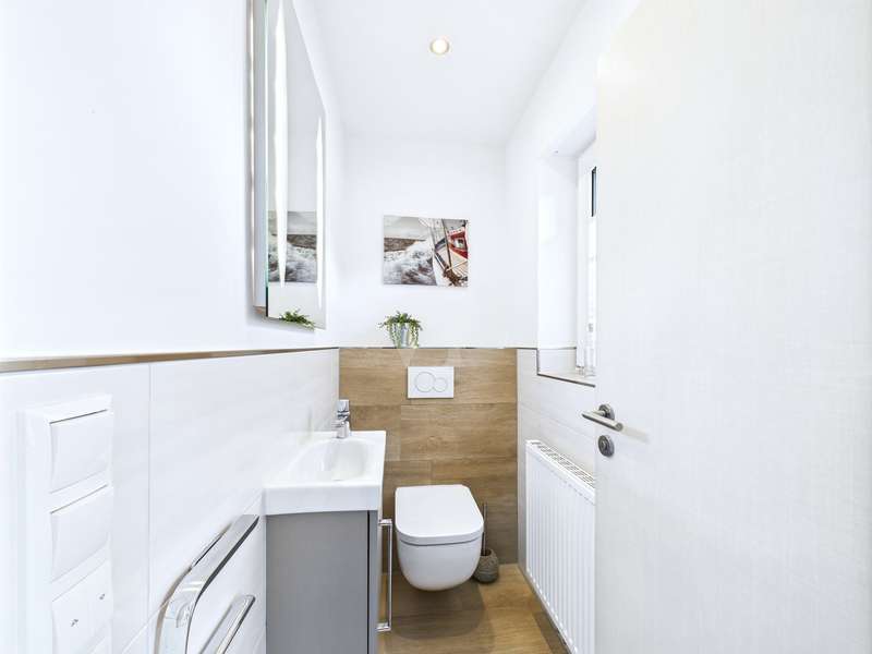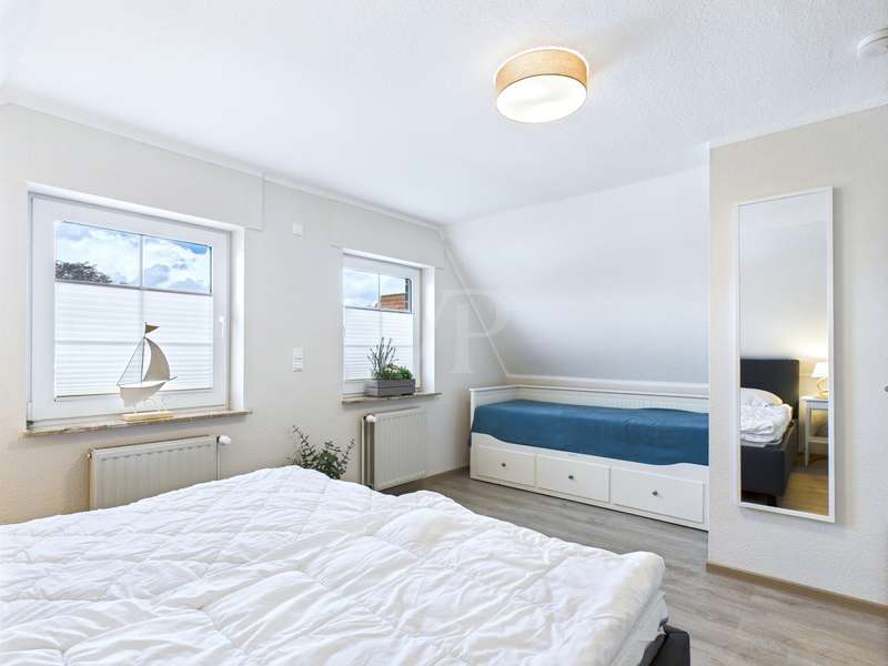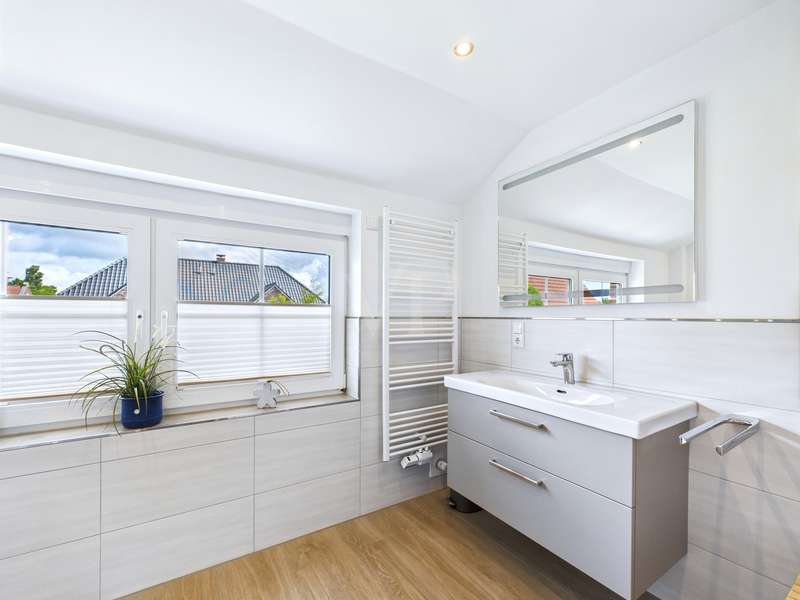This modernized detached house is characterized by a well thought-out room layout and high-quality furnishings. With a living space of around 90 m² and a plot area of approx. 303 m², this detached house from 1989 offers enough space for comfortable living. The house was last extensively modernized in 2023. The modernization measures included the renovation of the two bedrooms as well as the garage and the shed. The entire interior, including both bathrooms, the kitchen, the living room, the hallway, the utility room and the garden, underwent a thorough renovation back in 2021. Also worth mentioning is the renovation of the heating system in 2012, which now includes a combination of central and underfloor heating. The house is distributed over a total of 3 rooms, including two bedrooms and two bathrooms. The bathrooms were completely renovated in 2021 and now offer modern comforts. The upper bathroom is also equipped with underfloor heating. The new kitchen is dominated by wood-look tiles, the walls are covered with fiberglass wallpaper and freshly painted. Electric shutters and custom-made pleated blinds complete the overall picture. The living room also received a new coat of paint as part of the refurbishment, as well as new curtains and made-to-measure pleated blinds. The hallway and utility room were renovated with new flooring and freshly painted walls. The utility room was also fitted with built-in cupboards. The entire electrical system (including RCDs) was replaced in 2021. All front doors and interior doors were also replaced. The attic has a new slide-in staircase with maximum insulation level. Outside, both terraces were redesigned in 2021 and a drainage system was installed around the house to ensure effective water drainage. The bedrooms, completely modernized in 2023, present themselves with smoothed walls, new wallpaper and paint, as well as a robust and easy-care vinyl floor suitable for wet areas. The furnishings include new furniture, including a pull-out bunk bed, as well as white wooden cribs and custom-made pleated blinds. The garage and shed were given a completely new roof, including the roof beams. These measures provide reliable protection for the stored items. The quality of the fittings is very modern, which underlines the comfort and functionality of the house. Thanks to the extensive modernization work carried out, this property offers an appealing living experience and is ready for immediate occupancy. Come and see the advantages of this house for yourself. You are cordially invited to take a closer look at this attractive offer during a viewing. Arrange a viewing appointment today. We look forward to your inquiry.