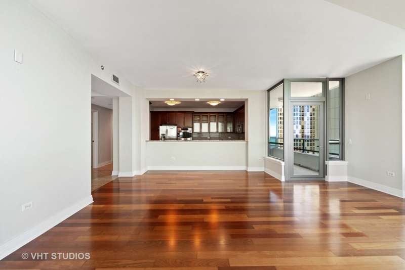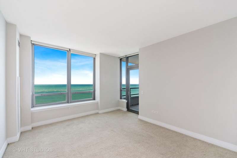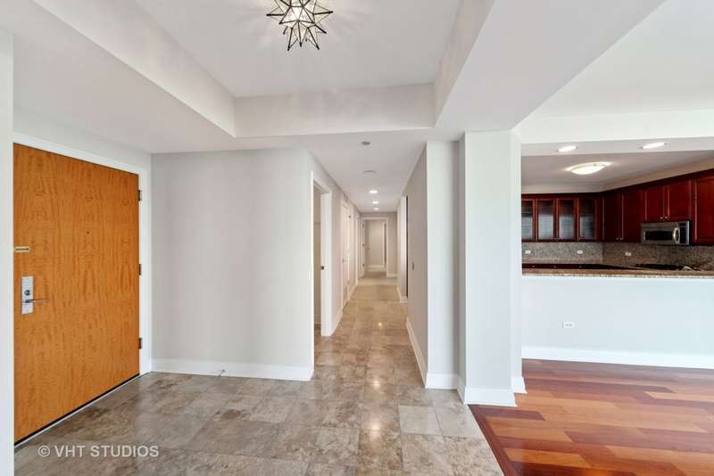 Greeted by a large open foyer dressed in travertine, with wonderful unobstructed views of Lake Michigan, the boats and ever popular Playpen. 4 natural cherry hardwood floors, Signature Belgravia tiered baseboards and moldings. Enormous walk in closet for bulk kitchen storage. Side by side LG Tromm Steam front load washer and dryer. A four person + kitchen with plenty of counter space for food prep and food display at holiday time. Raised bar for seating. Open kitchen to living and dining areas,. Upgraded GE Profile stainless steel appliances, Refrigerator with ice/water dispenser. Double oven. Overhead microwave and cooktop. Brookhaven Mahogany cabinetry with elegant crown and tumbled glass panes, rounded edge granite counters. Dry bar off living room with rounded granite. 2540 square foot true three bedroom split floor plan with 3.1 bathrooms. Third bedroom with views of Oak Street Beach, Olive Park and Navy Pier. Third bath dressed in consistent travertine, raised vanity, honed travertine counter All Kohler plumbing fixtures and large shower. Second full bath in travertine. Large balcony for at least a four top comfortably accessible from living room and second bedroom looking north up LSD, Lake Michigan and North Avenue Beach. Master suite with his and hers walk in closets, separate soaking tub and large shower. Bathroom is dressed in natural marble all light wood vanities and honed travertine counters. Roller shades throughout. Full amenities include 24 hour doorstaff, onsite management and maintenance, two roof top decks, party/lounge rooms and full kitchens. State of the art gym WITH NEW PILATES REFORMER AND GOLF SIMULATOR. Dry cleaners. Two garage side by side parking spaces (P536, P537) are $50,000 each. A third parking space can be purchased. Asking price is $50,000. FOUR PIPE HEATING AND COOLING SYSTEM.