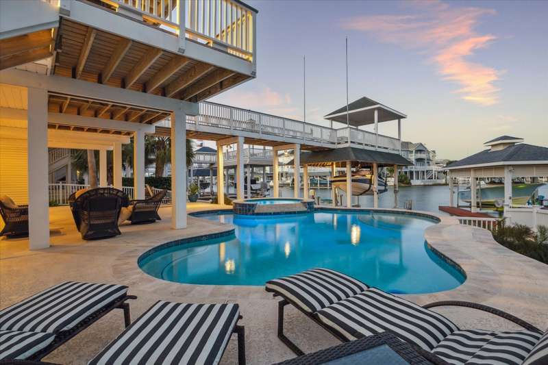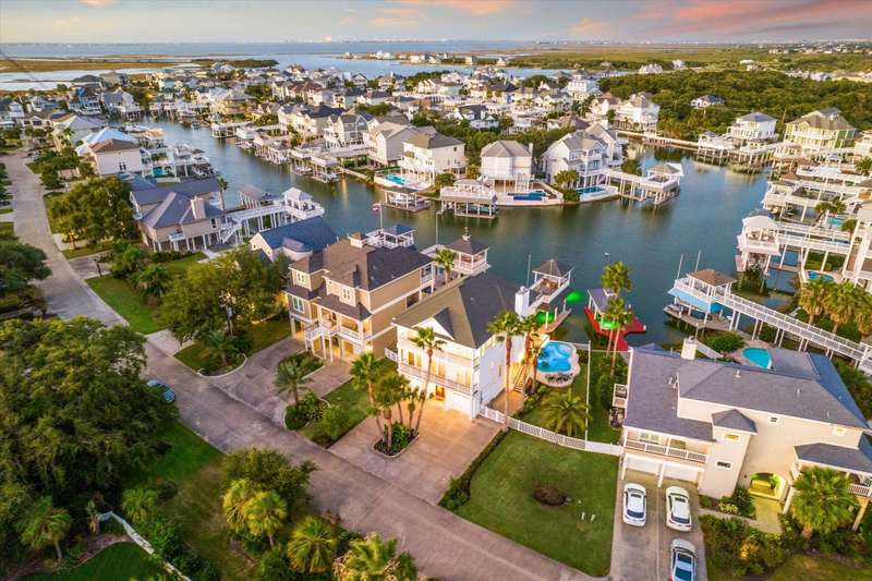 Welcome to your dream retreat in prestigious Laffites Cove, Galveston, where luxury meets coastal living. This beautifully updated home on a wide oxbow offers breathtaking views & southerly breezes, w/glimpses of Galveston Bay. Inside, 1” solid hardwood floors flow throughout spacious open plan, featuring 4 generous bedrooms, each w/its own ensuite bath, ensuring comfort & privacy. The gourmet kitchen is perfect for culinary enthusiasts, while the outdoor oasis including pool & spa invites relaxation & entertaining amidst beautifully landscaped grounds. Elevator capable to all 3 floors. This prime location is at the highest elevation in Laffites “The Ridge”. Located near the Galveston Country Club w/all its amenities & a golf cart ride to Pirates popular beaches, this exquisite property is the perfect blend of elegance & coastal charm. Social membership to Galveston Country Club transfers w/property. Don’t miss your chance to call this luxurious home your own! All info per Seller.