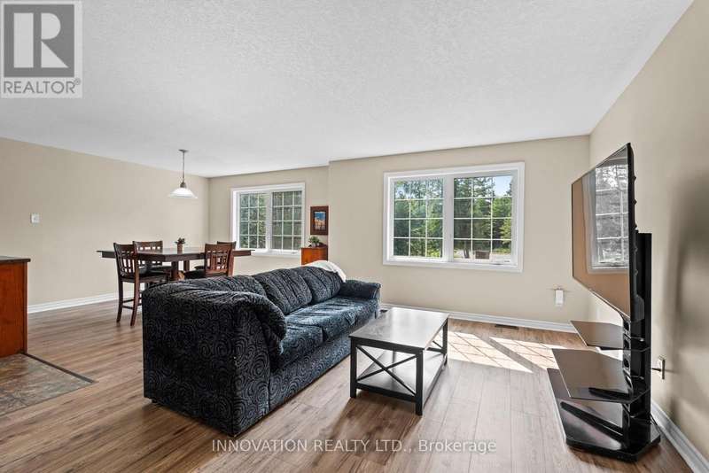 Peace and tranquility on nearly four acres of Montague beauty! This high-ranch home has FIVE bedrooms, including two primary suites, making it perfect for larger families, multigenerational living, or working from home. Walk in to a breezeway with direct access to the attached garage and back yard. The open main level features a large living room, dining room and kitchen, all bathed in natural light. Freshly painted with new laminate flooring throughout, there are three spacious bedrooms, including a primary with 4-piece en-suite, and another 4-piece main bath. On the lower level is another large primary suite with walk-in closet and 4-piece en-suite, a huge rec room, and a fifth bedroom. Lower level also has a wood burning stove to keep the house cozy and warm all winter. Outside you'll find your own private wilderness with gardens, forest, and plenty of space for recreation. Get on the ATV and snowmobile for year-round fun. There is a fire pit for socializing any time of year, a play structure for the kids, and even a three-storey tree house! Nestled between Carleton Place and Smiths Falls and with an easy commute to Stittsville, Kanata, and Ottawa, you can have your private rural retreat within reach of the city. (id:6509)