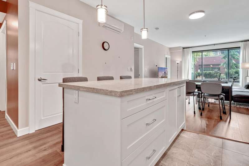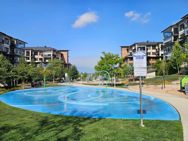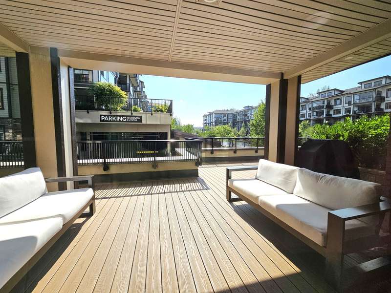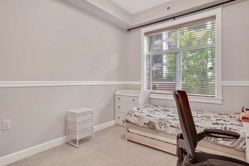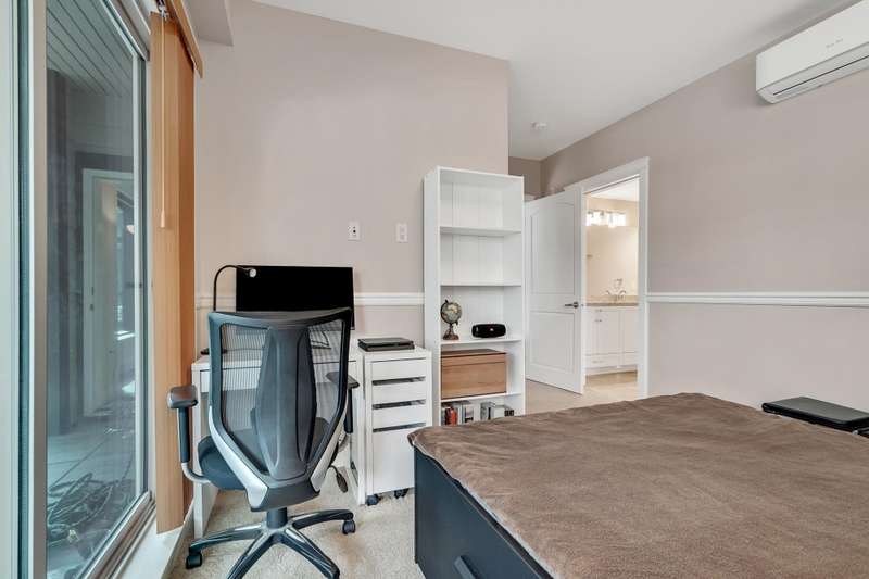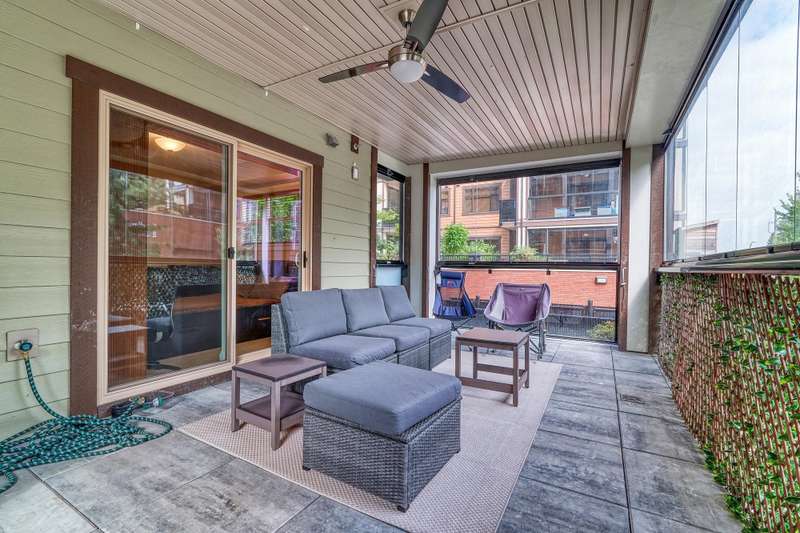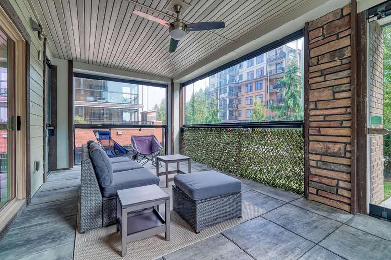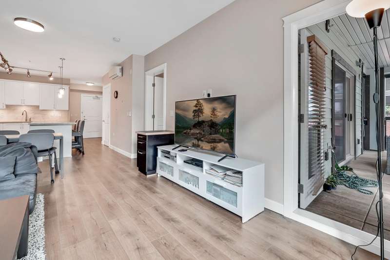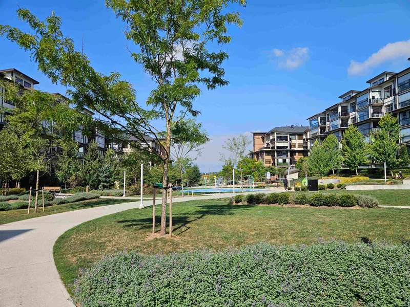 Yorkson Park Central! Large 1,129 SqFt 3 bed, 2 bath, northeast corner, and ground floor unit. The gourmet kitchen comes with stainless appliances, including gas cooktop, quartz countertops, and ample cabinet spaces. Your comfort living with energy efficiency heat-pump heating and cooling for all rooms and floor heating for bathrooms. Open concept indoor living space and all year round glass-enclosed 261 SqFt solarium with gas hookup. Two side by side parking and storage locker next to the parking. The well-run building comes with fitness, lounge, children's playroom, and playground. Great location with steps to Carvolth Park & Ride and easy access to Hwy 1, shopping, restaurants, and parks. School catchment: Willoughby Elementary, Yorkson Creek Middle, and R.E. Mountain Secondary.