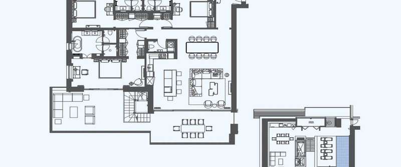 The penthouse has a fully equipped kitchen, but it can also be purchased fully furnished. Inspired by the allure of the Italian Riviera, the interior design combines modern comfort with a touch of refined elegance. Landscaped terraces complement the living spaces, creating a harmonious and abundant Mediterranean retreat. High ceilings and retractable glass doors usher in great natural light, creating a bright and airy ambiance. The expansive terraces offer endless opportunities for outdoor relaxation and entertainment.