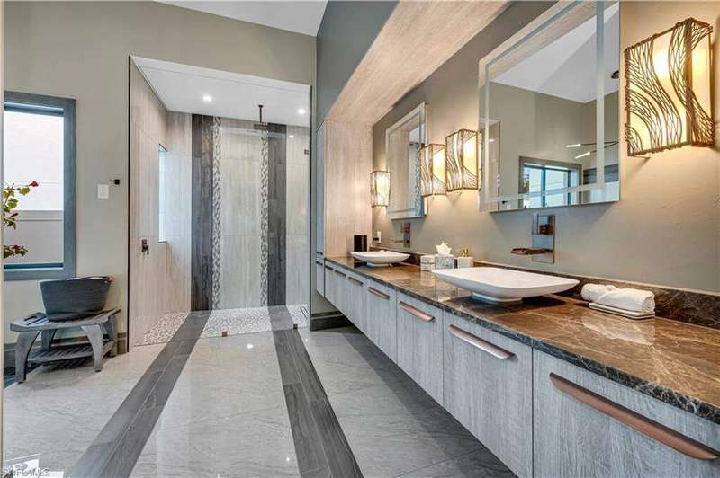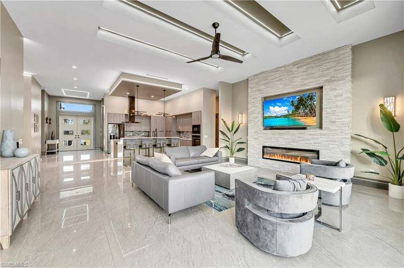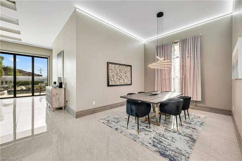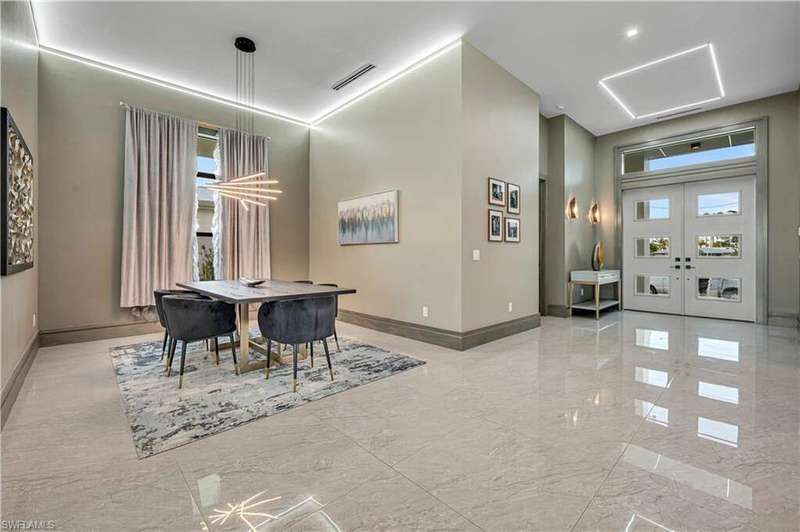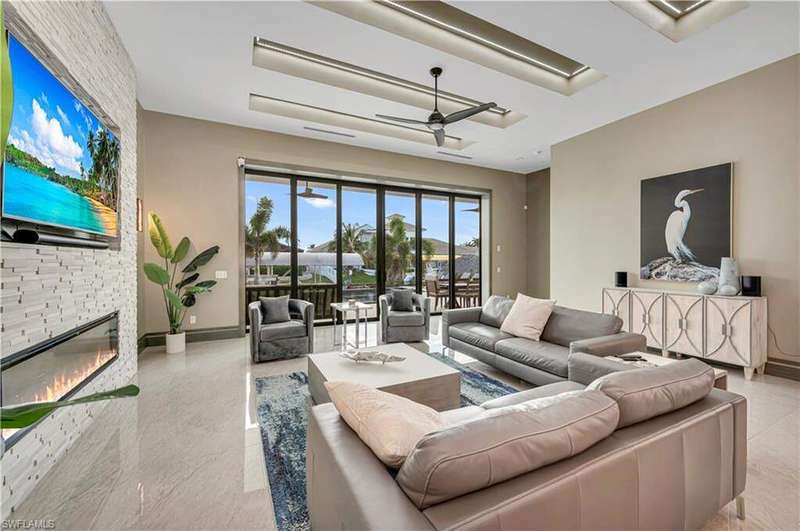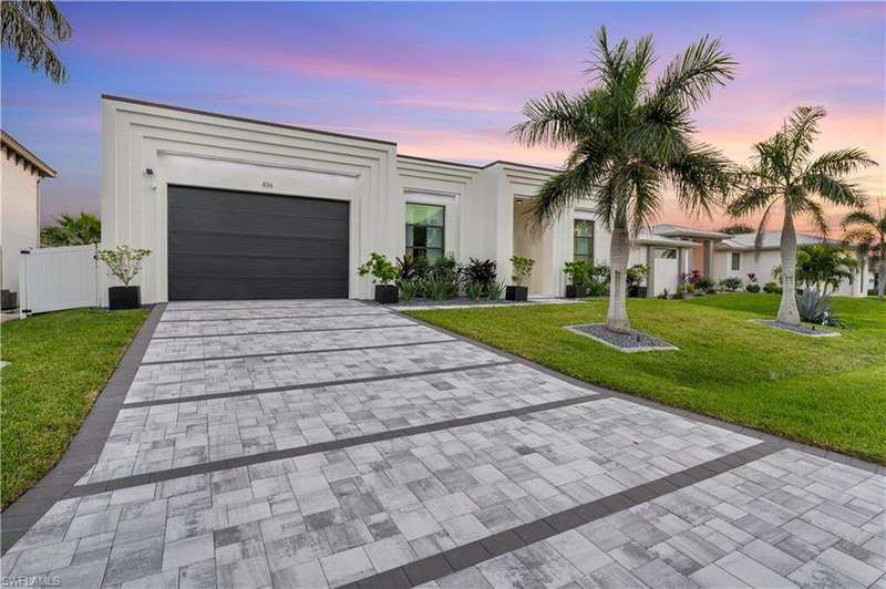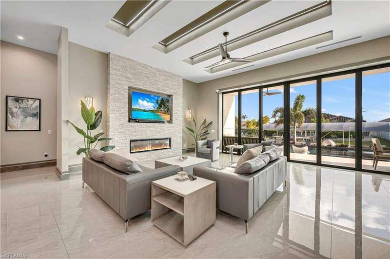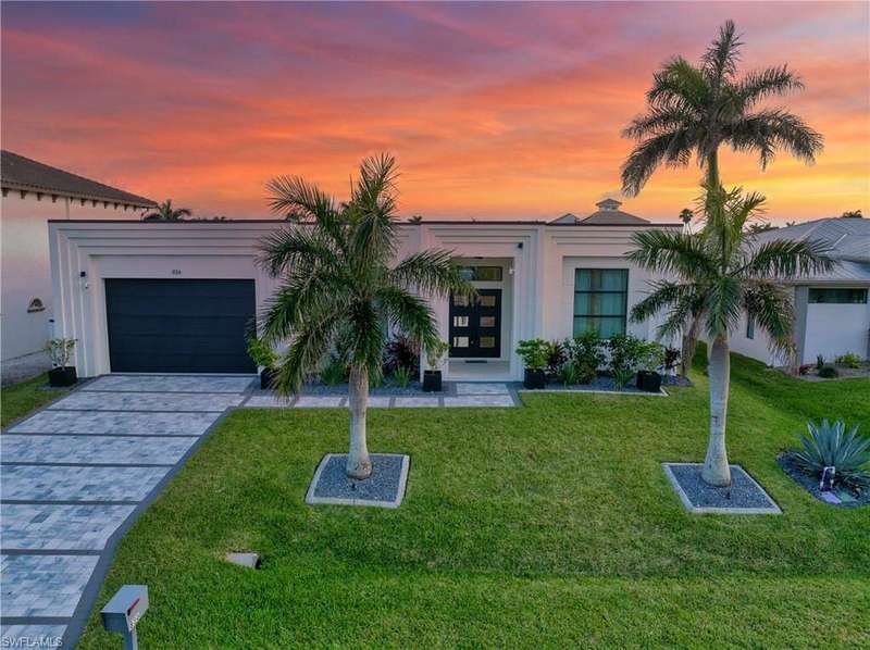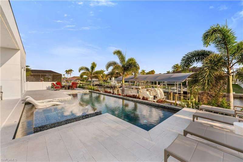 Nestled in the prestigious Yacht Club neighborhood, this 2021-built waterfront residence combines sleek modern design with the relaxed elegance of coastal living. With direct Gulf access and a private dock, it offers the ultimate lifestyle for boating enthusiasts and those who love the water. Step inside to soaring 13-foot coffered ceilings, walls of glass, and an open-concept floor plan that fills the home with natural light. The layout features 3 bedrooms plus a den, designed with both comfort and sophistication in mind. The primary suite is a serene retreat, showcasing sweeping water views, a sitting area, and a spa-like bath with floating vanities, a freestanding soaking tub, and a walk-in shower. Two guest suites open to a private deck-an inviting spot to enjoy sunrise over the water. Indoor and outdoor living flow seamlessly together with pocketing glass doors leading to the expansive lanai. Outfitted with coffered ceilings, stylish lighting, and generous lounging and dining areas, this space frames the resort-style pool and spa beyond. Custom water features, a sun shelf, and lush tropical landscaping complete the private outdoor oasis. A newly built dock with boat lift makes heading out for a day on the water effortless, while the large dock area also doubles as an entertainment space perfect for evening cocktails or family gatherings. Highlights include: gourmet kitchen with dual waterfall islands, custom cabinetry & designer fixtures, resort-style pool & spa with water features and sun shelf, expansive lanai for dining & entertaining, southern exposure for year-round sunshine and stunning views, meticulous hardscape & landscaping for a polished tropical setting. This residence is more than a home-it's a statement of luxury, designed for those who want the very best in Cape Coral waterfront living.