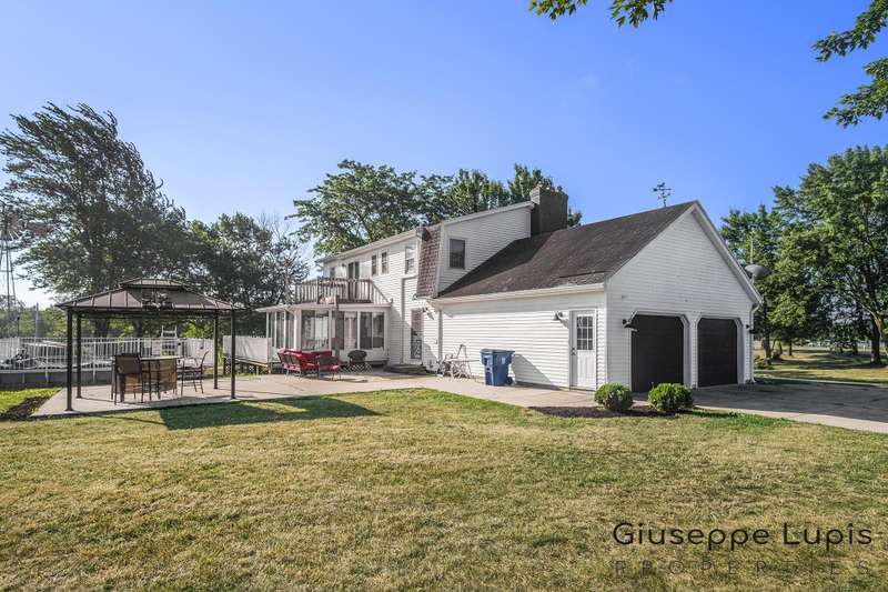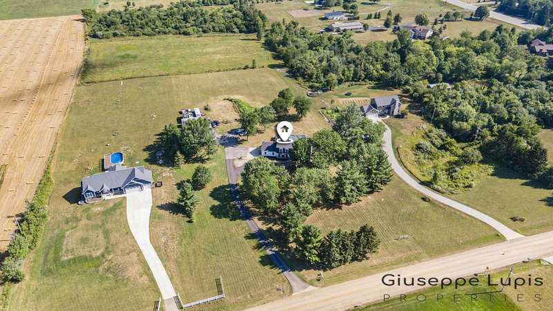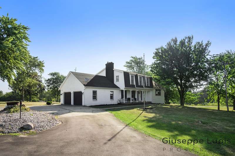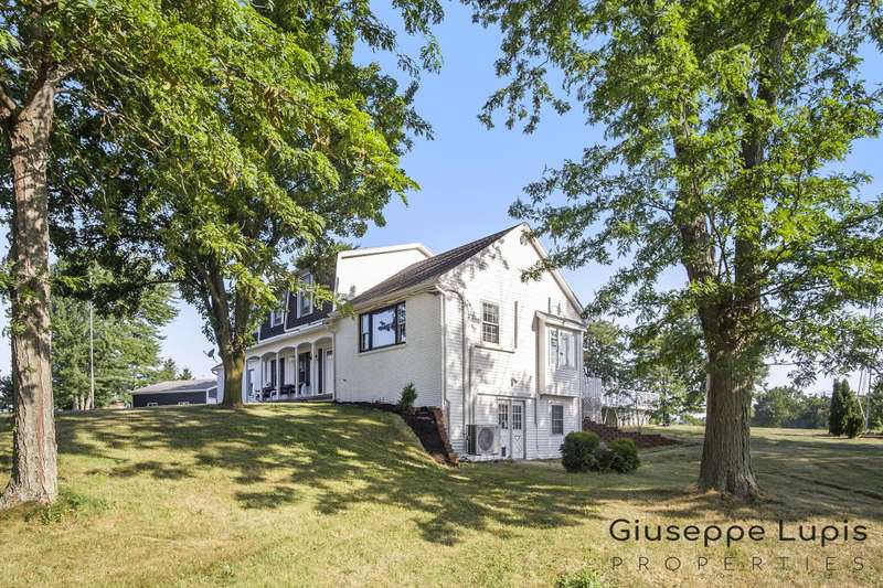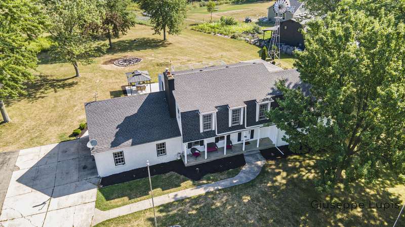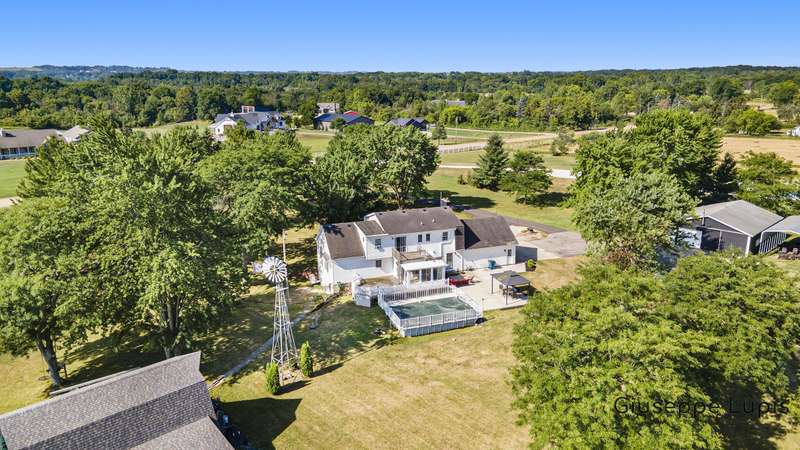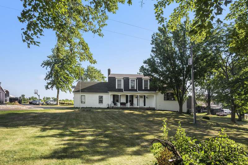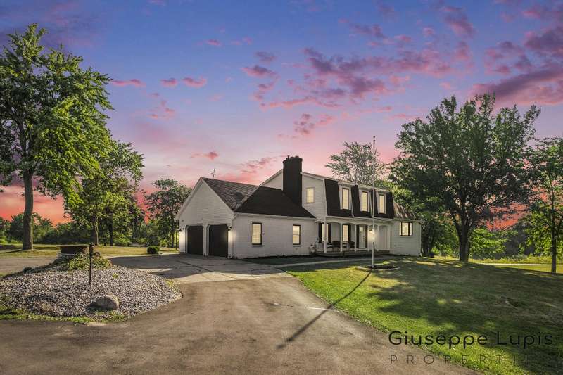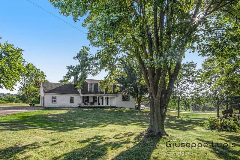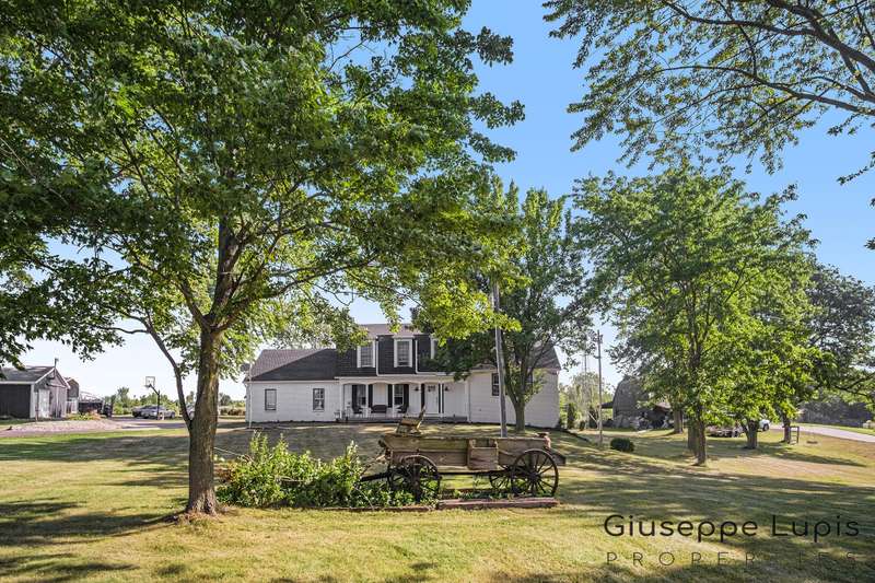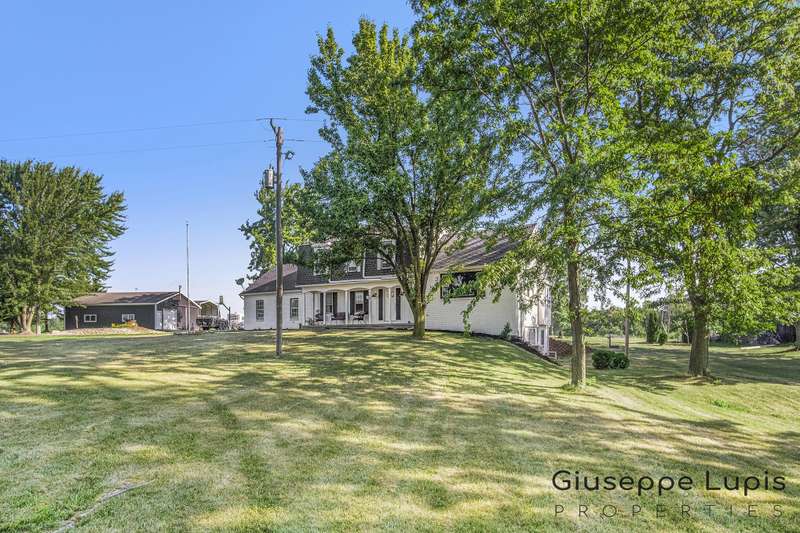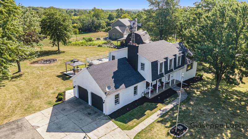 Nestled on a scenic 3.59-acre lot, this one-of-a-kind two-story home blends charm, functionality, and wide-open potential. Positioned near the center of the property, it offers privacy with a wooded front and a sunny, open backyard. Inside: 4 bedrooms upstairs, 2.5 baths, vaulted-ceiling living room, and a second main-floor space with a brick fireplace-ideal as an office or 5th bedroom. New carpet and vinyl flooring in most areas. Five new mini-splits provide efficient comfort. A three-season porch adds peaceful living space. Outside: 2-stall garage, large pole barn, two open sheds, vintage windmill, and a pool ready for a new liner. The freshly repaved driveway and generous yard make this a rare find!