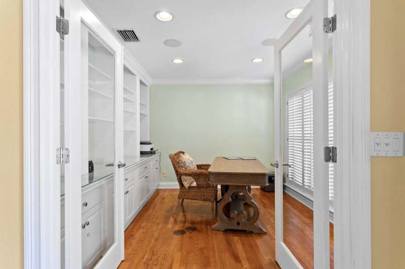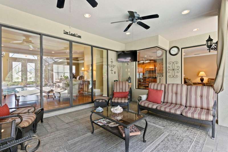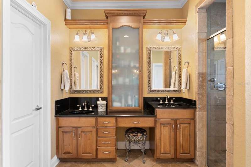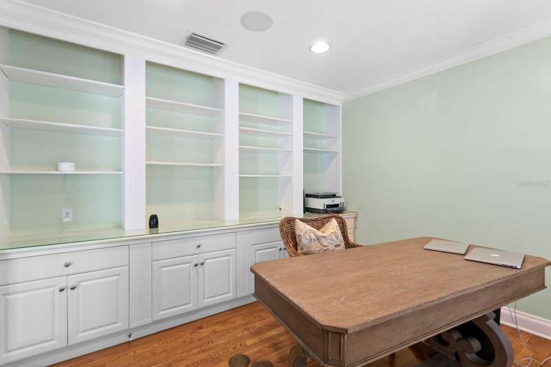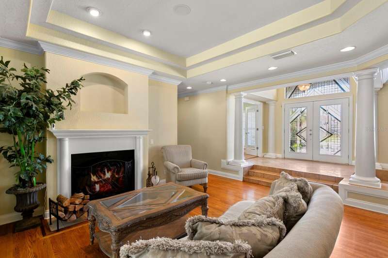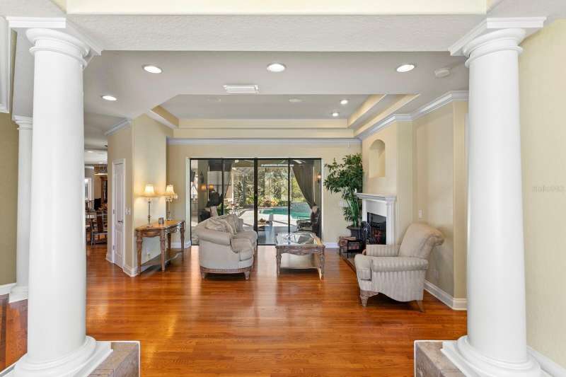 Located in the prestigious manned and guard-gated community of Cory Lake Isles, this northwest-facing, one-of-a-kind custom estate sits on an oversized homesite with private conservation views. From the moment you arrive, the curb appeal is undeniable—an impressive winding pavered driveway leads to a charming courtyard entry and stately double-door foyer. Inside, you’ll find 5 bedrooms, 5 bathrooms, a private office, and a large bonus room, all showcasing custom craftsmanship and rich finishes. The grand foyer sets the tone with soaring scale, column accents, and wood floors that flow through most of the home. The office features plantation shutters, built-ins, and elegant wood flooring, while the formal spaces impress with crown molding, a coffered ceiling, wet bar, built-in hutch, and a wood-burning dual fireplace that is featured in both the living room and primary bedroom. The primary suite is a true retreat with wood floors, and a spa-inspired bath featuring tumbled marble flooring, walk-in closet, detailed tile accents, and custom maple cabinetry. The gourmet kitchen is designed for entertaining with stainless steel appliances, double ovens, maple cabinetry, granite countertops, and an oversized island workstation. The split floor plan ensures privacy, placing the primary suite near the formal areas, two bedrooms near the kitchen and family room, and two more bedrooms toward the rear of the home. The family room highlights wood floors, custom built-ins, and pocket sliding glass doors opening to the outdoor living space. Upstairs, the oversized bonus room offers a full bath and kitchenette with refrigerator, sink, and microwave—perfect as a media room, guest quarters, or in-law suite. The outdoor oasis is extraordinary, with a full outdoor kitchen, large covered lanai, heated spa, cascading waterfall, fire pit seating area, and extended pavered patio, all surrounded by lush landscaping. Cory Lake Isles is more than a neighborhood—it’s a lifestyle. Residents enjoy a 165-acre ski lake for boating, fishing, and water sports, along with resort-style amenities including a waterfront beach club, fitness center, playgrounds, parks, tennis and pickleball courts, and a community pool. This rare estate offers luxury living inside and out, with the best of Tampa’s premier gated lakefront community. Welcome Home!