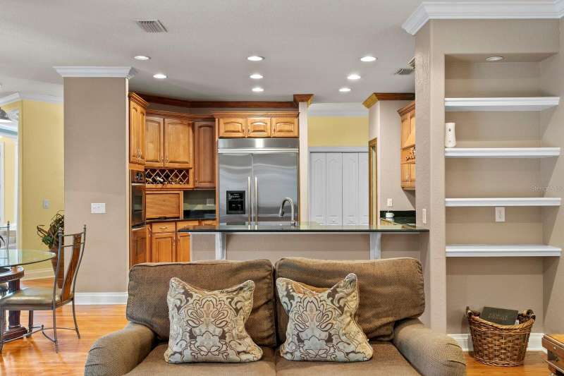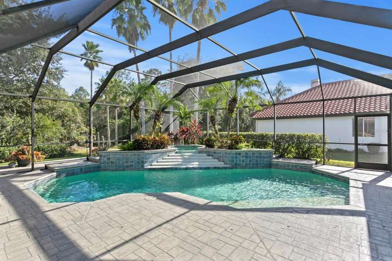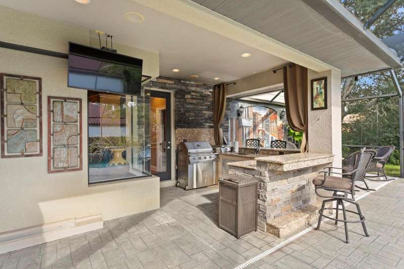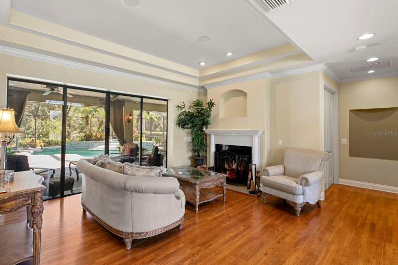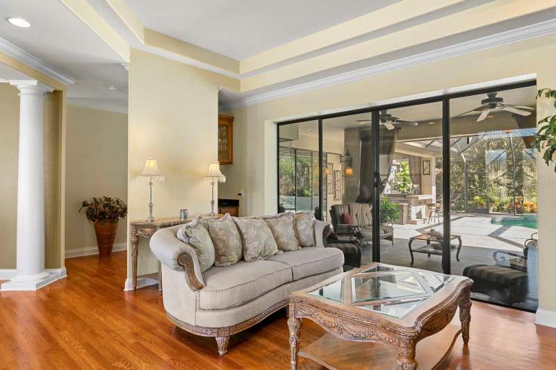 Located in the prestigious manned and guard-gated community of Cory Lake Isles, this northwest-facing, one-of-a-kind custom estate sits on an oversized homesite with private conservation views. From the moment you arrive, the curb appeal is undeniable—an impressive winding pavered driveway leads to a charming courtyard entry and stately double-door foyer. Inside, you’ll find 5 bedrooms, 5 bathrooms, a private office, and a large bonus room, all showcasing custom craftsmanship and rich finishes. The grand foyer sets the tone with soaring scale, column accents, and wood floors that flow through most of the home. The office features plantation shutters, built-ins, and elegant wood flooring, while the formal spaces impress with crown molding, a coffered ceiling, wet bar, built-in hutch, and a wood-burning dual fireplace that is featured in both the living room and primary bedroom. The primary suite is a true retreat with wood floors, and a spa-inspired bath featuring tumbled marble flooring, walk-in closet, detailed tile accents, and custom maple cabinetry. The gourmet kitchen is designed for entertaining with stainless steel appliances, double ovens, maple cabinetry, granite countertops, and an oversized island workstation. The split floor plan ensures privacy, placing the primary suite near the formal areas, two bedrooms near the kitchen and family room, and two more bedrooms toward the rear of the home. The family room highlights wood floors, custom built-ins, and pocket sliding glass doors opening to the outdoor living space. Upstairs, the oversized bonus room offers a full bath and kitchenette with refrigerator, sink, and microwave—perfect as a media room, guest quarters, or in-law suite. The outdoor oasis is extraordinary, with a full outdoor kitchen, large covered lanai, heated spa, cascading waterfall, self cleaning pool, fire pit seating area, and extended pavered patio, all surrounded by lush landscaping. Cory Lake Isles is more than a neighborhood—it’s a lifestyle. Residents enjoy a 165-acre ski lake for boating, fishing, and water sports, along with resort-style amenities including a waterfront beach club, fitness center, playgrounds, parks, tennis and pickleball courts, and a community pool. This rare estate offers luxury living inside and out, with the best of Tampa’s premier gated lakefront community. Welcome Home!