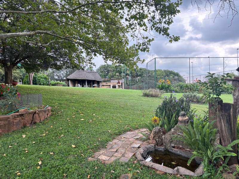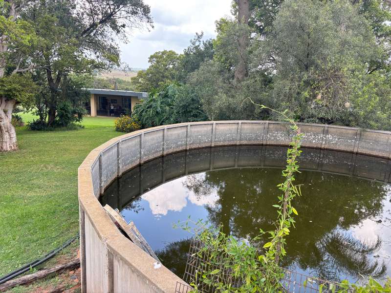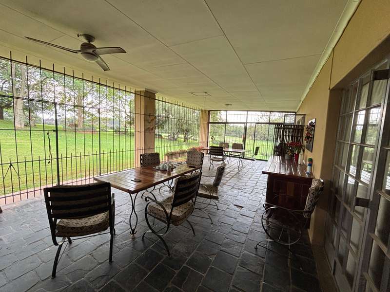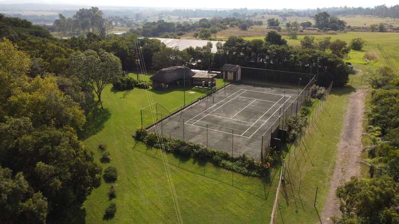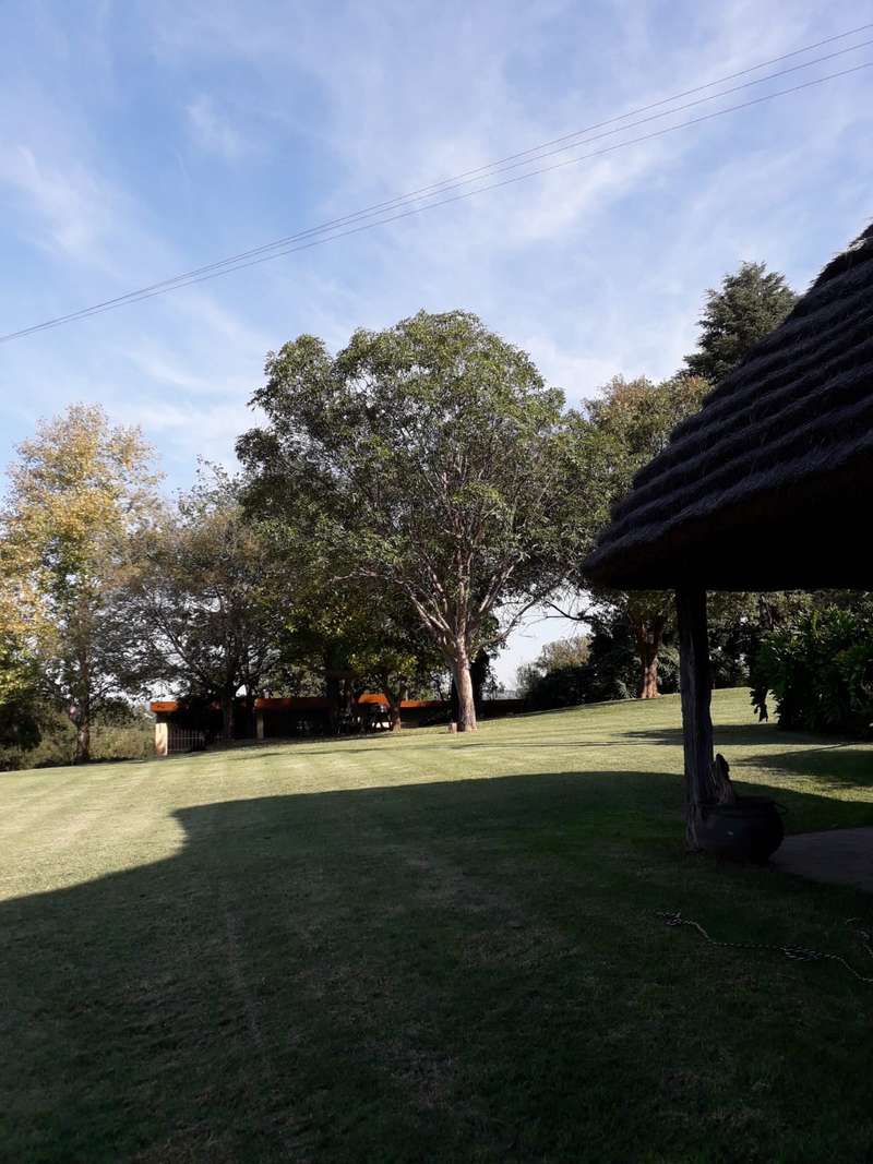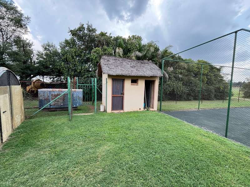 Big farmhouse with pool and tennis court and lapa with braai and pizza oven, all nestled in a landscape garden with rolling lawns. Five bedrooms with big kitchen and gas hob and electric oven, dining room, lounge and secure stoep. Five garages and two carports. A lot of outbuildings and Treetop Flat that can be utilized as Air B&B. There are bedrooms with bathrooms and kitchens with decks overlooking the pristine bush. Sleeps 22. Tshwane power, 80 KVA and a standby 10 KVA generator, all electric fenced with chain-link on the inside with armed reaction, an alarm with remote controlled gates. For the farmer there are two sheds, one 600 sq meters and the other is 900 sq meters together with a lockup storeroom. Two equipped boreholes, 8000 and 22000 liters per hour. A big reservoir, 6 ha pastures with irrigation and 5 ha dry land pastures. Also, a large portion of pristine natural bush, ideal for small game with a dam and natural spruit.