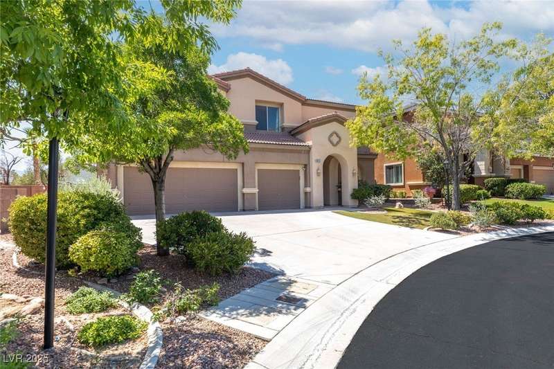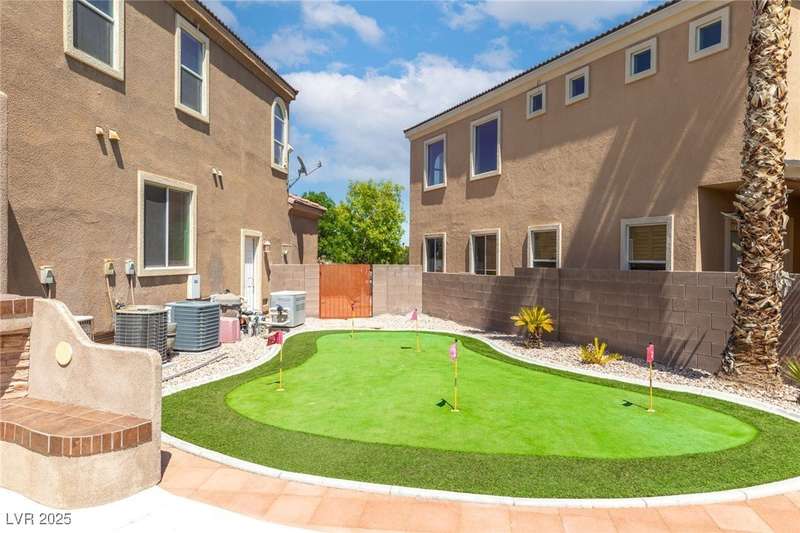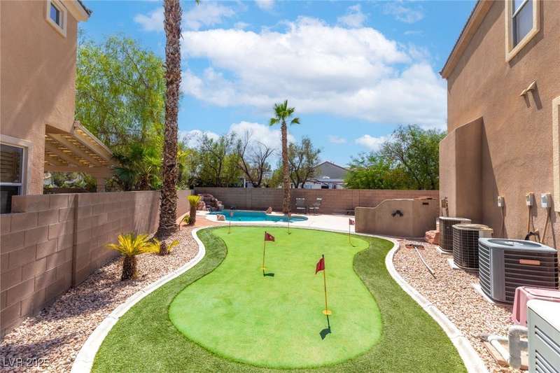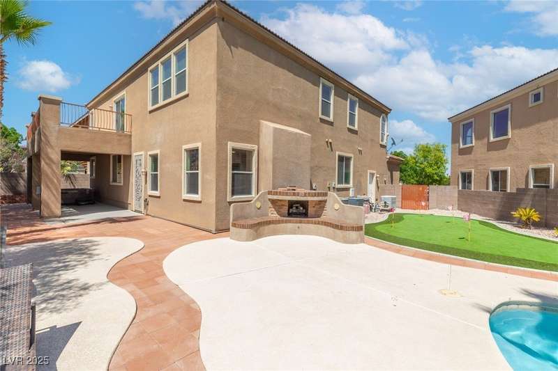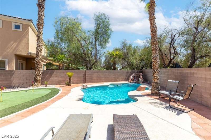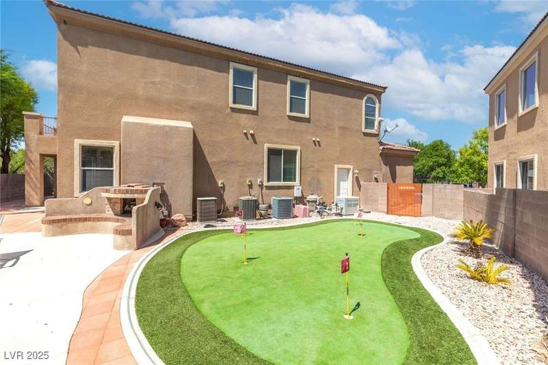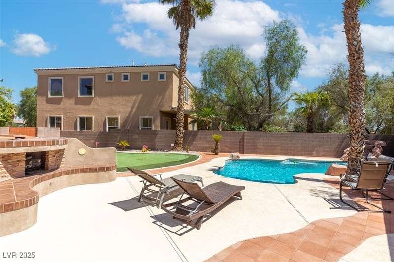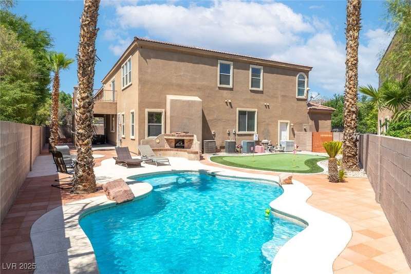Step into this 5 bedroom home with a grand entrance featuring vaulted ceilings and a stunning open staircase! The formal living and dining areas offer plenty of space for hosting guests in style. The entertainer’s kitchen is a dream — complete with granite countertops, espresso cabinetry, and a spacious island with a prep sink. Step outside to your own private retreat featuring a sparkling pool with a tranquil waterfall, and a putting green for fun and practice. An additional custom outdoor fireplace sets the mood for relaxing evenings. Downstairs you'll find a desirable ensuite bedroom with a private bath, plus a convenient half bath for guests. Upstairs, the primary suite feels like a resort getaway with its large walk-in shower, jetted soaking tub, and dual vanities. A spacious upstairs loft offers endless possibilities — home office, game room, fitness area — you name it. Nestled in an exclusive gated community, this stunning home is sure to exceed your expectations!