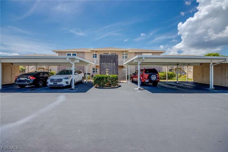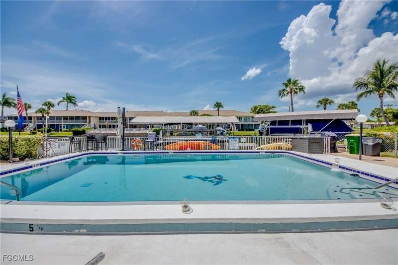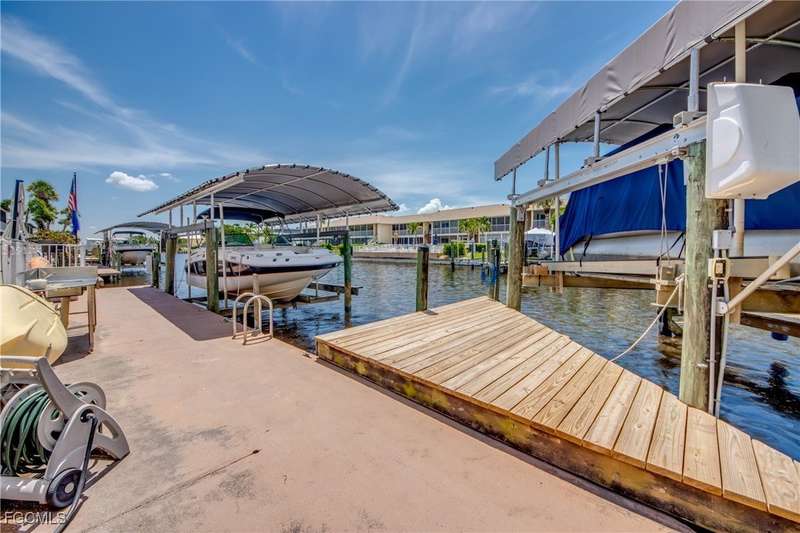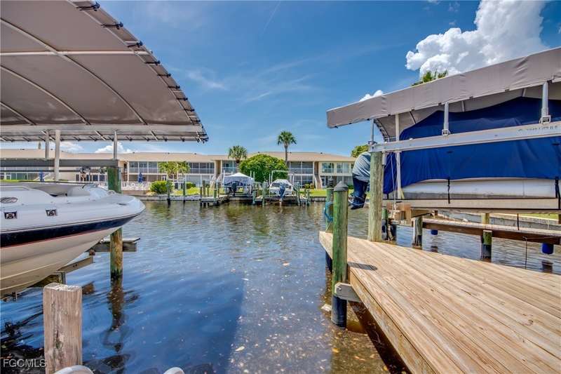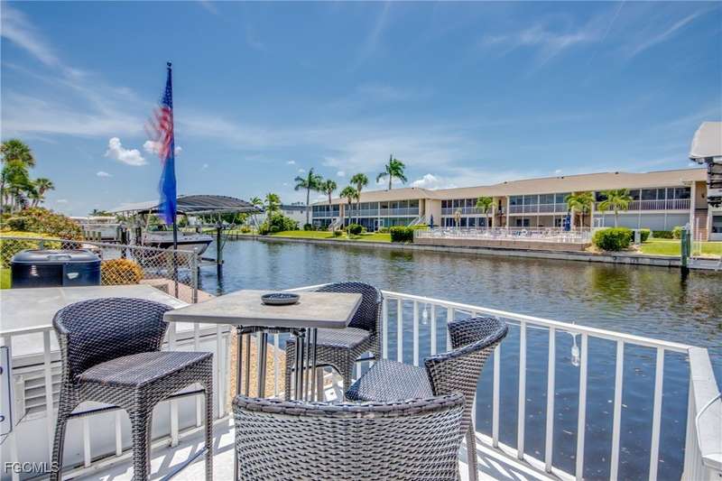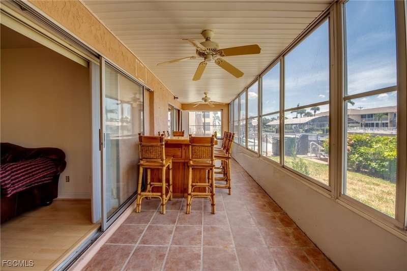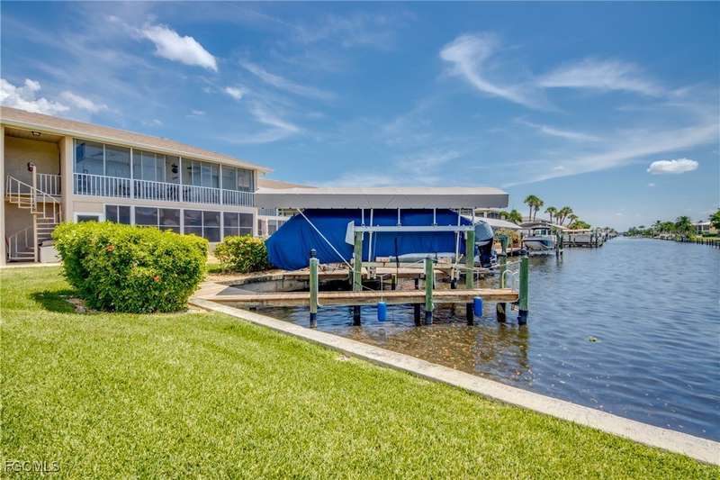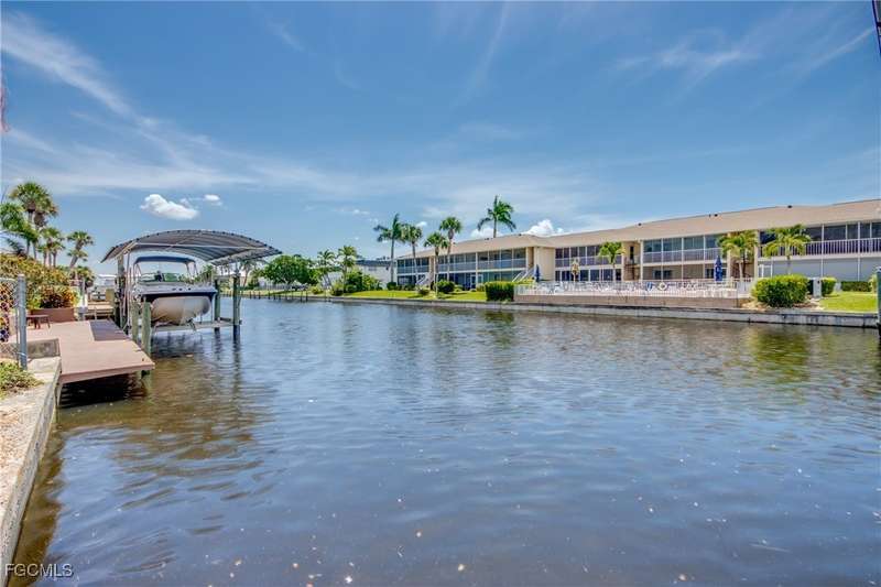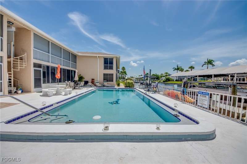 Anglers and Boaters will enjoy the Florida Lifestyle at Mermaid Condo! Well maintained one level, ground floor 2/2 condo with access to the Caloosahatchee River and Gulf of Mexico by boat or a short walk / drive to Downtown Cape Coral Entertainment District in minutes. First floor condo with amazing waterfront southern exposure showcasing the Malaga Canal and a massive waterfront crystal clear pool and tanning deck are a mere 15 steps away. Full wall patio sliders that invite that soothing Florida sunlight help blur the lines between interior and exterior Florida Lifestyle. Large screened and windowed lanai can be used all year round with amazing panoramic waterfront and pool view. Impeccable fully applianced kitchen features impressive Corian counter space and a large pantry. Private master bedroom with large patio sliders showcasing waterfront plus a master bath that rivals a 5 star spa. Spacious Walk in master closet. Generous second bedroom and full bath. Convenient in residence Washer / Dryer closet. Tons of closet space, 8x8 storage room and an additional storage closet at an assigned covered parking spot just 25 steps from front door. New Roof in 2023. New AC 2021. New Fuse Panel 2024. Replumbed 2021.Property feature boat docks that can accommodate up to 25' boats available on a first come...first serve basis. Surrounded by beautifully manicured tropical landscaping.