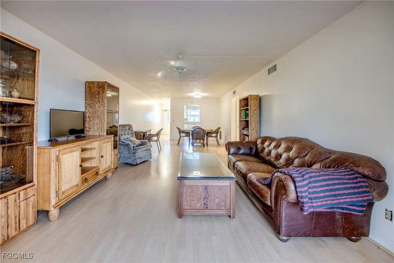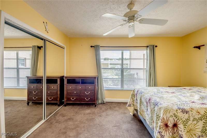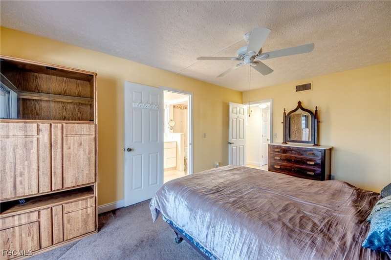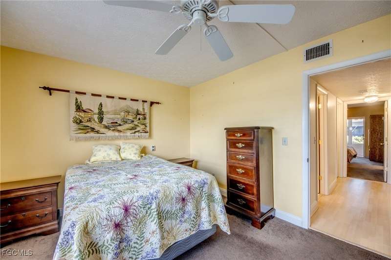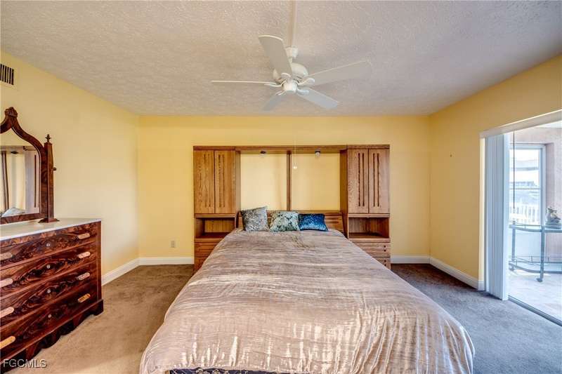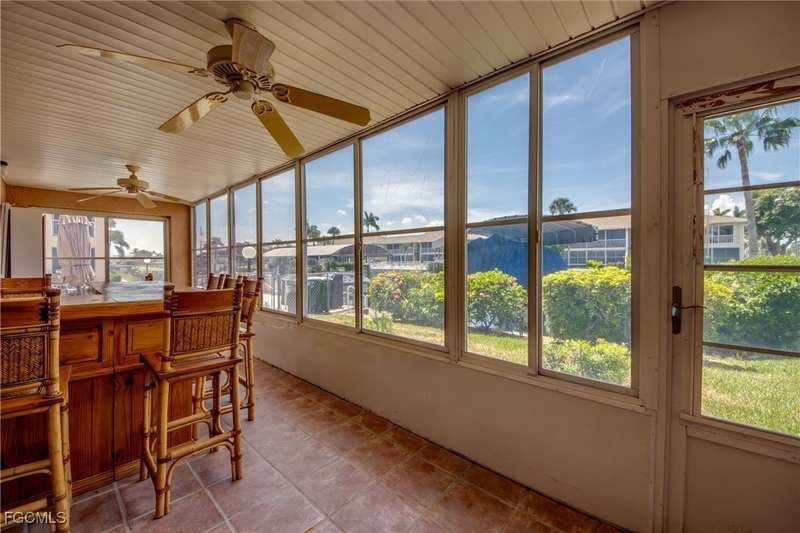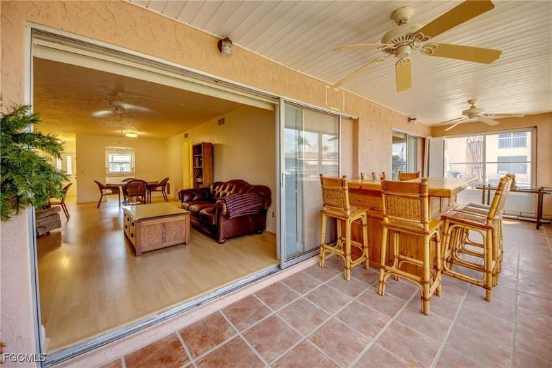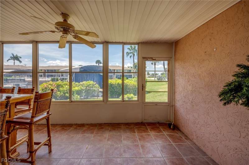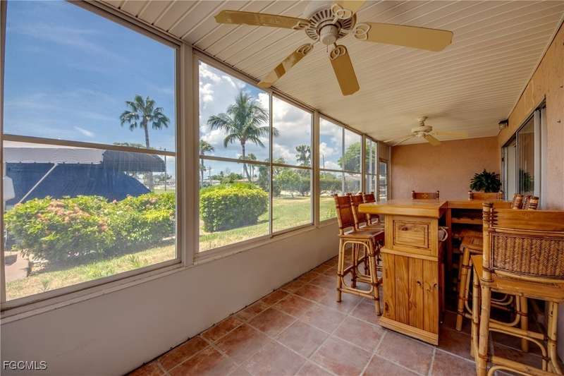 Anglers and Boaters will enjoy the Florida Lifestyle at Mermaid Condo! Well maintained one level, ground floor 2/2 condo with access to the Caloosahatchee River and Gulf of Mexico by boat or a short walk / drive to Downtown Cape Coral Entertainment District in minutes. First floor condo with amazing waterfront southern exposure showcasing the Malaga Canal and a massive waterfront crystal clear pool and tanning deck are a mere 15 steps away. Full wall patio sliders that invite that soothing Florida sunlight help blur the lines between interior and exterior Florida Lifestyle. Large screened and windowed lanai can be used all year round with amazing panoramic waterfront and pool view. Impeccable fully applianced kitchen features impressive Corian counter space and a large pantry. Private master bedroom with large patio sliders showcasing waterfront plus a master bath that rivals a 5 star spa. Spacious Walk in master closet. Generous second bedroom and full bath. Convenient in residence Washer / Dryer closet. Tons of closet space, 8x8 storage room and an additional storage closet at an assigned covered parking spot just 25 steps from front door. New Roof in 2023. New AC 2021. New Fuse Panel 2024. Replumbed 2021.Property feature boat docks that can accommodate up to 25' boats available on a first come...first serve basis. Surrounded by beautifully manicured tropical landscaping.