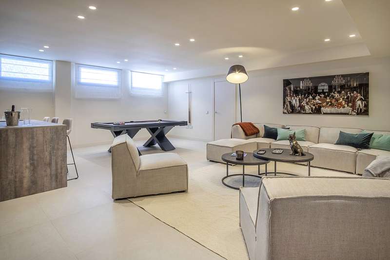 Designed for luxurious coastal living, the villa features four spacious bedrooms, four elegant bathrooms, and a guest toilet. The expansive basement, filled with natural light, includes a chill-out lounge, a stylish bar, a games area, and a fully equipped gym. The open-plan kitchen and living area are enhanced by floor-to-ceiling sliding glass doors that retract into the walls, blending indoor and outdoor spaces with continuous flooring. This creates a fluid connection to the generous terraces, private garden, pool, jacuzzi, and a fully equipped outdoor kitchen with a built-in barbecue, perfect for entertaining. Modern conveniences include an elevator, underfloor heating, an advanced aerothermal climate system, air-conditioning, and electric blinds and shutters. The property also offers three dedicated parking spaces. Offered fully furnished and turnkey-ready — just move in and enjoy beachfront living at its finest.