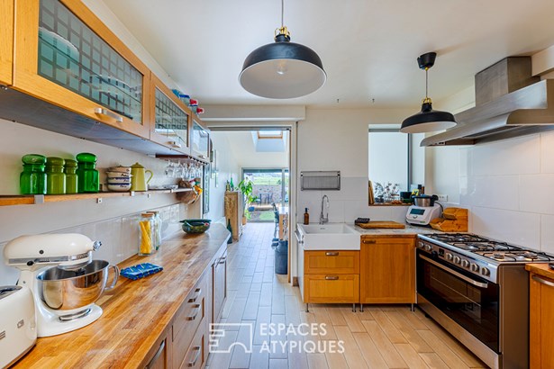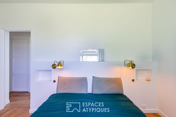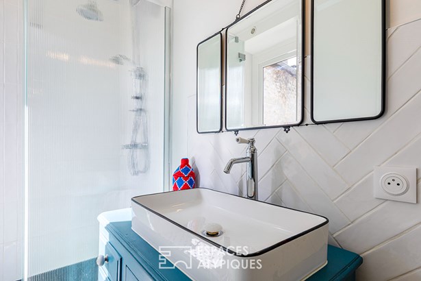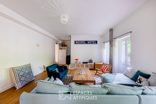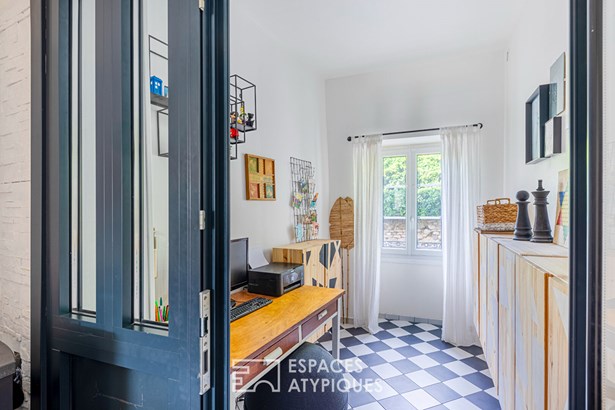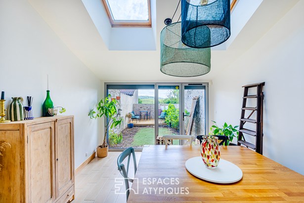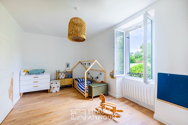 Formerly the village cafe, everything has been redesigned to transform this place into a cozy nest. Past a spacious hall, the house opens onto a beautiful living room and an office with a surface area of 40 sqm, both heated on winter evenings thanks to the gentle warmth of a recent pellet stove.