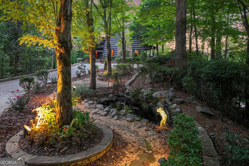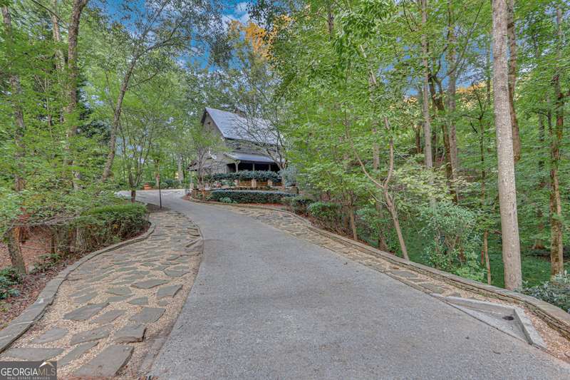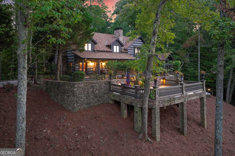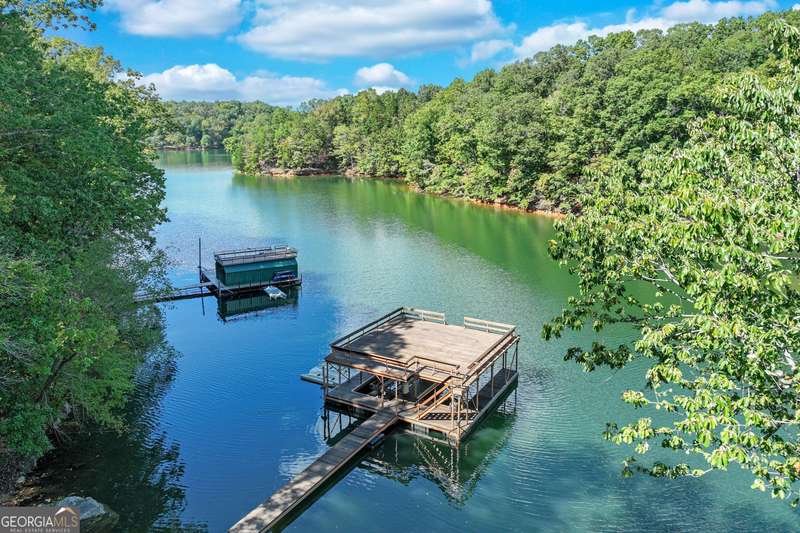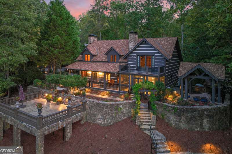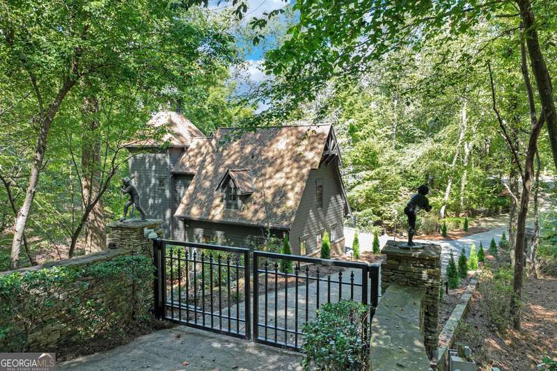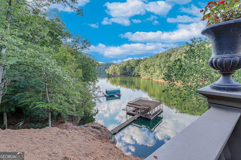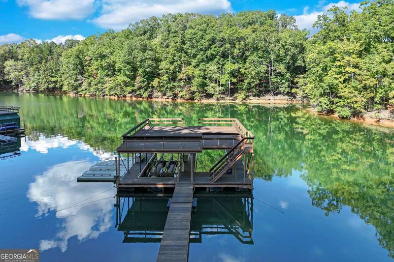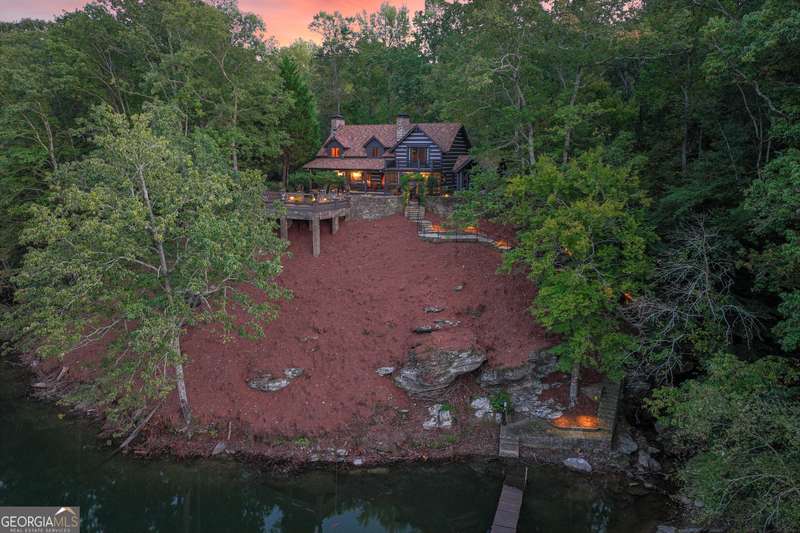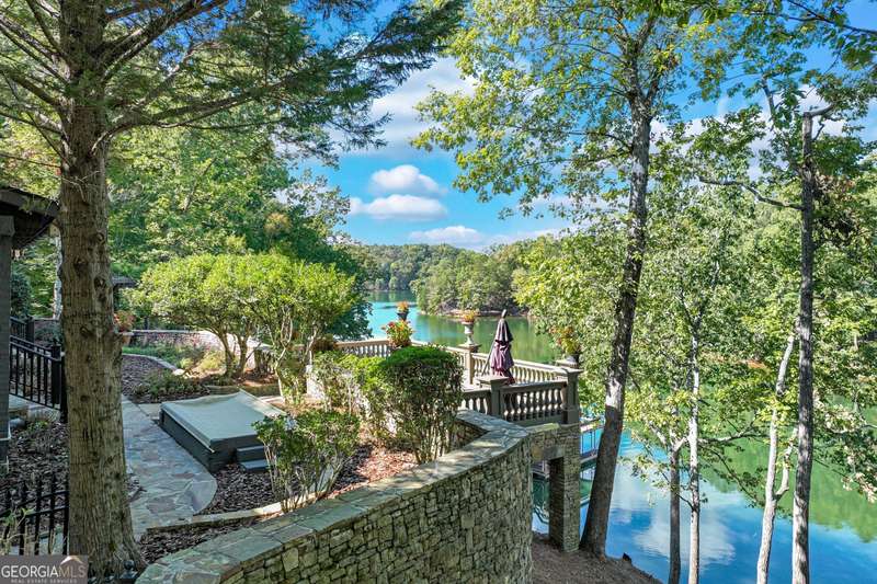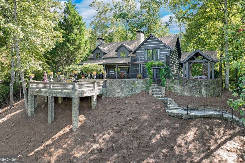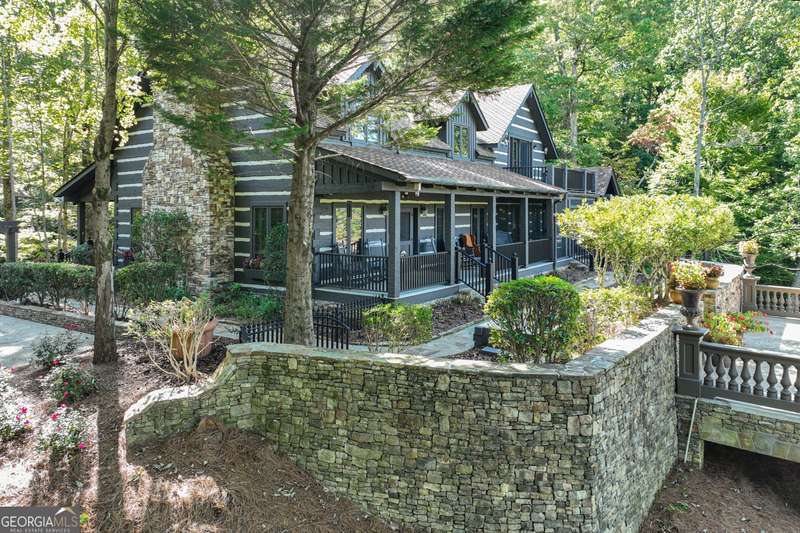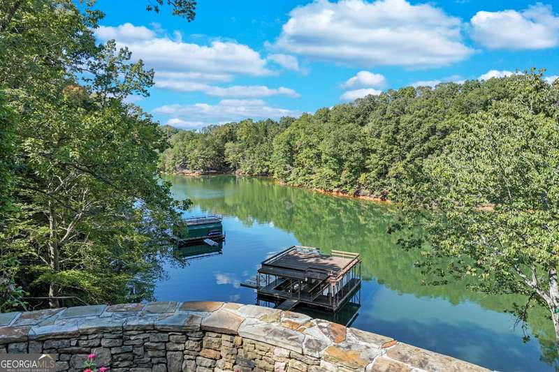 This magnificent, elegantly rustic, custom built Lake Lanier estate on 6.78 acres includes a Main Home, a Carriage House, and 2 attached Guest Houses on deep water with a double slip party dock, along with a stream, multiple waterfalls and water features, covered gazebo, and stone walking paths, is like no other property you've experienced! It could easily function as a private estate, investment opportunity, or corporate retreat. The refined gated entrance and tree lined drive over the stream welcomes you to the Main Home reminiscent of a log home in the mountains. Once inside, you'll appreciate the family room with gorgeous, hand hewn logs and beams, pine floors taken from an 1800's cabin, both joined with wood pegs, wood ceiling, stone fireplace, and an open porch leading to a stone patio that captures beautiful lake views. The kitchen boasts a stone backsplash, Viking appliances of a 4 burner with griddle gas range and refrigerator, a Bosch dishwasher, built-in pantry, a second stone fireplace in the dining area, and lake views. Just off the kitchen is a laundry room, and a hall full bath with SteaMist shower. Walk past a spiral staircase (reclaimed from a ship) and you'll find a generous Guest bedroom with ensuite offering a third stone fireplace, built-ins, lake views, and French doors to a private screened porch. The bath includes a gorgeous stone accent wall and a huge, dual head shower. Upstairs, the Primary bedroom with ensuite offers a cozy sitting/office area featuring a wood burning stove against a stone accent wall. Built-ins and a spacious morning bar lead into the luxurious bath with a makeup area, SteaMist shower, and stone floors. Within the bedroom, a fourth stone fireplace, huge walk-in closet with built-in storage, and French doors leading to your private deck overlooking the lake, combine to enhance the beginning or ending of your day. An additional bedroom/office with 3 closets, a sitting area, and a fifth stone fireplace will warmly welcome guests. Two hall closets and a hall, full bath completes the upper floor. The Carriage House features a 2 bay, heated and cooled garage with an interlocking tiled floor. Upstairs you'll enjoy the convenience of a full kitchen with a Thermador 4 burner gas range, 2 Subzero under counter refrigerators, a Bosch dishwasher, granite counters, stained cabinets, wood walls and ceiling, and wide board pine flooring. A spacious dining and living area focuses on a stacked stone accent wall with wood burning stove. A full bath, linen closet, and closet, along with a loft bedroom makes a perfect space for your guests. Should there be a power loss, a Generac generator supports the Main Home and the Carriage House. The Guest Homes allow for additional family or guests to feel right at home. Each home features 2 garage bays that are heated and cooled with separate thermostats, with 1 bay hosting an EV charger. Upon entering the homes, you'll find a laundry room with glazed cabinets, Travertine tile floors, granite countertops, and a sink. Before you walk upstairs, look up! You won't want to miss the stunning, light-filled, wood ceiling. Once upstairs, you'll find that both living spaces are private, yet conveniently connected. They each offer kitchenettes with Kitchen Aide refrigerators, drawer dishwashers, and microwaves. The family and dining areas are intimate, and both have ample bedrooms with ensuites. Stone paths from the Main home and the Guest Home lead past the stream, waterfall, and pond to a covered gazebo with beautiful lake views. The 32x32 double slip, covered dock is teak and has been recently pressure washed and oiled. Included at the dock are a boat hoist and 4 jet ski ports. The dock electrical was also recently rewired. This amazing property also features stone accent walls. A walkable paved cart path that leads to the adjacent vacant lot with a concrete drive allows for overflow parking, an RV or trailer for your watercraft, and a separate gated entrance.