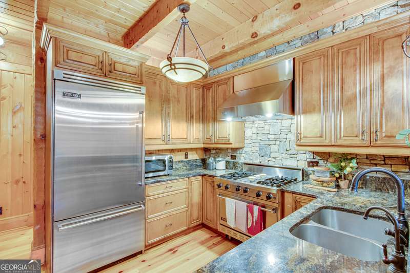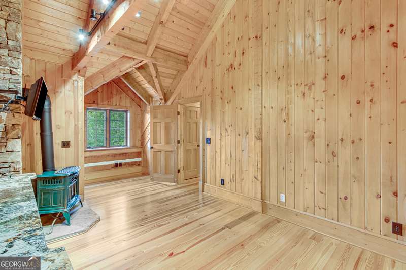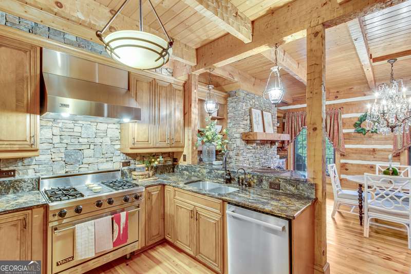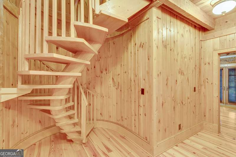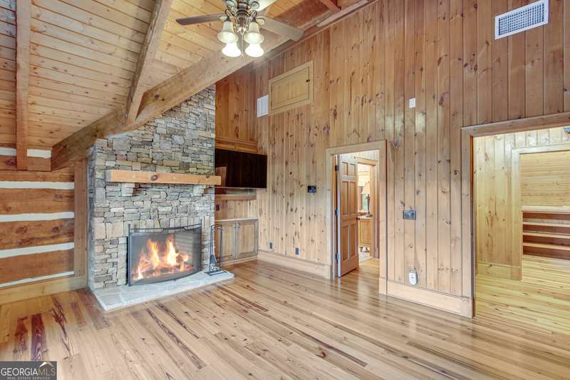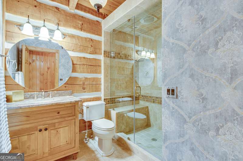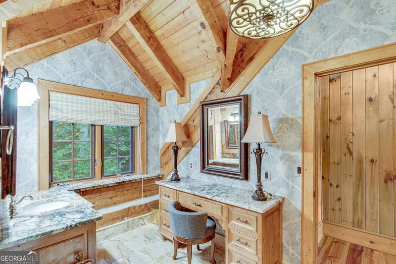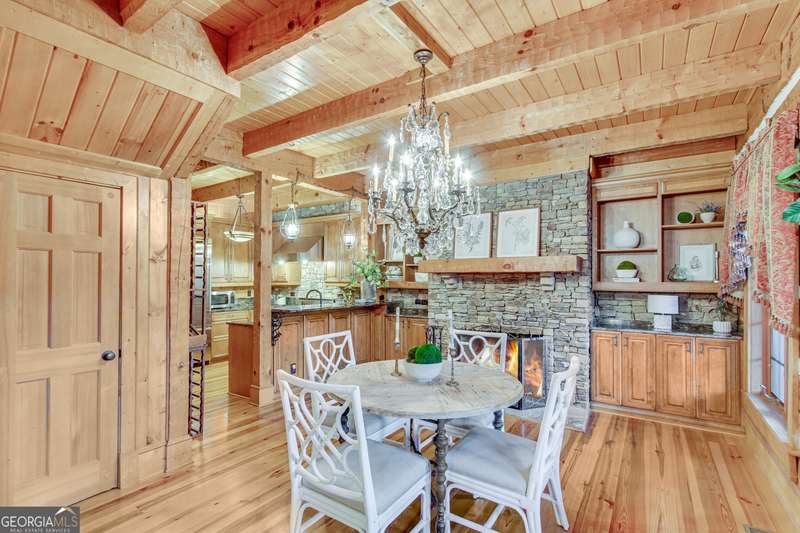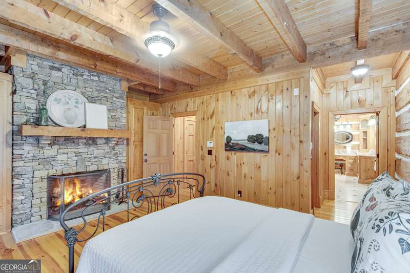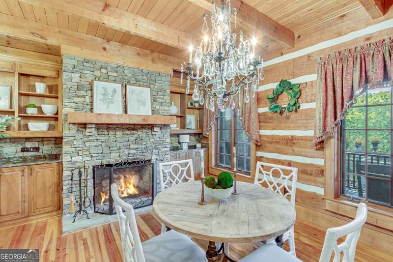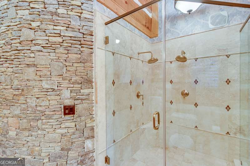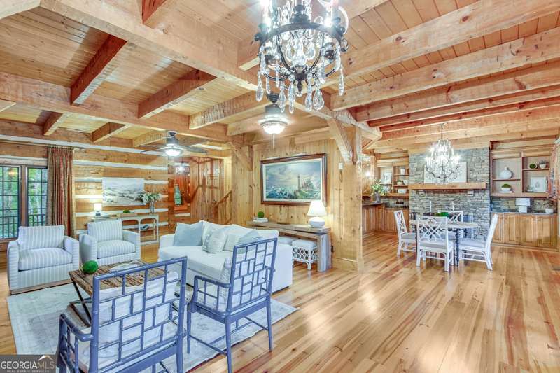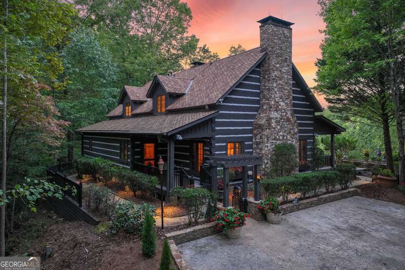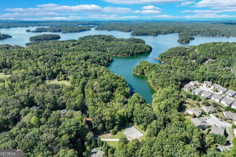 This magnificent, elegantly rustic, custom built Lake Lanier estate on 6.78 acres includes a Main Home, a Carriage House, and 2 attached Guest Houses on deep water with a double slip party dock, along with a stream, multiple waterfalls and water features, covered gazebo, and stone walking paths, is like no other property you've experienced! It could easily function as a private estate, investment opportunity, or corporate retreat. The refined gated entrance and tree lined drive over the stream welcomes you to the Main Home reminiscent of a log home in the mountains. Once inside, you'll appreciate the family room with gorgeous, hand hewn logs and beams, pine floors taken from an 1800's cabin, both joined with wood pegs, wood ceiling, stone fireplace, and an open porch leading to a stone patio that captures beautiful lake views. The kitchen boasts a stone backsplash, Viking appliances of a 4 burner with griddle gas range and refrigerator, a Bosch dishwasher, built-in pantry, a second stone fireplace in the dining area, and lake views. Just off the kitchen is a laundry room, and a hall full bath with SteaMist shower. Walk past a spiral staircase (reclaimed from a ship) and you'll find a generous Guest bedroom with ensuite offering a third stone fireplace, built-ins, lake views, and French doors to a private screened porch. The bath includes a gorgeous stone accent wall and a huge, dual head shower. Upstairs, the Primary bedroom with ensuite offers a cozy sitting/office area featuring a wood burning stove against a stone accent wall. Built-ins and a spacious morning bar lead into the luxurious bath with a makeup area, SteaMist shower, and stone floors. Within the bedroom, a fourth stone fireplace, huge walk-in closet with built-in storage, and French doors leading to your private deck overlooking the lake, combine to enhance the beginning or ending of your day. An additional bedroom/office with 3 closets, a sitting area, and a fifth stone fireplace will warmly welcome guests. Two hall closets and a hall, full bath completes the upper floor. The Carriage House features a 2 bay, heated and cooled garage with an interlocking tiled floor. Upstairs you'll enjoy the convenience of a full kitchen with a Thermador 4 burner gas range, 2 Subzero under counter refrigerators, a Bosch dishwasher, granite counters, stained cabinets, wood walls and ceiling, and wide board pine flooring. A spacious dining and living area focuses on a stacked stone accent wall with wood burning stove. A full bath, linen closet, and closet, along with a loft bedroom makes a perfect space for your guests. Should there be a power loss, a Generac generator supports the Main Home and the Carriage House. The Guest Homes allow for additional family or guests to feel right at home. Each home features 2 garage bays that are heated and cooled with separate thermostats, with 1 bay hosting an EV charger. Upon entering the homes, you'll find a laundry room with glazed cabinets, Travertine tile floors, granite countertops, and a sink. Before you walk upstairs, look up! You won't want to miss the stunning, light-filled, wood ceiling. Once upstairs, you'll find that both living spaces are private, yet conveniently connected. They each offer kitchenettes with Kitchen Aide refrigerators, drawer dishwashers, and microwaves. The family and dining areas are intimate, and both have ample bedrooms with ensuites. Stone paths from the Main home and the Guest Home lead past the stream, waterfall, and pond to a covered gazebo with beautiful lake views. The 32x32 double slip, covered dock is teak and has been recently pressure washed and oiled. Included at the dock are a boat hoist and 4 jet ski ports. The dock electrical was also recently rewired. This amazing property also features stone accent walls. A walkable paved cart path that leads to the adjacent vacant lot with a concrete drive allows for overflow parking, an RV or trailer for your watercraft, and a separate gated entrance.
