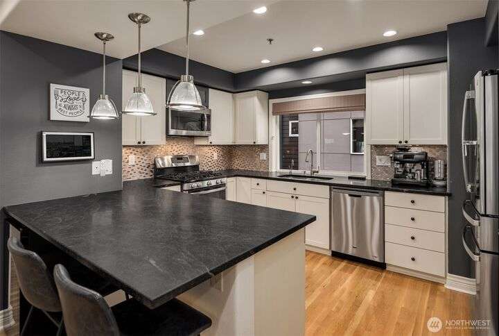 Sweeping views of Lake Union, Downtown, & Cascades can be enjoyed on four levels in this stunning end-unit townhome high on the east slope of Queen Anne. Natural light moves throughout the home & open-concept main living area is perfect for entertainment. Terraces on each level, including a spectacular rooftop area with sublime 180 vistas. High-end kitchen features stainless appliances, large pantry & expansive bar. Owners’ suite has private balcony & 5-piece spa-like bath with a jetted tub; 2nd guest bedroom w/ ensuite bath. Large top-floor bedroom has a dramatic vaulted ceiling, wet bar, & is exceptionally bright. Bonus home office/workout area w/ private patio + rare attached 2-car garage. Walk to vibrant SLU for work, shops, & dining.