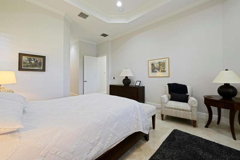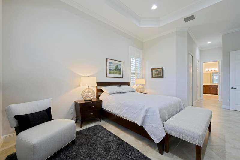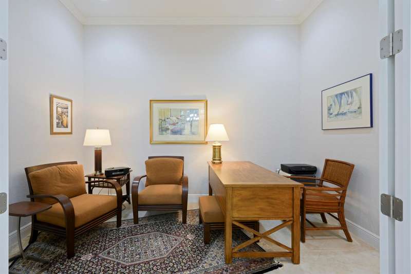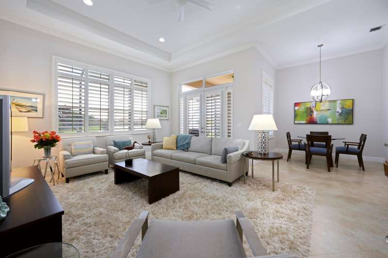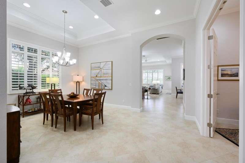 Welcome to Paloma, one of Palm Beach Gardens' most sought-after gated communities. This beautifully maintained single-family residence offers 3 bedrooms, 2.5 baths, a versatile den, and a 2-car garage, all thoughtfully designed with a split floor plan for comfort and privacy. Step inside the grand foyer, accented by chandelier lighting, crown molding, and custom baseboards, and you'll immediately notice the timeless details throughout -- including plantation shutters, recessed lighting, and tile flooring in every room. The formal dining room features elegant lighting and seamlessly connects to the double-door den, perfect for a home office or library.