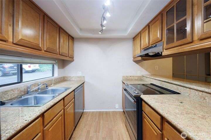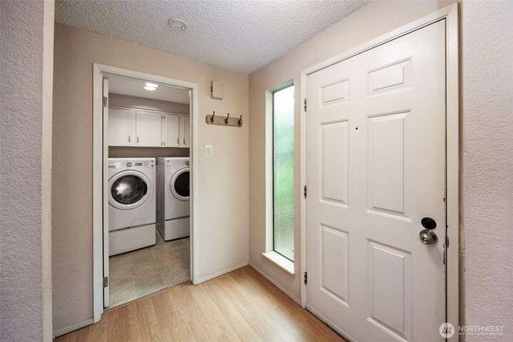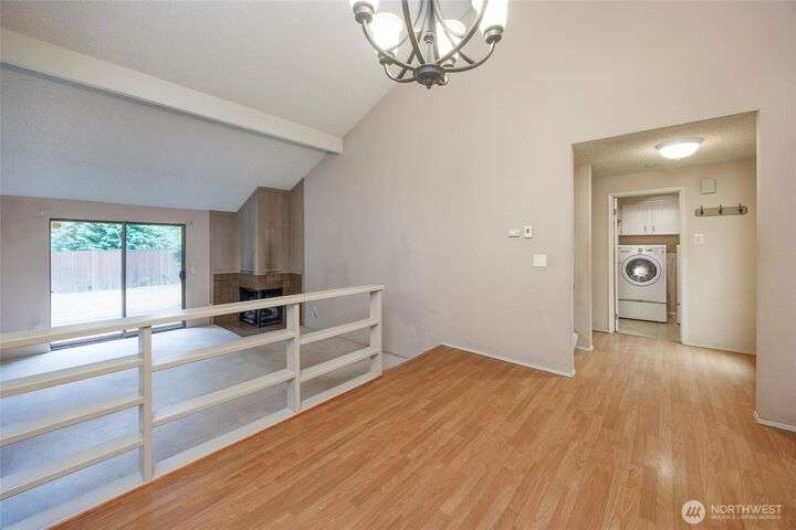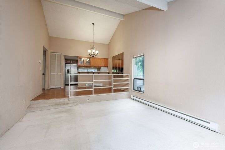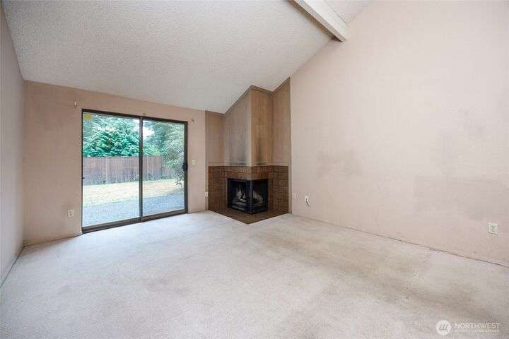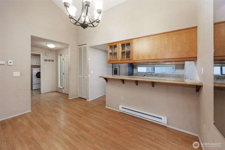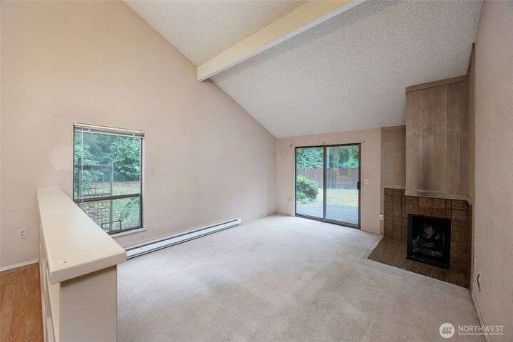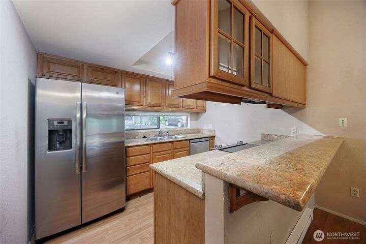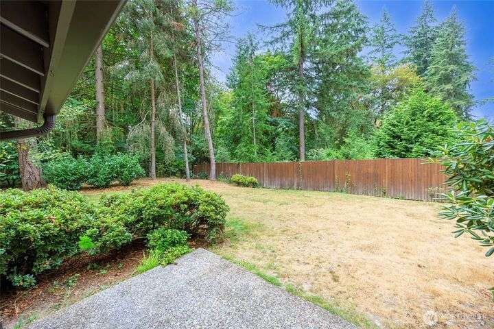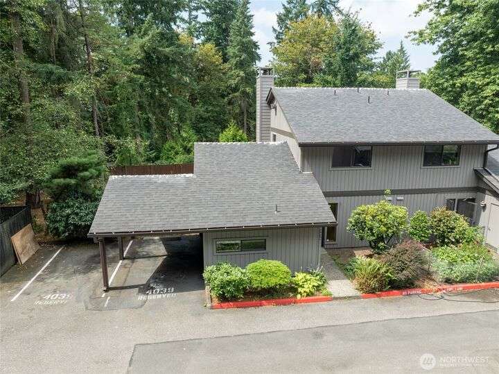 Prime location offering the best of urban living & tranquility. End-Unit turn-key townhome w/ 2 story vaulted ceilings. Updated kitchen featuring granite counters, breakfast bar, & ample cabinet space. A separate dining area provides an ideal setting for gatherings & entertaining. The smart, flowing layout ensures a seamless transition between spaces. Primary suite ideally situated on the main floor w/en suite & serene backyard views. Upstairs, two generously sized guest bedrooms w/ample closet space, & share an adjacent ¾ bath. This private corner unit w/ a huge semi-private backyard, lives like a standalone house. Two dedicated parking spots. No Rental Cap. Close to everything: minutes to Microsoft, downtown Bellevue, Kirkland & Redmond.