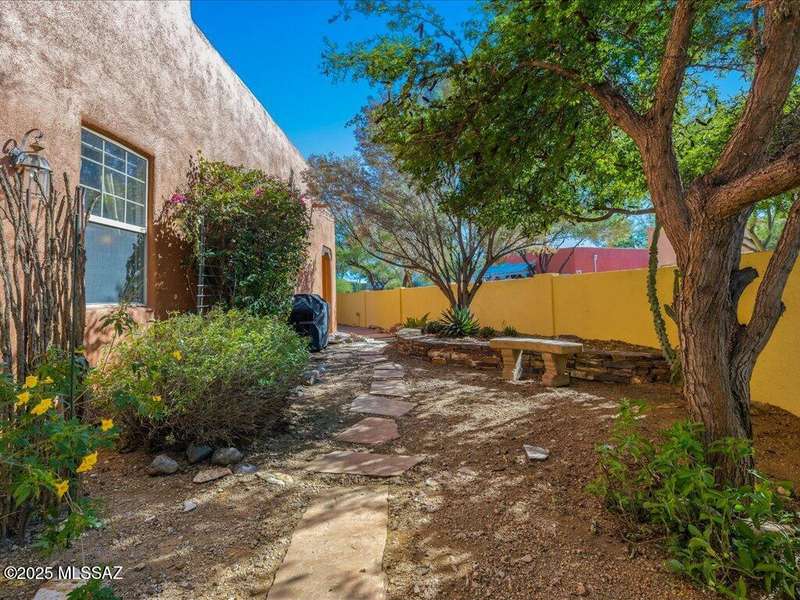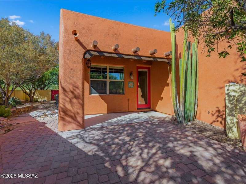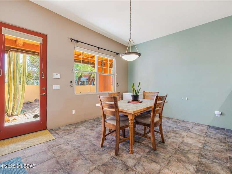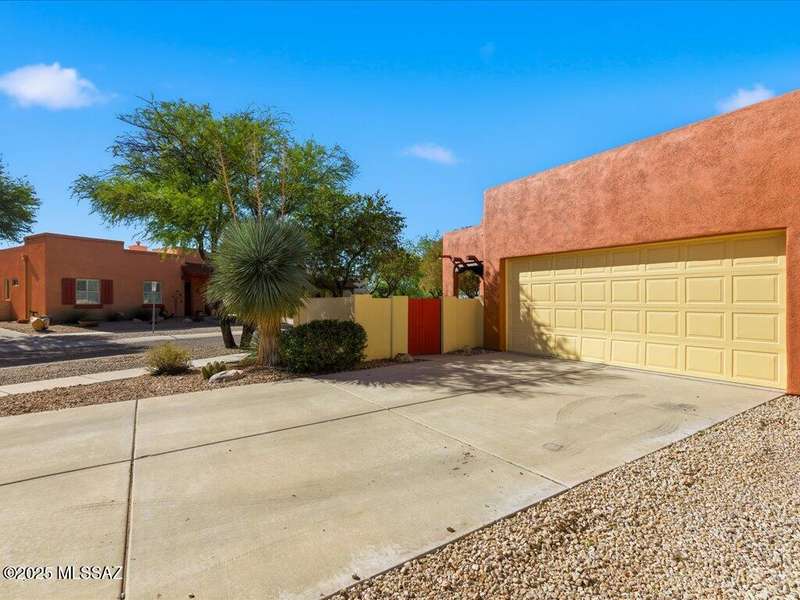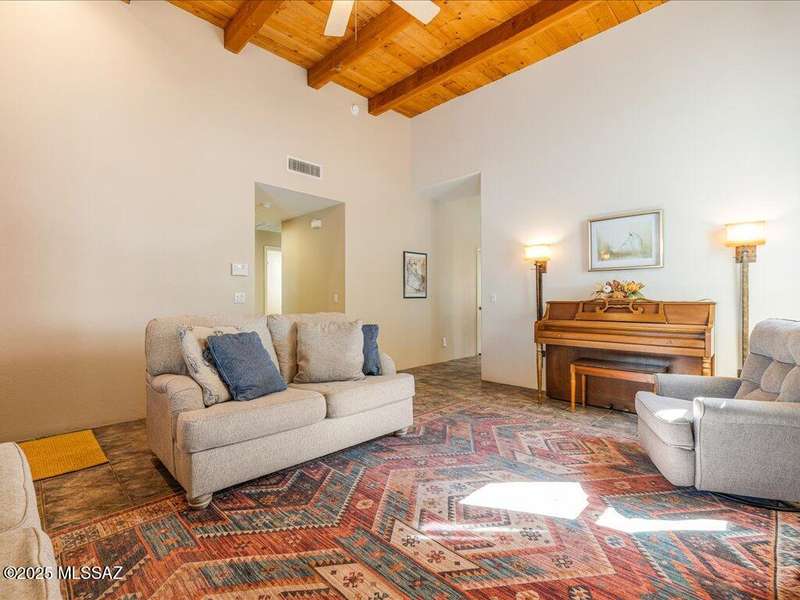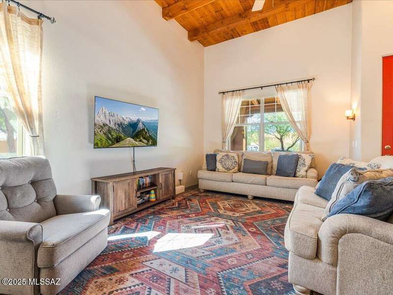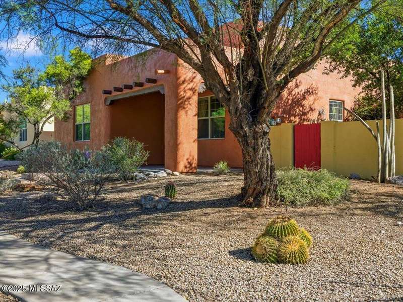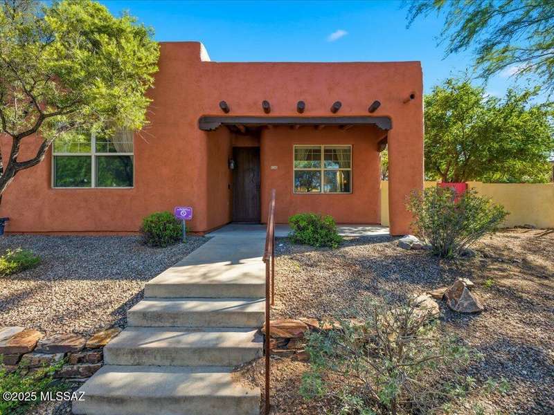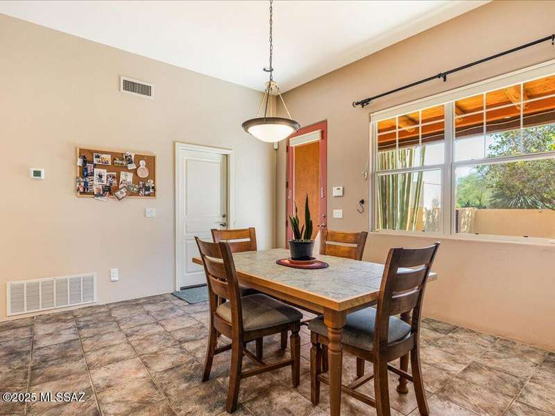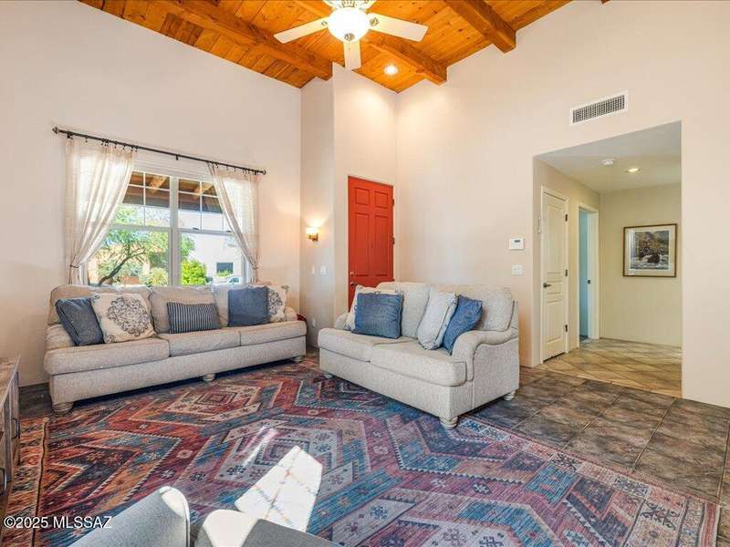 Discover this charming single-level TJ Bednar home in the sought-after Civano community of southeast Tucson. Built in 2002, this 1,383 sq ft residence offers 3 bedrooms and 2 full baths. The inviting living room features rough-sawn wood beams and an accented ceiling, adding warmth and character. The kitchen includes granite countertops and an open layout perfect for entertaining. Both bathrooms are beautifully remodeled, with the primary bath showcasing a porcelain-tiled walk-in shower. An owned PV solar system provides energy efficiency and lower electric bills year-round, enhancing the home's sustainability and value. Situated on a private corner lot with custom landscaping, this home also offers access to Civano's pools, parks, walking paths, and tennis courts.