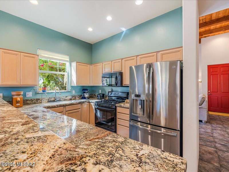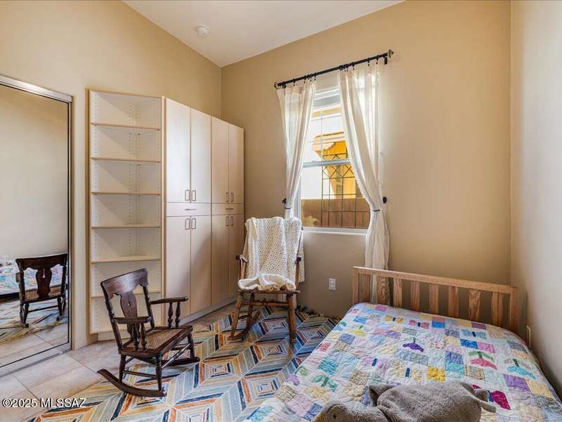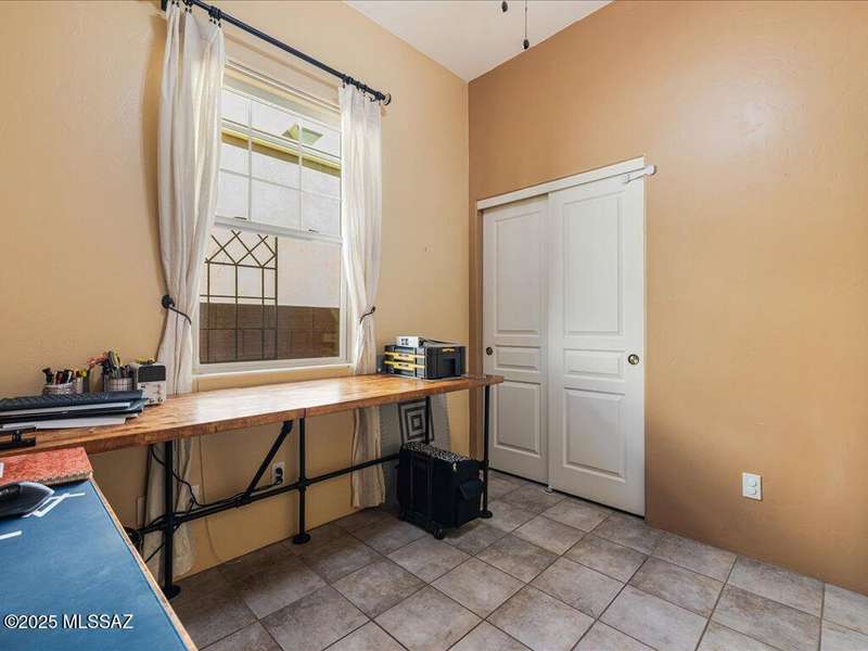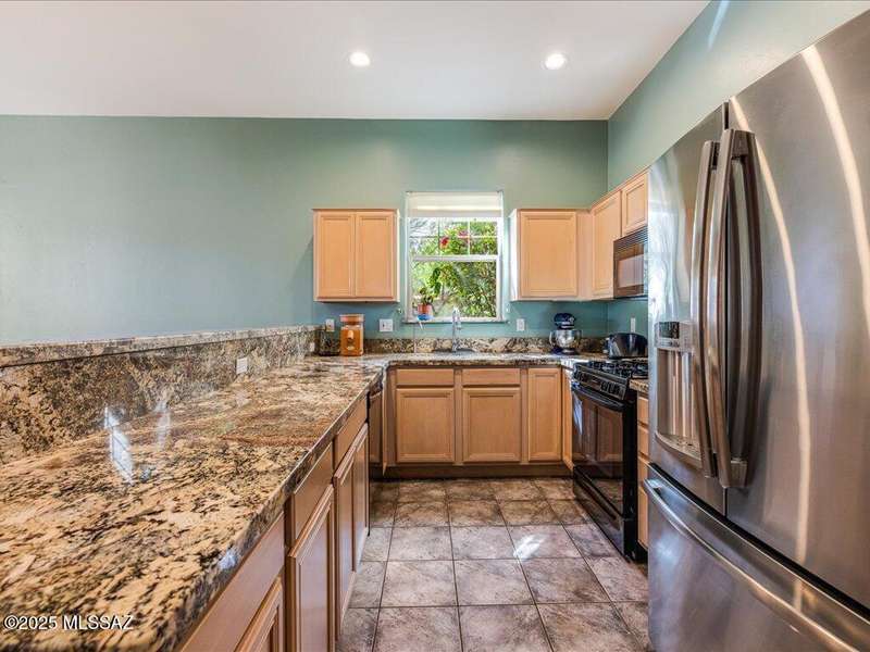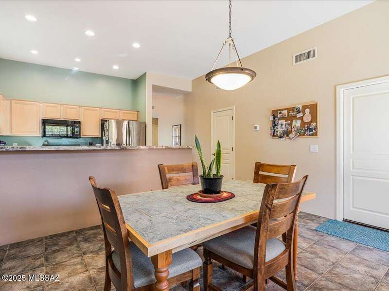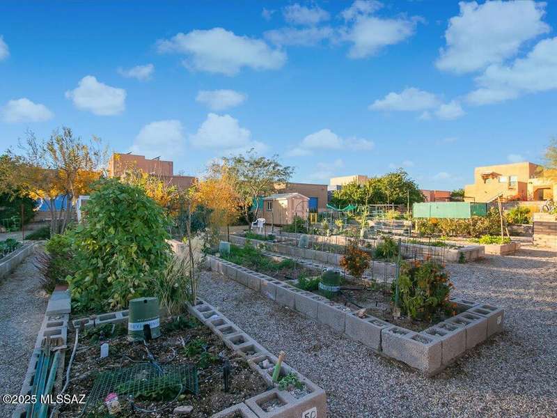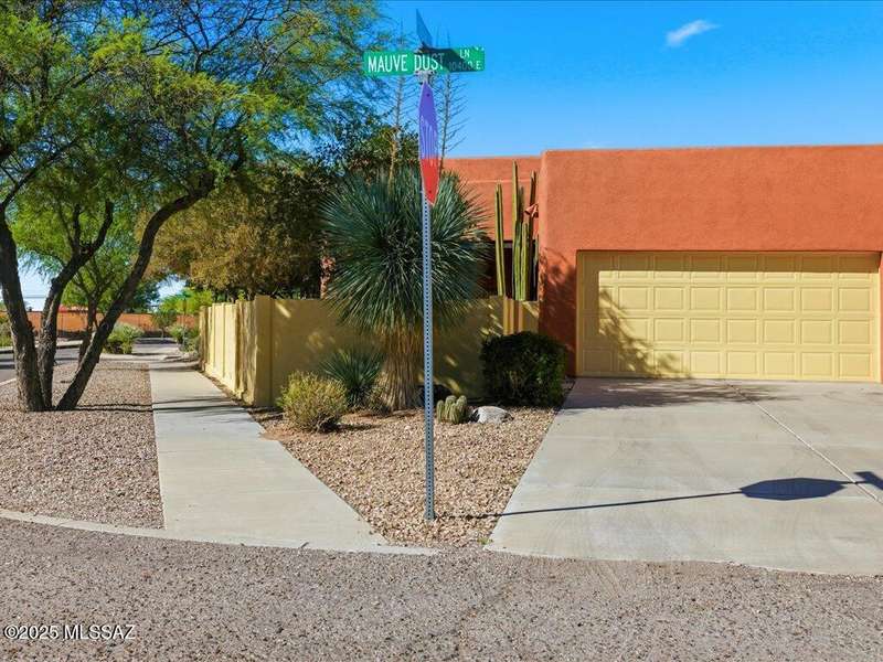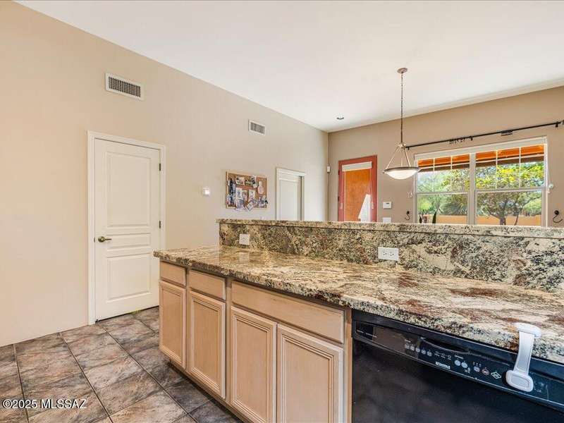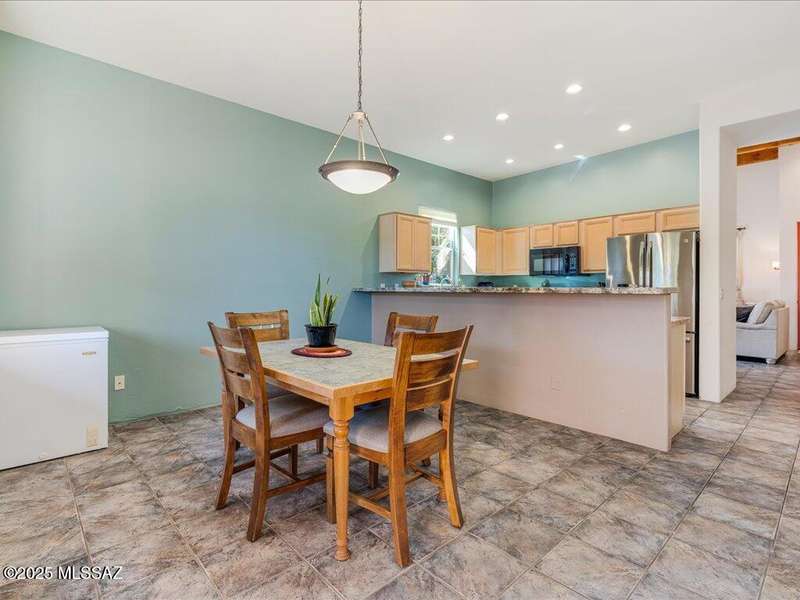 Discover this charming single-level TJ Bednar home in the sought-after Civano community of southeast Tucson. Built in 2002, this 1,383 sq ft residence offers 3 bedrooms and 2 full baths. The inviting living room features rough-sawn wood beams and an accented ceiling, adding warmth and character. The kitchen includes granite countertops and an open layout perfect for entertaining. Both bathrooms are beautifully remodeled, with the primary bath showcasing a porcelain-tiled walk-in shower. An owned PV solar system provides energy efficiency and lower electric bills year-round, enhancing the home's sustainability and value. Situated on a private corner lot with custom landscaping, this home also offers access to Civano's pools, parks, walking paths, and tennis courts.