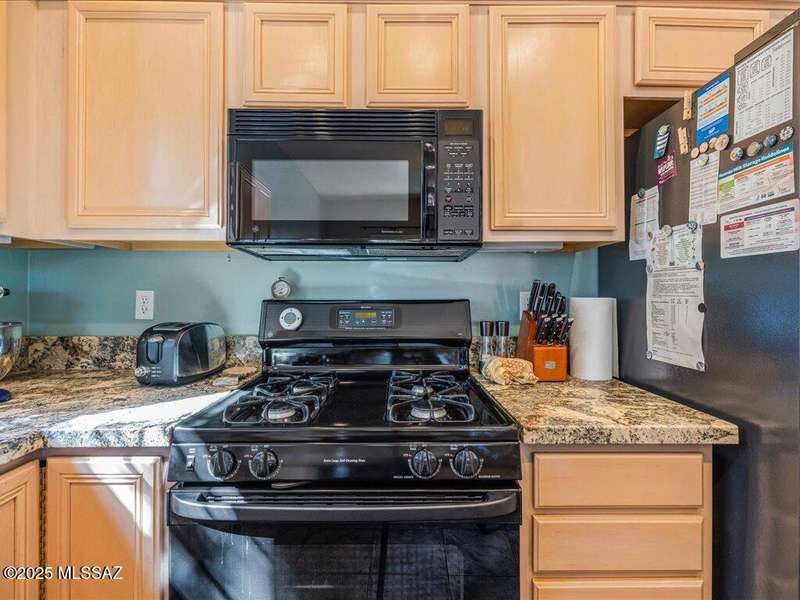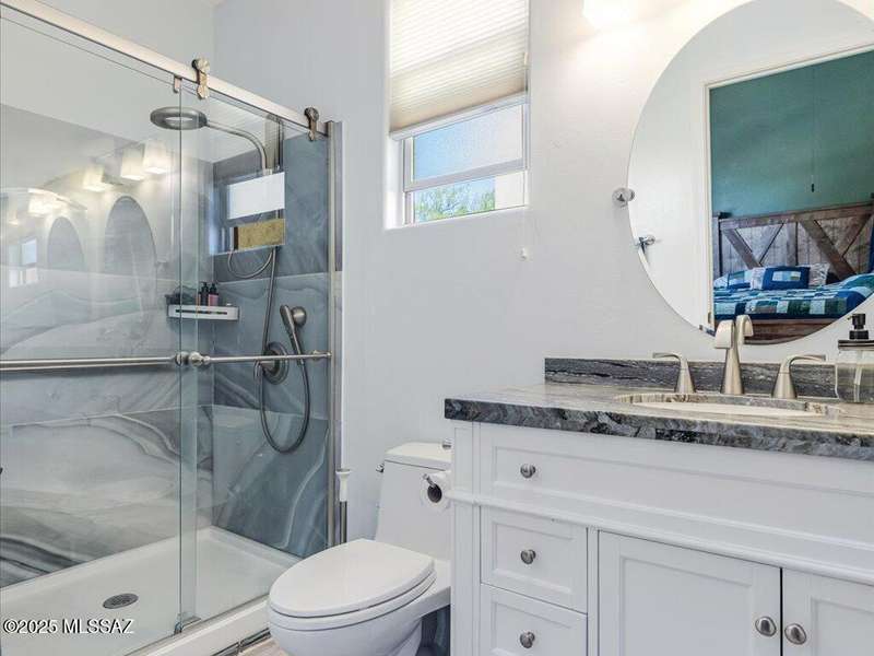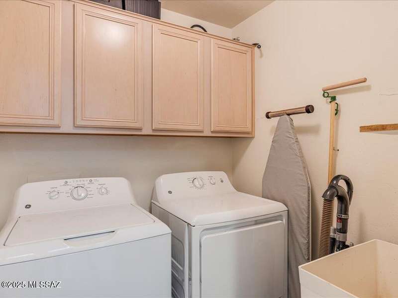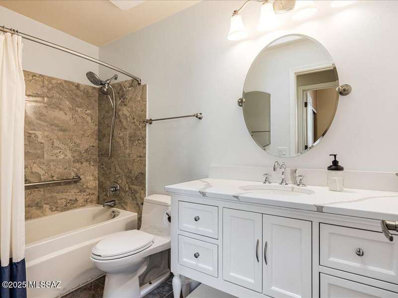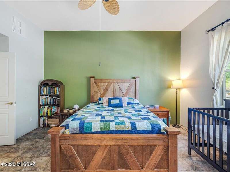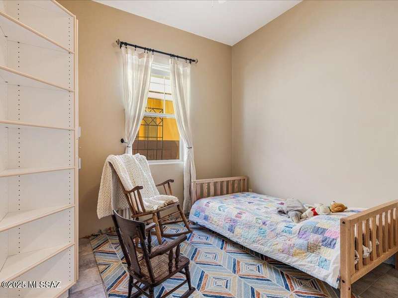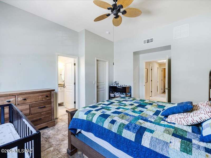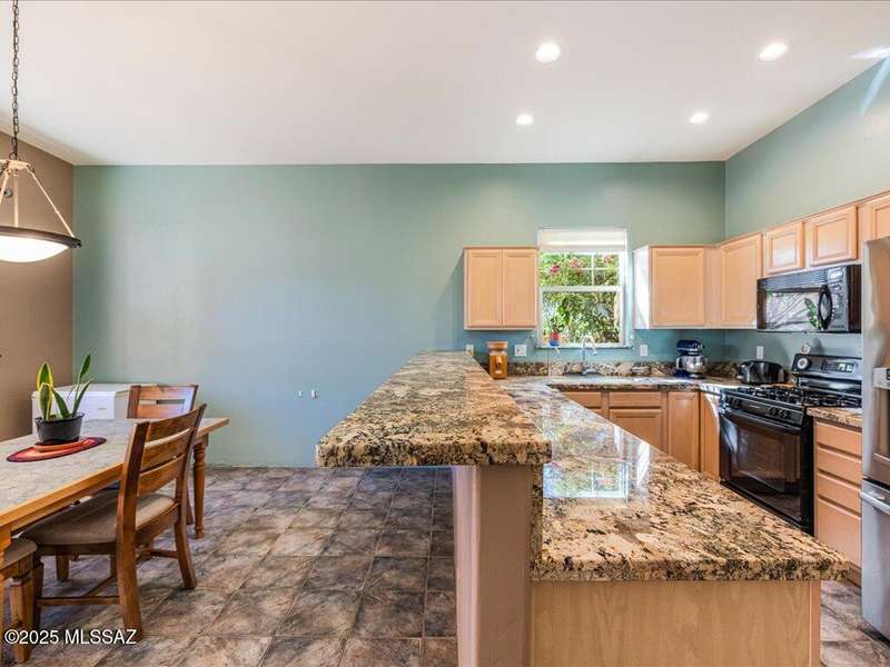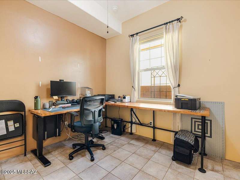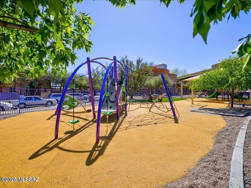 Discover this charming single-level TJ Bednar home in the sought-after Civano community of southeast Tucson. Built in 2002, this 1,383 sq ft residence offers 3 bedrooms and 2 full baths. The inviting living room features rough-sawn wood beams and an accented ceiling, adding warmth and character. The kitchen includes granite countertops and an open layout perfect for entertaining. Both bathrooms are beautifully remodeled, with the primary bath showcasing a porcelain-tiled walk-in shower. An owned PV solar system provides energy efficiency and lower electric bills year-round, enhancing the home's sustainability and value. Situated on a private corner lot with custom landscaping, this home also offers access to Civano's pools, parks, walking paths, and tennis courts.