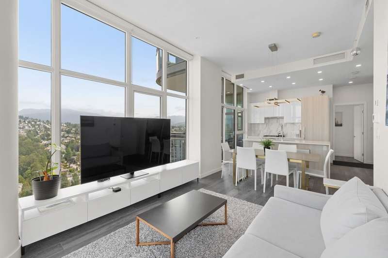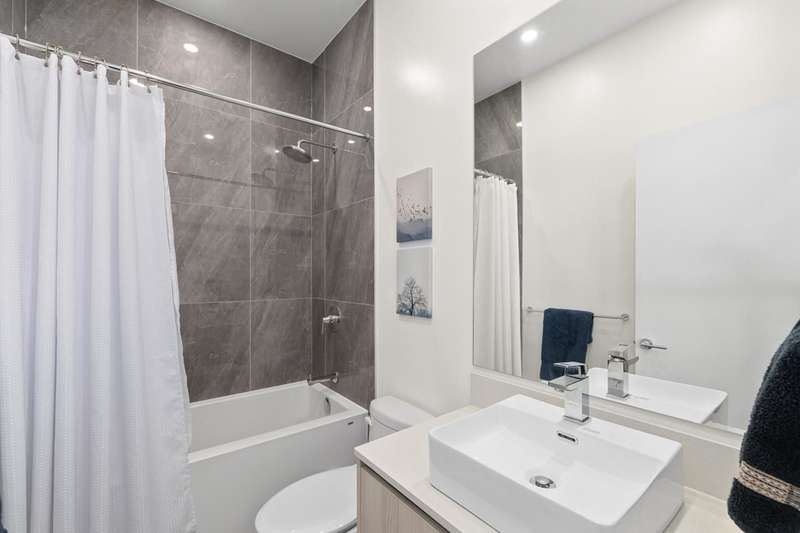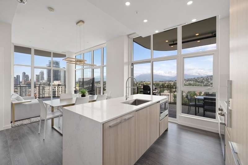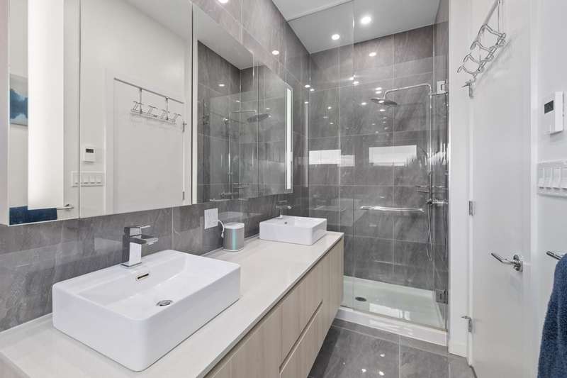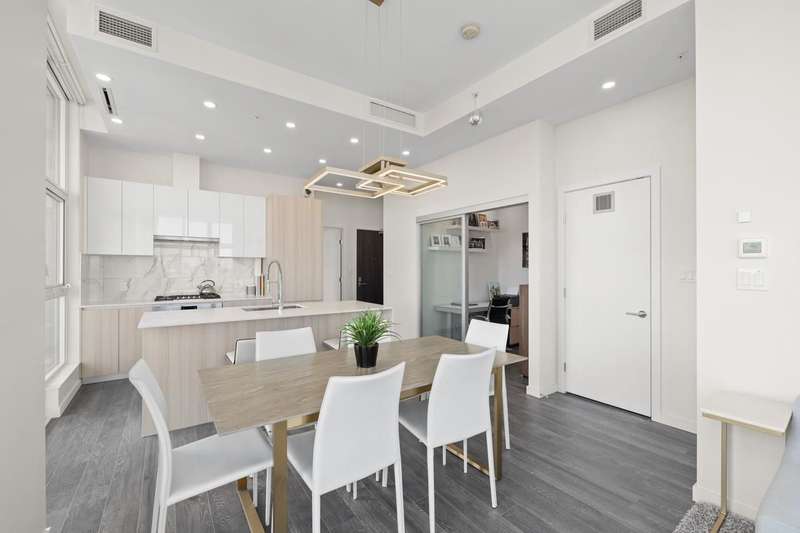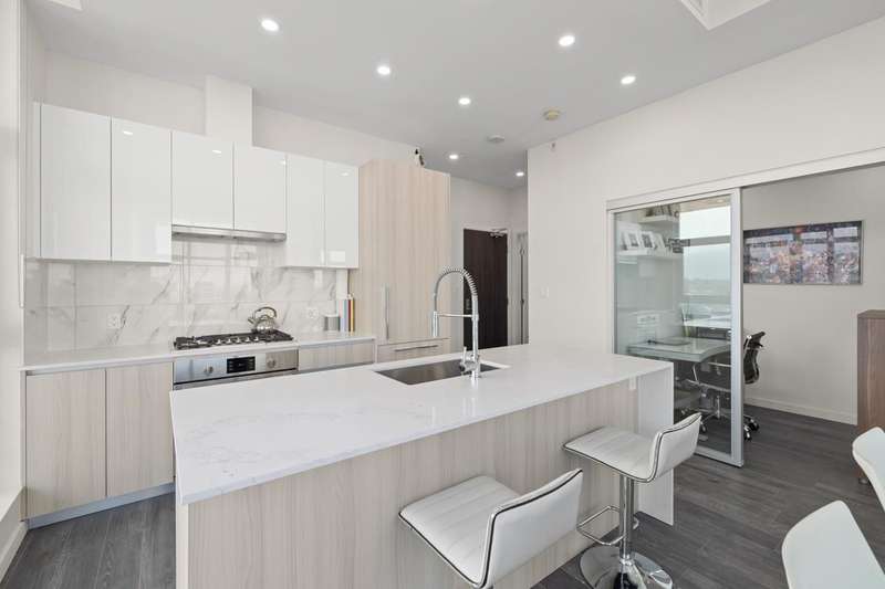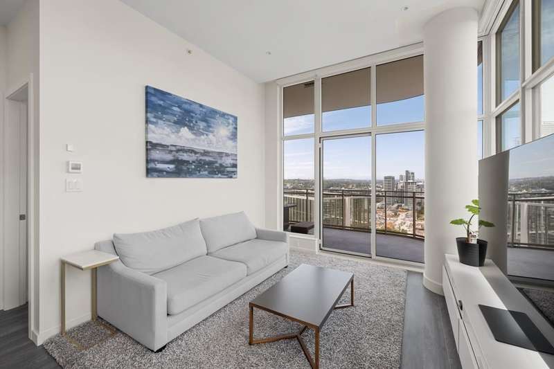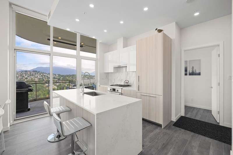 Stunning 2 Bed + Den, 2 Bath Sub-Penthouse in the heart of Brentwood! Bright corner unit with 10'5' ceilings, floor-to-ceiling windows, and panoramic NW city & mountain views. Chef's kitchen with gas stove & high-end appliances. Luxurious primary bathroom with soaker tub & glass shower. Comfort year-round with heat pump heating & A/C. 2 balconies totally 375 square feet, access from primary bedroom, kitchen and the living room. Includes 2 EV parking stalls & storage locker. Resort-style amenities: outdoor pool, hot tub, full gym. Steps to transit, Amazing Brentwood, and quick access to Hwy 1. Urban living at its finest! Open House Sun 2-4!
