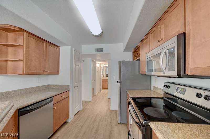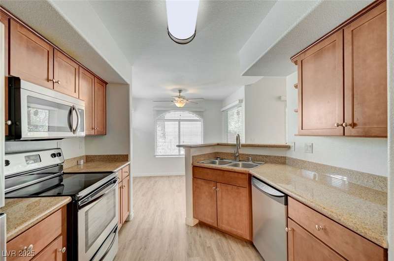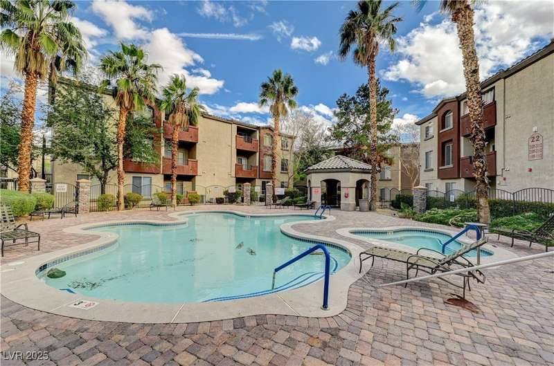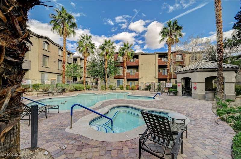 TURN-KEY condominium *COMPETITIVELY PRICED* located within the lovely gated community of Borgata, just outside of Spring Valley! Featuring 2 bedrooms complete w/ walk-in closets, ceiling fan/light combo, 2 full baths, *BRAND NEW$9K A/C UNIT INSTALLED THIS SPRING*Granite counter-tops, Luxury Vinyl Plank flooring throughout, wine rack and decorative shelving in the kitchen. S/S appliances included; refrigerator, microwave, dishwasher, stove, along w/ washer & dryer. Tons of natural light from the many windows make for a bright living area. Enjoy your view of the lush landscaping from your private balcony off the living room, or your spacious balcony by the entryway. The community offers a sparkling pool, spa, mini golf, fitness center, clubhouse, and pet walking areas. All conveniently located within minutes of the Las Vegas Strip, Chinatown, the airport, freeway access, parks, and endless options for dining, and shopping. Call now to schedule your private tour!