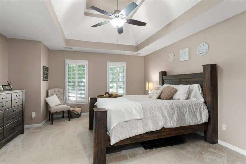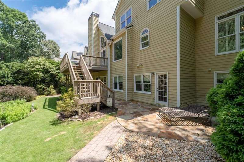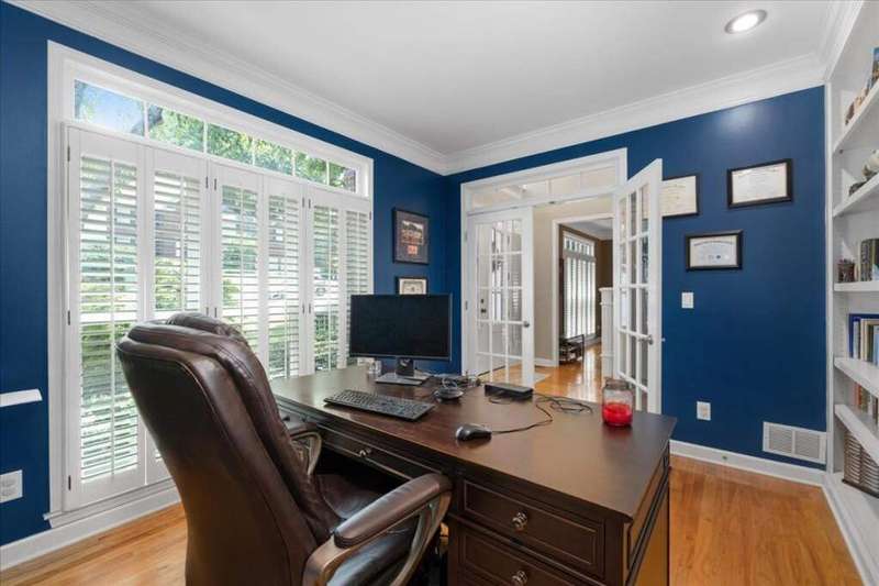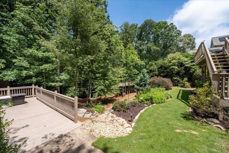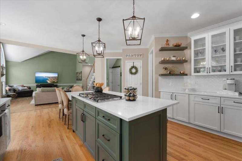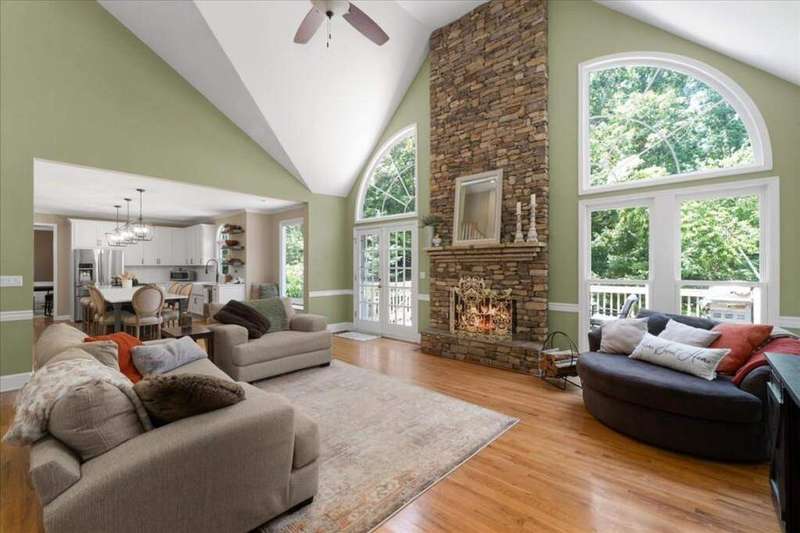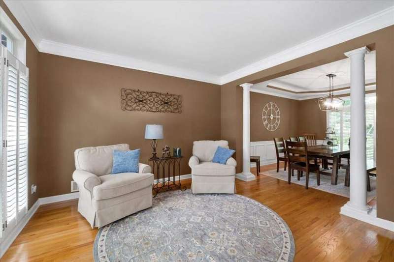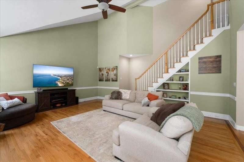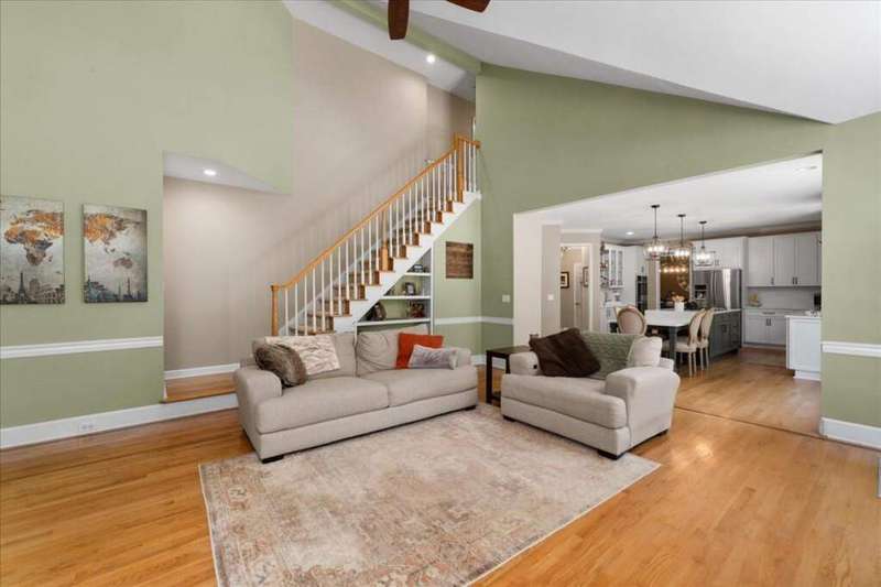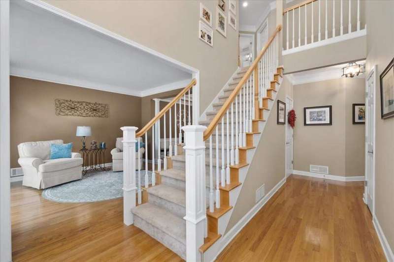 Welcome to this beautifully updated traditional home located in a vibrant neighborhood with resort-style amenities including swim, tennis, and pickleball. With 5 bedrooms, 3.5 baths, and a fully finished basement, this home offers exceptional space, charm, and functionality. Step into a stunning two-story foyer that sets the tone for the home's elegance. The main level features a private office with French doors and custom built-in bookshelves, a formal living room, and a formal dining room perfect for entertaining. The completely remodeled kitchen is a showstopper with brand-new cabinetry, quartz countertops, a farmhouse sink, gas cooktop, and an extended island with an attached dining table. The kitchen flows seamlessly into the vaulted family room, where a stacked stone fireplace creates a warm centerpiece. A convenient half bath completes the main floor. Retreat to the spacious primary suite featuring an oversized closet, dual vanities, and a spa-like bath with a separate tub and shower. Three additional bedrooms and a full bath provide plenty of space for family or guests. The full finished basement offers incredible flexibility, complete with a bedroom, full bath, large living area, full kitchen, and ample storage perfect for multi-generational living, an in-law suite, or entertaining. The backyard is a private sanctuary with multiple levels to enjoy. Two decks overlook a beautifully landscaped yard, where a charming bridge and winding paths lead to a stone patio ideal for relaxing evenings or gathering around a fire pit. The level front yard adds to the home's curb appeal.Situated in an award-winning school district, this home combines everyday convenience with community lifestyle amenities.