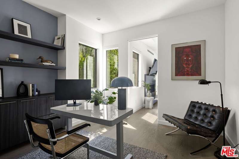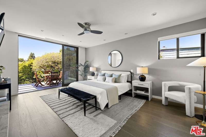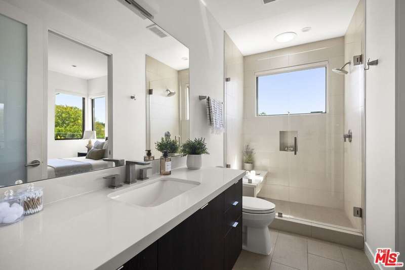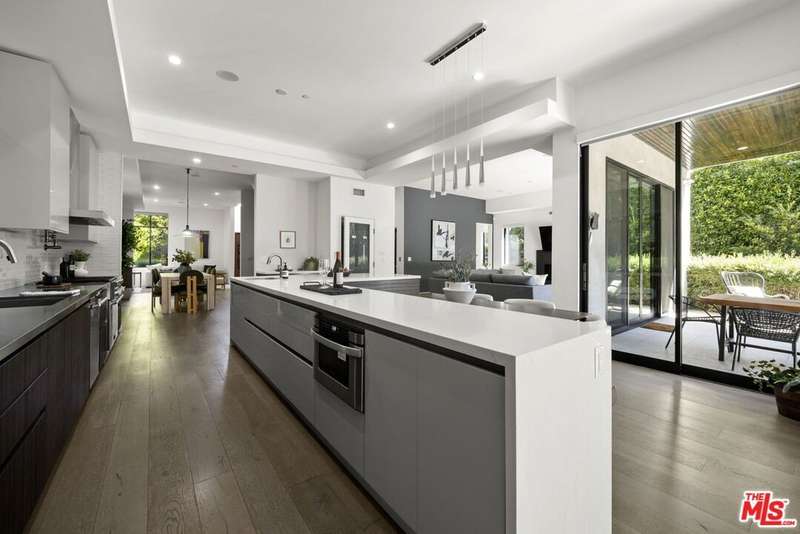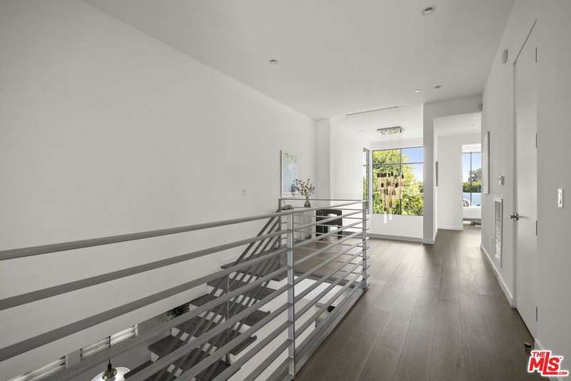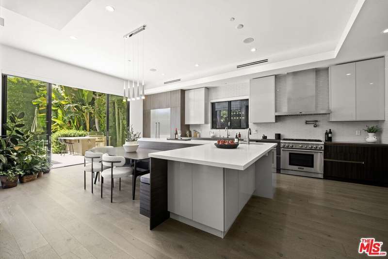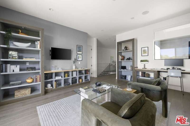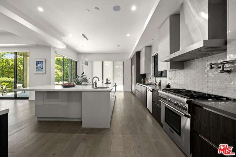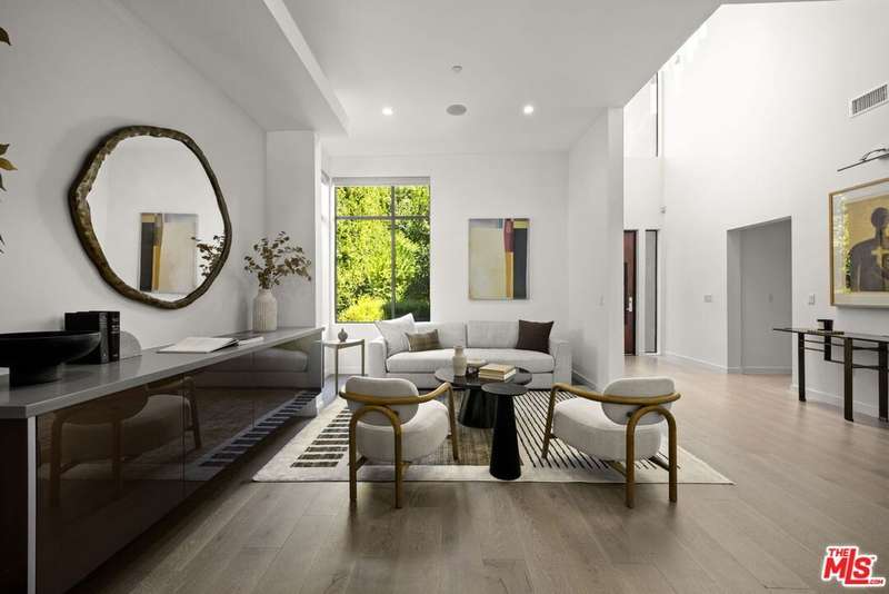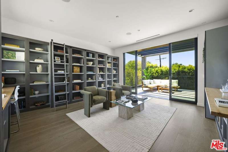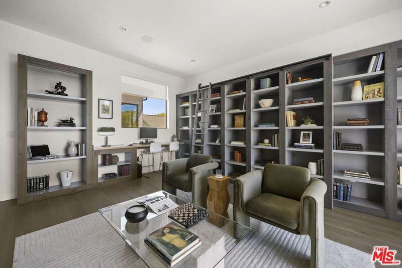 Striking, newer contemporary in one of Brentwood's prime locations. This quality home sits on an 8,000+ flat lot with a private and resort style back yard with a pool, free standing spa, outdoor shower and a built in BBQ station. The home features 4 bedroom suites, plus a separate office and wonderful library or additional family room. The lower level comprises the living room, dining room, dedicated office and great room/kitchen combo with walls of glass that open up to the outdoors. There is also one bedroom suite, a laundry room and 2 car garage with direct access. The upper level comprises an additional 3 bedroom suites and the library or family room with sliding walls of glass to a huge patio overlooking the lush back yard. Incredible kitchen with top of the line Thermador appliances, and a wonderful L-shaped island with a breakfast nook with built in bench seating and a walk-in pantry. The adjoining family room has a fireplace and sliding doors out to the covered patio. The primary bedroom has a fireplace, a large walk-in closet and luxurious bathroom with walk-in shower and free-standing tub. This amazing property boast high ceilings throughout, wood floors, an elevator, owned solar panels with Tesla power storage walls, 2 zone HVAC, built in speakers and an automated pool cover.