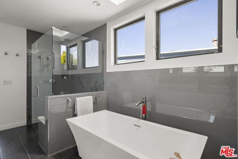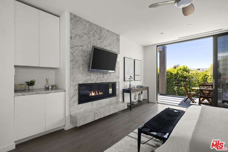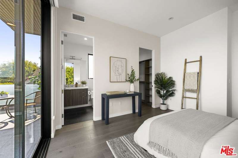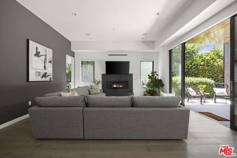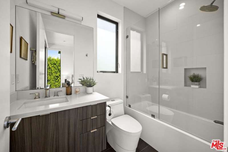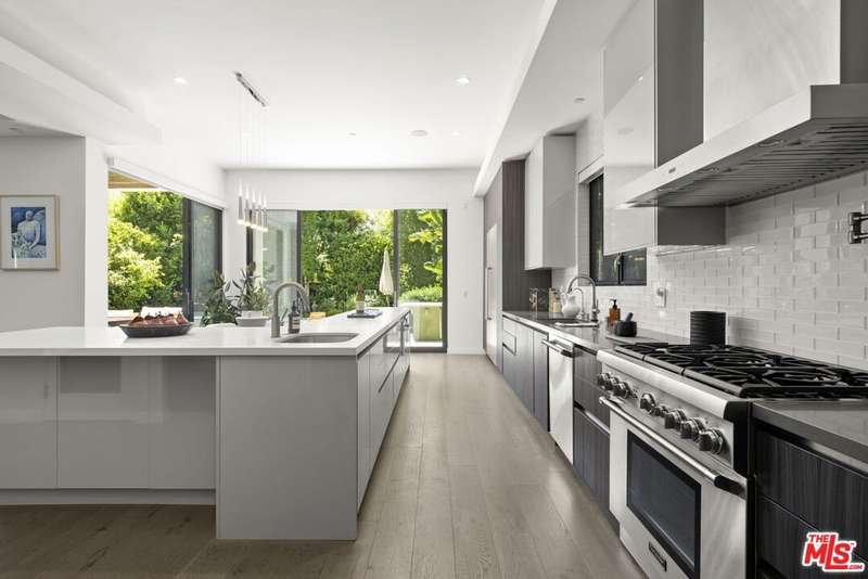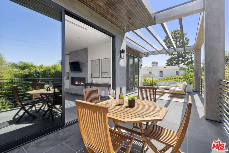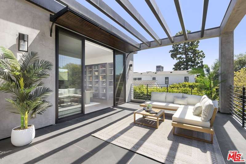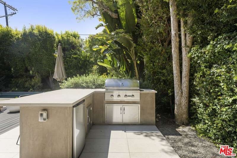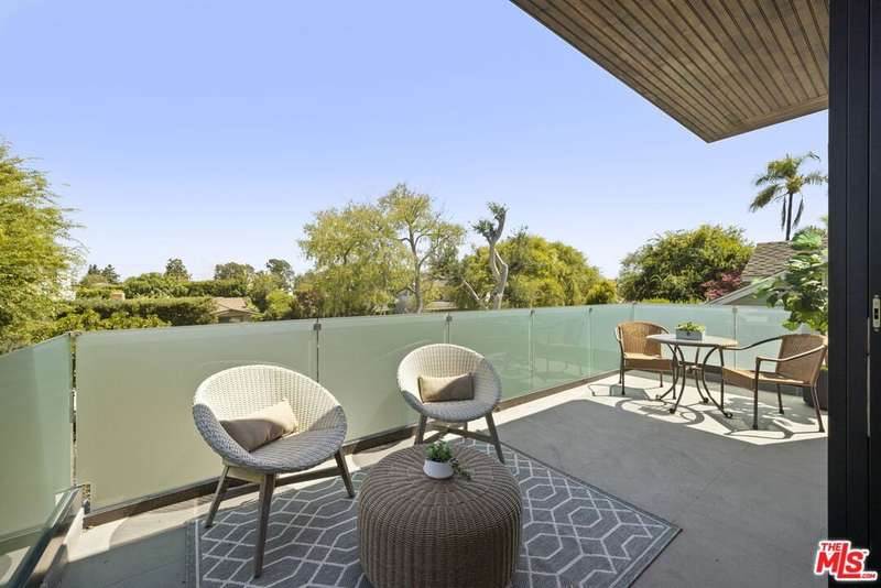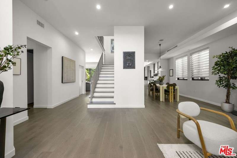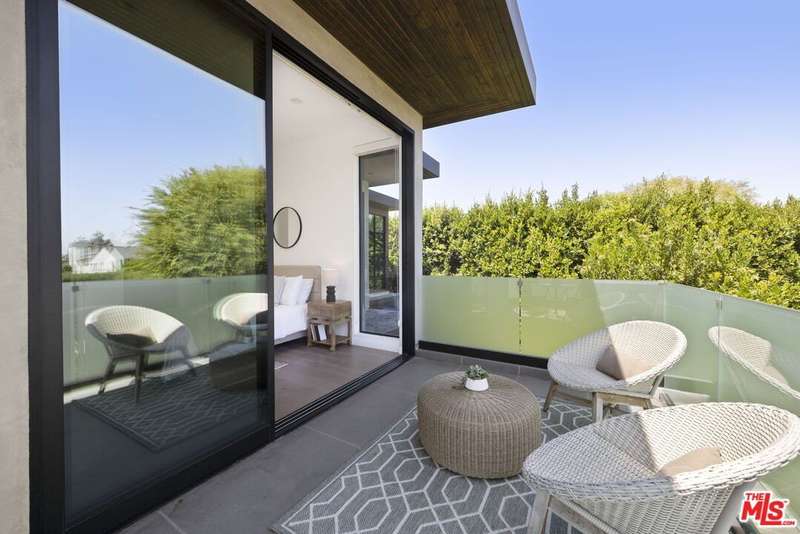 Striking, newer contemporary in one of Brentwood's prime locations. This quality home sits on an 8,000+ flat lot with a private and resort style back yard with a pool, free standing spa, outdoor shower and a built in BBQ station. The home features 4 bedroom suites, plus a separate office and wonderful library or additional family room. The lower level comprises the living room, dining room, dedicated office and great room/kitchen combo with walls of glass that open up to the outdoors. There is also one bedroom suite, a laundry room and 2 car garage with direct access. The upper level comprises an additional 3 bedroom suites and the library or family room with sliding walls of glass to a huge patio overlooking the lush back yard. Incredible kitchen with top of the line Thermador appliances, and a wonderful L-shaped island with a breakfast nook with built in bench seating and a walk-in pantry. The adjoining family room has a fireplace and sliding doors out to the covered patio. The primary bedroom has a fireplace, a large walk-in closet and luxurious bathroom with walk-in shower and free-standing tub. This amazing property boast high ceilings throughout, wood floors, an elevator, owned solar panels with Tesla power storage walls, 2 zone HVAC, built in speakers and an automated pool cover.