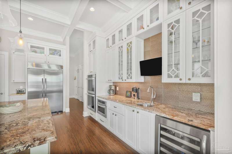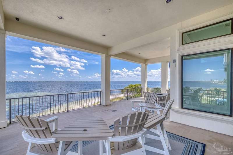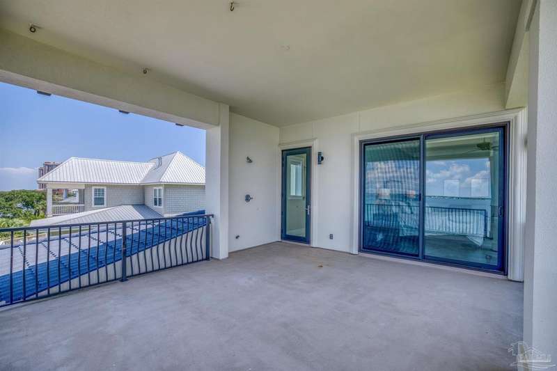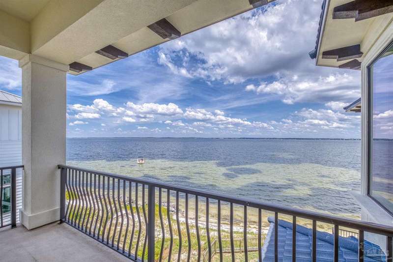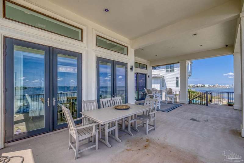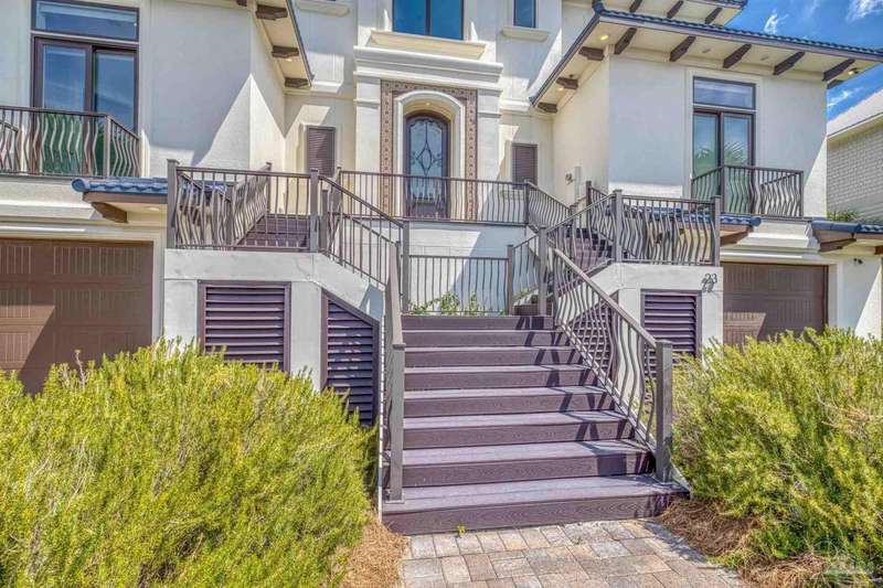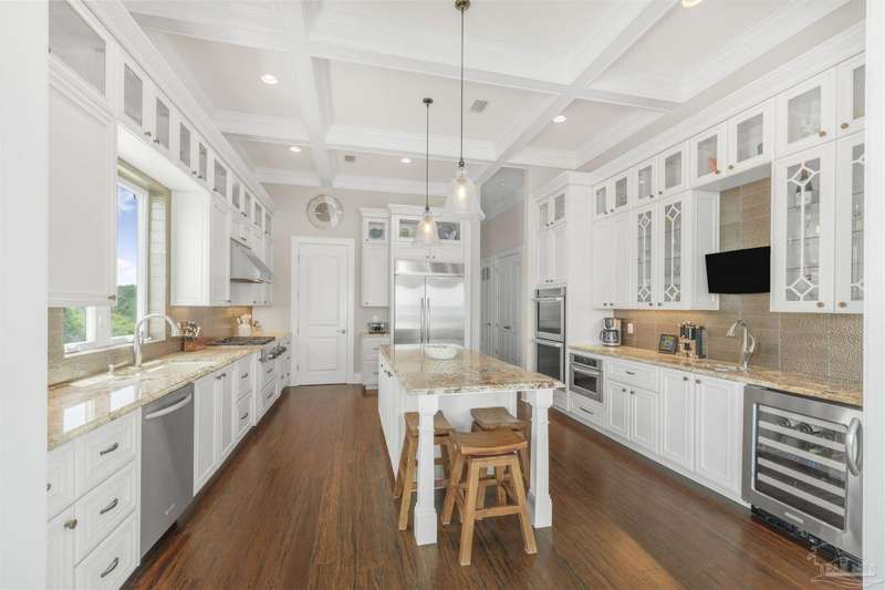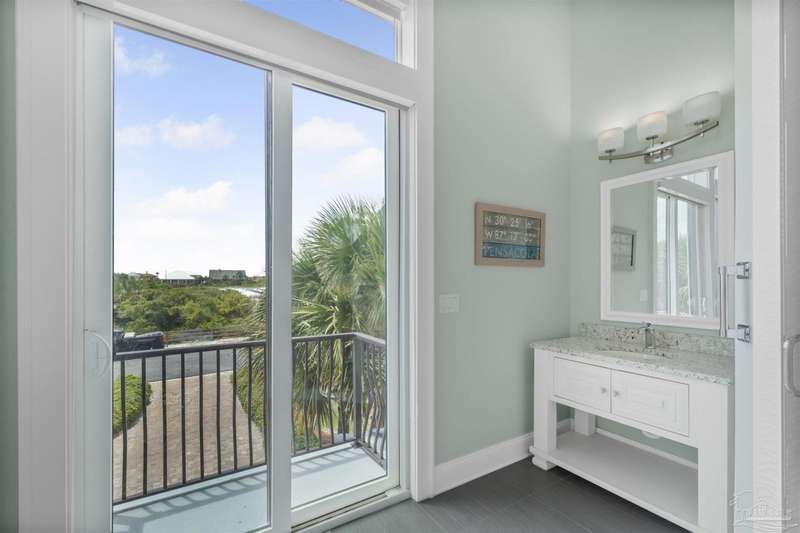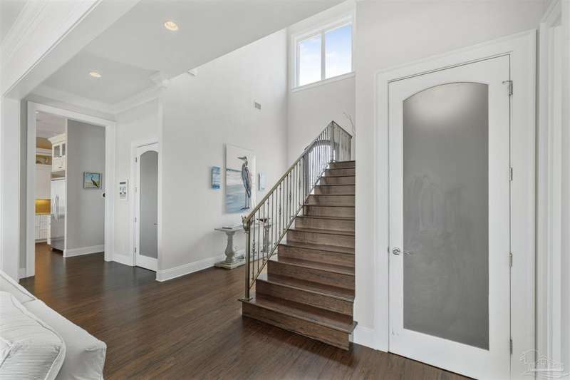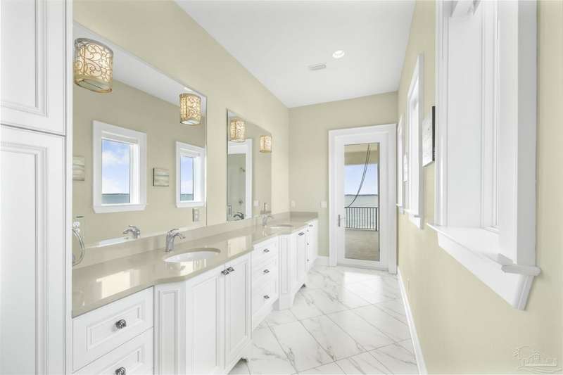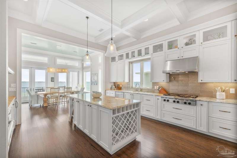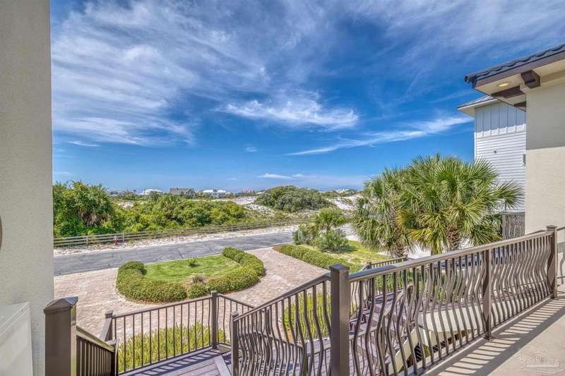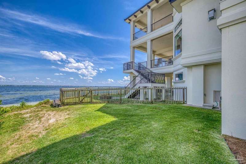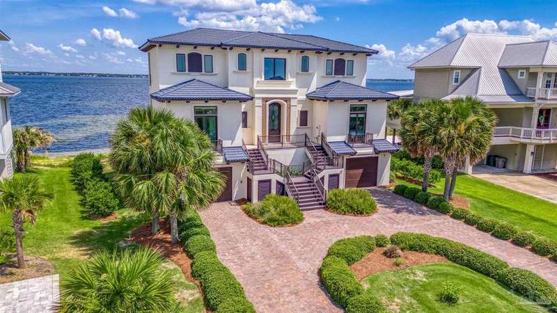 Magnificent custom beach home with breathtaking views of the white sandy beach and the tranquil Intracoastal Waterway. Walls of glass and multiple spacious balconies invite natural light and showcase the stunning coastal surroundings. An 8-foot solid wood entry door with intricate iron and tile work sets the tone for this one-of-a-kind residence. Guests are welcomed by a dramatic 22-foot foyer and grand staircase that opens into a spectacular two-story great room, featuring bamboo flooring, a sleek linear gas fireplace, and custom built-ins that conceal an integrated surround sound system. Designer details abound throughout: frosted glass elevator door, custom ironwork, triple crown molding, 8-foot interior doors, elegant trim, designer lighting, and premium tile, granite, Vetrazzo, and Cambria countertops. The chef's kitchen includes Delicatis Gold granite, custom cabinetry, a built-in KitchenAid refrigerator, gas cooktop, double ovens, microwave drawer, and wine cooler. Lighted upper cabinets and crown molding accentuate a coffered ceiling, while the dining area provides panoramic shoreline views. The home offers four spacious bedrooms, each with its own bathroom and private balcony. A second guest suite and full bath with dramatic silver tile, plus a built in bunk room are located on the main level. Upstairs, the luxurious primary suite features wood floors, a private balcony with an outdoor shower and a spa-like bath with quartz counters, marble tile, double vanities, jetted tub, oversized glass shower with dual shower heads and rain head feature, two walk-in closets. A fourth ensuite bedroom and a laundry room with a view of the Sugar Bowl preserve complete the upper level. The ground floor provides extensive parking for up to six vehicles, ample storage and a covered entertaining area. Built with high-quality, storm-ready materials including Jeld-Wen CWS triple-pane impact glass windows and a 50-year Decra metal roof.