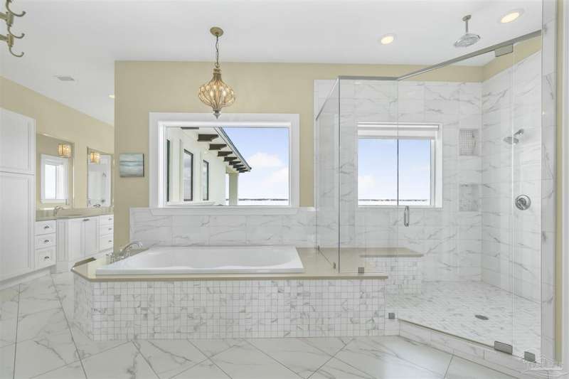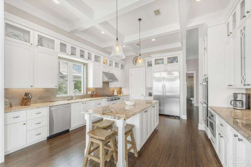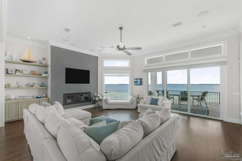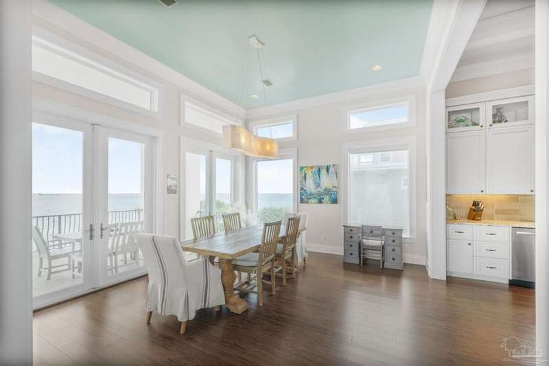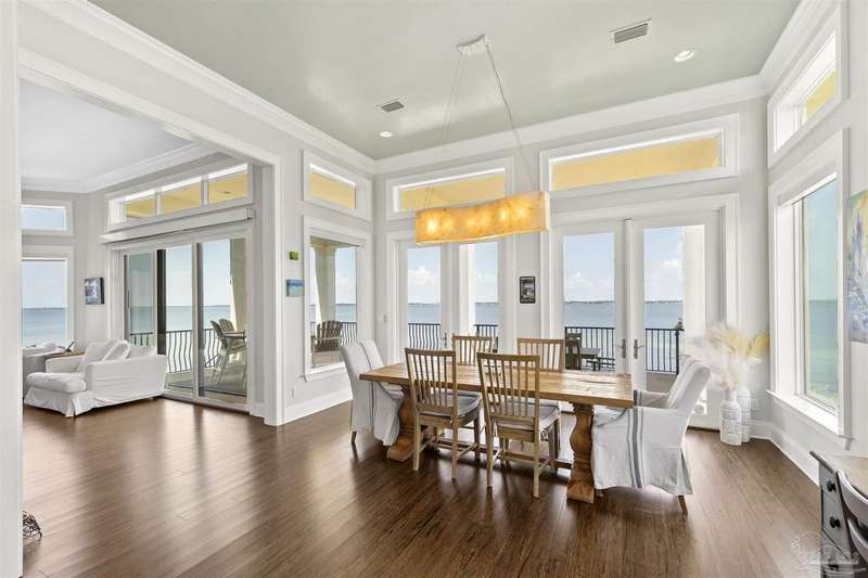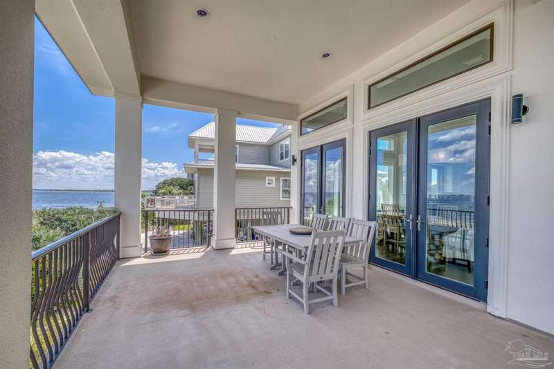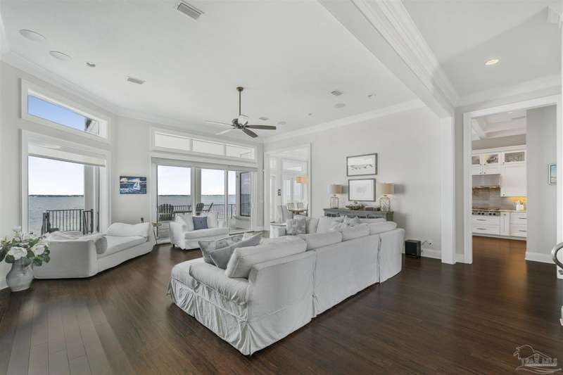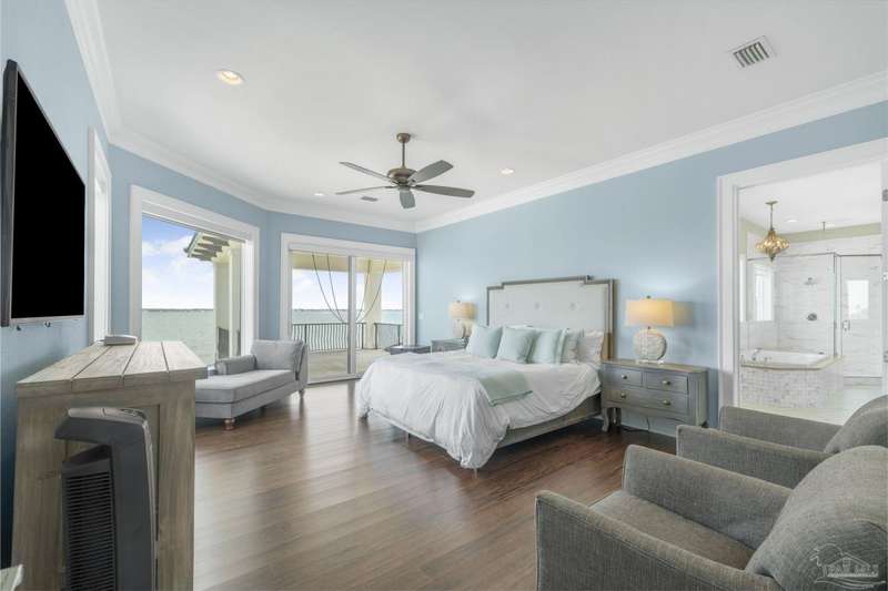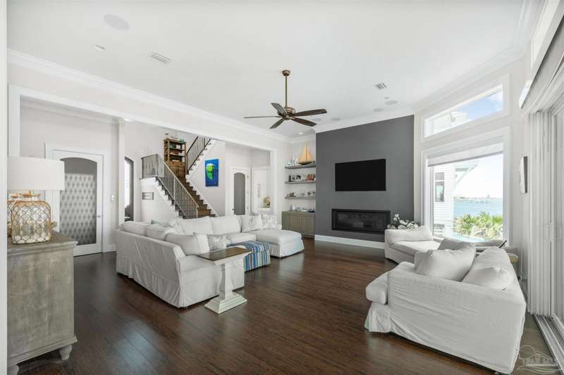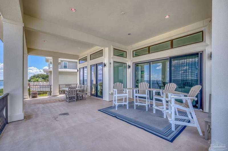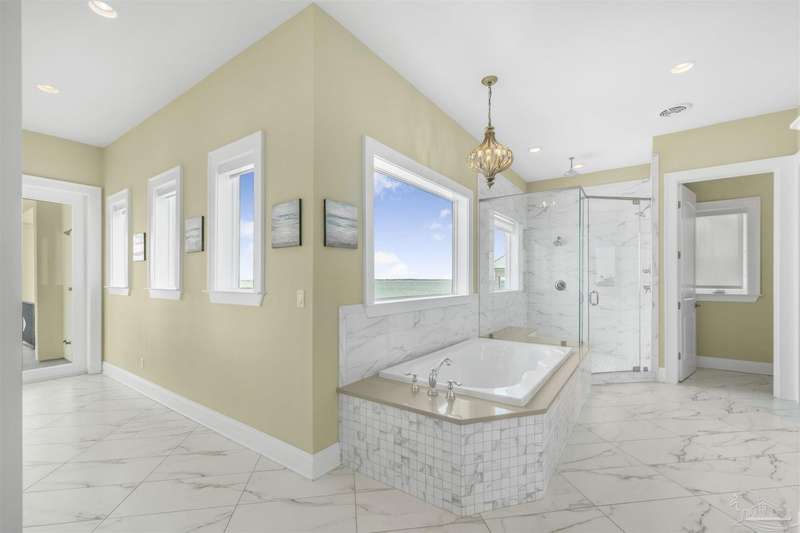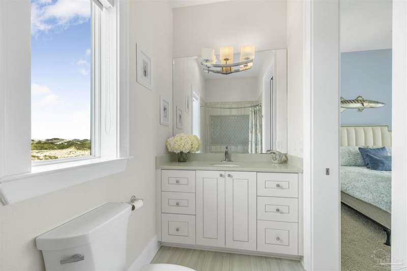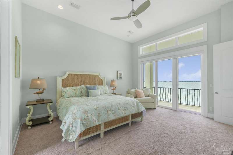 Magnificent custom beach home with breathtaking views of the white sandy beach and the tranquil Intracoastal Waterway. Walls of glass and multiple spacious balconies invite natural light and showcase the stunning coastal surroundings. An 8-foot solid wood entry door with intricate iron and tile work sets the tone for this one-of-a-kind residence. Guests are welcomed by a dramatic 22-foot foyer and grand staircase that opens into a spectacular two-story great room, featuring bamboo flooring, a sleek linear gas fireplace, and custom built-ins that conceal an integrated surround sound system. Designer details abound throughout: frosted glass elevator door, custom ironwork, triple crown molding, 8-foot interior doors, elegant trim, designer lighting, and premium tile, granite, Vetrazzo, and Cambria countertops. The chef's kitchen includes Delicatis Gold granite, custom cabinetry, a built-in KitchenAid refrigerator, gas cooktop, double ovens, microwave drawer, and wine cooler. Lighted upper cabinets and crown molding accentuate a coffered ceiling, while the dining area provides panoramic shoreline views. The home offers four spacious bedrooms, each with its own bathroom and private balcony. A second guest suite and full bath with dramatic silver tile, plus a built in bunk room are located on the main level. Upstairs, the luxurious primary suite features wood floors, a private balcony with an outdoor shower and a spa-like bath with quartz counters, marble tile, double vanities, jetted tub, oversized glass shower with dual shower heads and rain head feature, two walk-in closets. A fourth ensuite bedroom and a laundry room with a view of the Sugar Bowl preserve complete the upper level. The ground floor provides extensive parking for up to six vehicles, ample storage and a covered entertaining area. Built with high-quality, storm-ready materials including Jeld-Wen CWS triple-pane impact glass windows and a 50-year Decra metal roof.