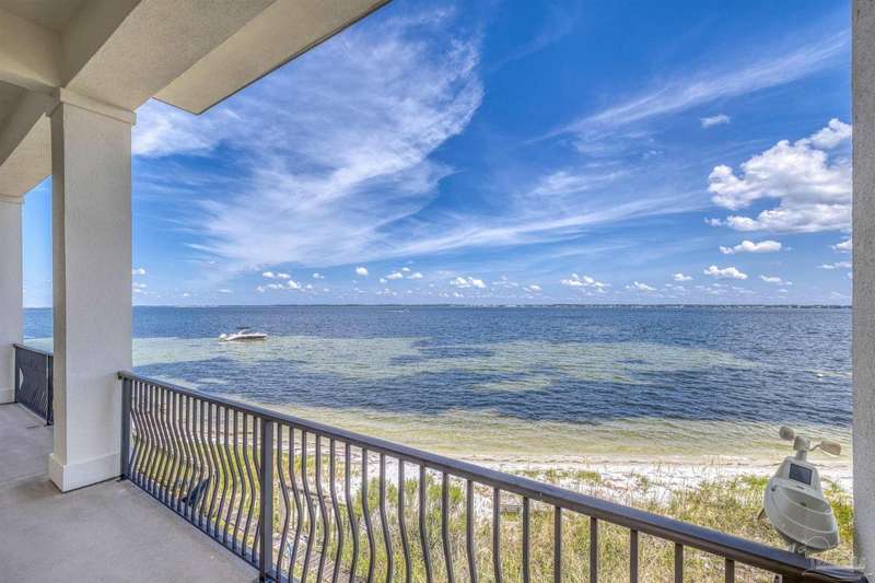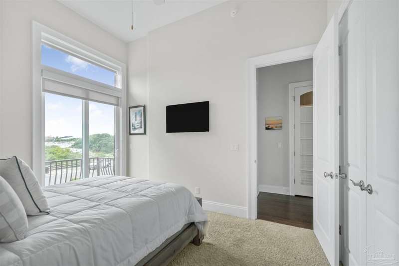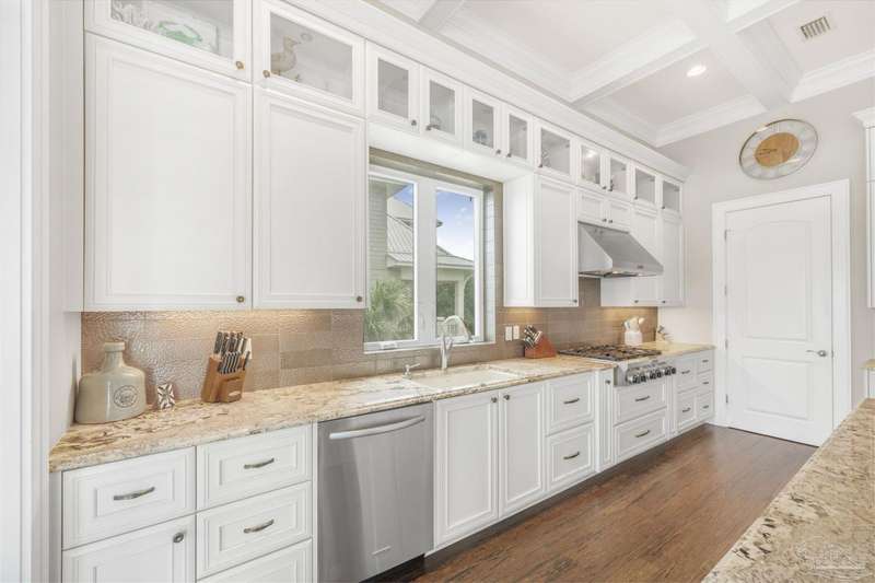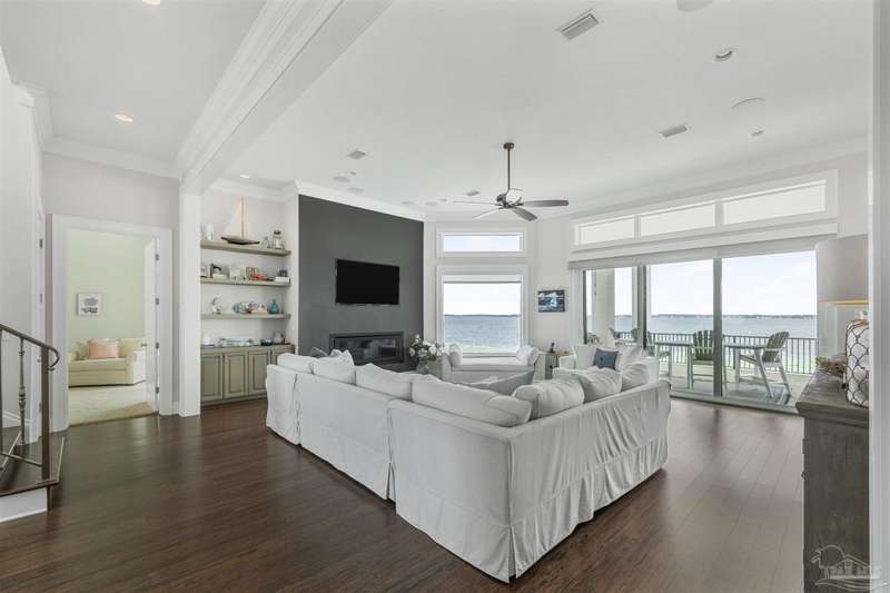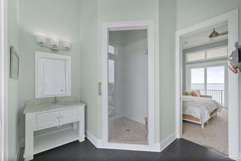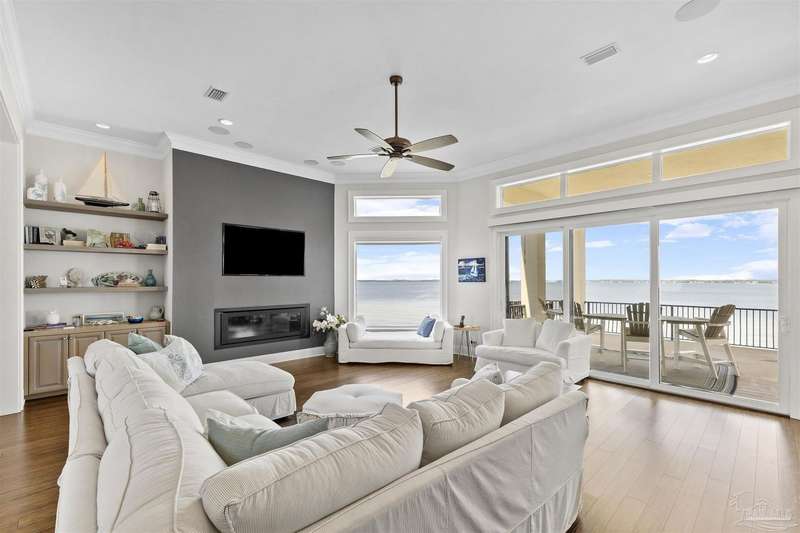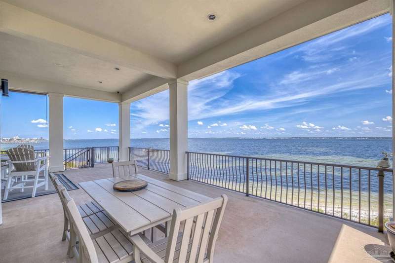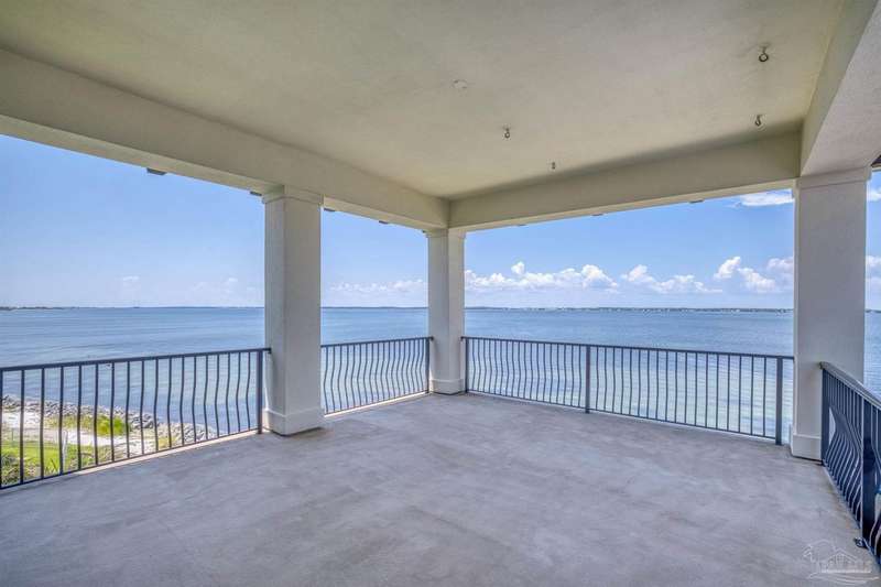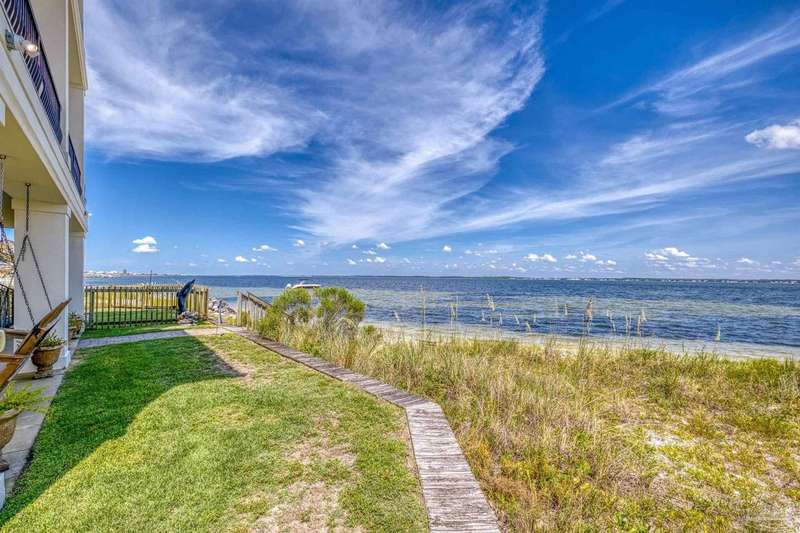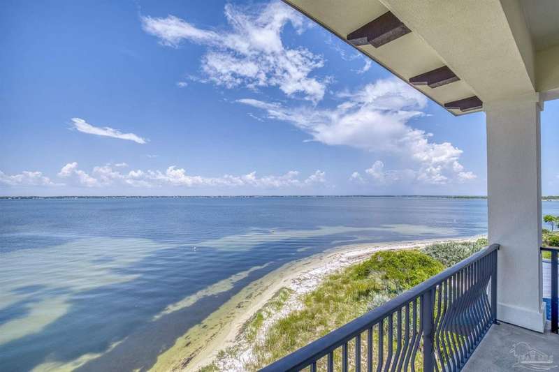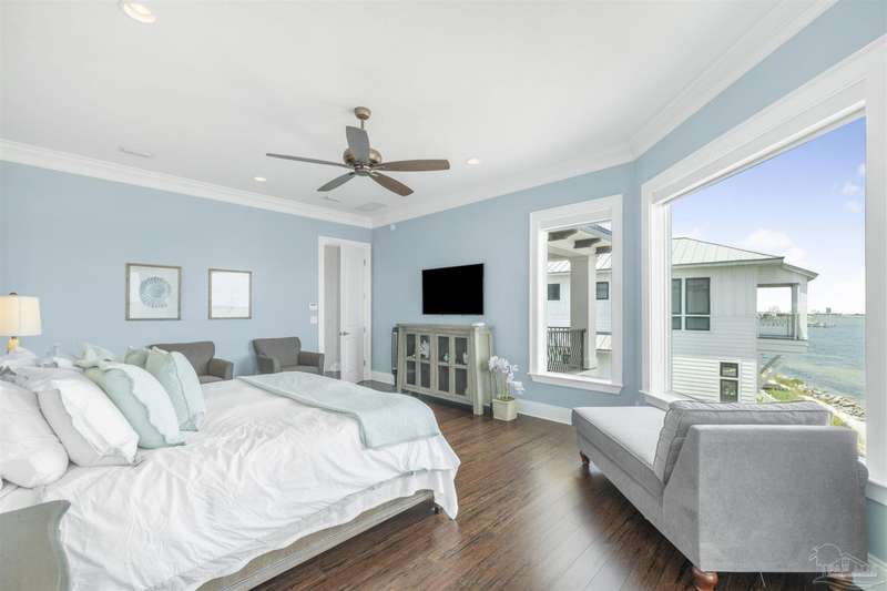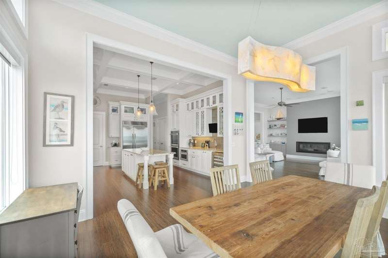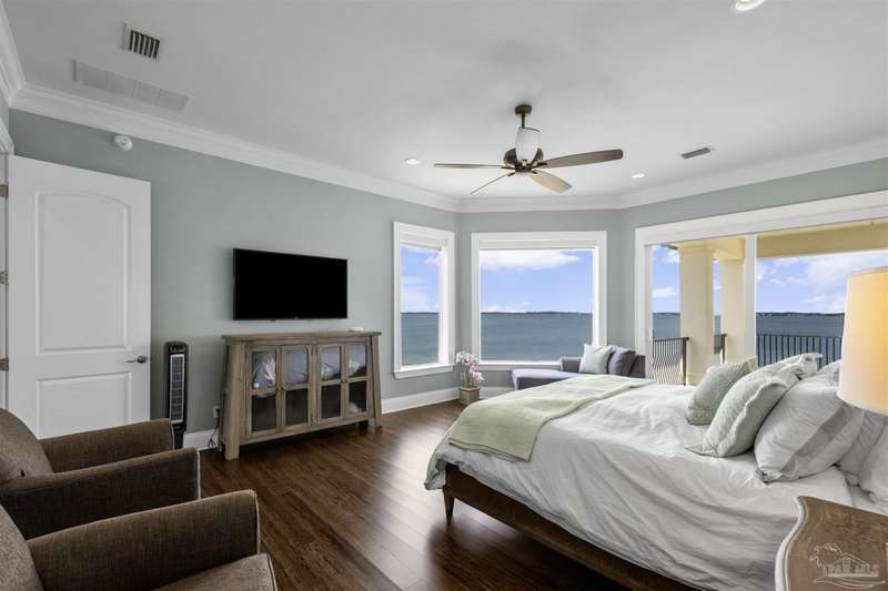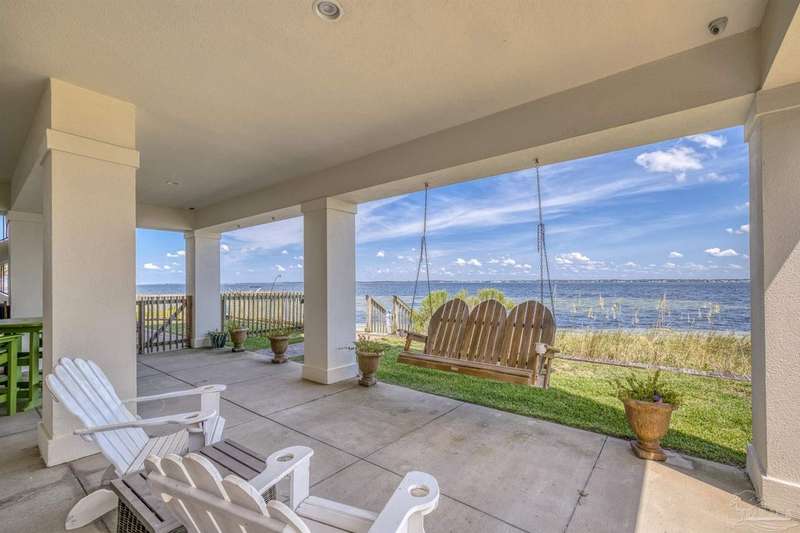 Magnificent custom beach home with breathtaking views of the white sandy beach and the tranquil Intracoastal Waterway. Walls of glass and multiple spacious balconies invite natural light and showcase the stunning coastal surroundings. An 8-foot solid wood entry door with intricate iron and tile work sets the tone for this one-of-a-kind residence. Guests are welcomed by a dramatic 22-foot foyer and grand staircase that opens into a spectacular two-story great room, featuring bamboo flooring, a sleek linear gas fireplace, and custom built-ins that conceal an integrated surround sound system. Designer details abound throughout: frosted glass elevator door, custom ironwork, triple crown molding, 8-foot interior doors, elegant trim, designer lighting, and premium tile, granite, Vetrazzo, and Cambria countertops. The chef's kitchen includes Delicatis Gold granite, custom cabinetry, a built-in KitchenAid refrigerator, gas cooktop, double ovens, microwave drawer, and wine cooler. Lighted upper cabinets and crown molding accentuate a coffered ceiling, while the dining area provides panoramic shoreline views. The home offers four spacious bedrooms, each with its own bathroom and private balcony. A second guest suite and full bath with dramatic silver tile, plus a built in bunk room are located on the main level. Upstairs, the luxurious primary suite features wood floors, a private balcony with an outdoor shower and a spa-like bath with quartz counters, marble tile, double vanities, jetted tub, oversized glass shower with dual shower heads and rain head feature, two walk-in closets. A fourth ensuite bedroom and a laundry room with a view of the Sugar Bowl preserve complete the upper level. The ground floor provides extensive parking for up to six vehicles, ample storage and a covered entertaining area. Built with high-quality, storm-ready materials including Jeld-Wen CWS triple-pane impact glass windows and a 50-year Decra metal roof.