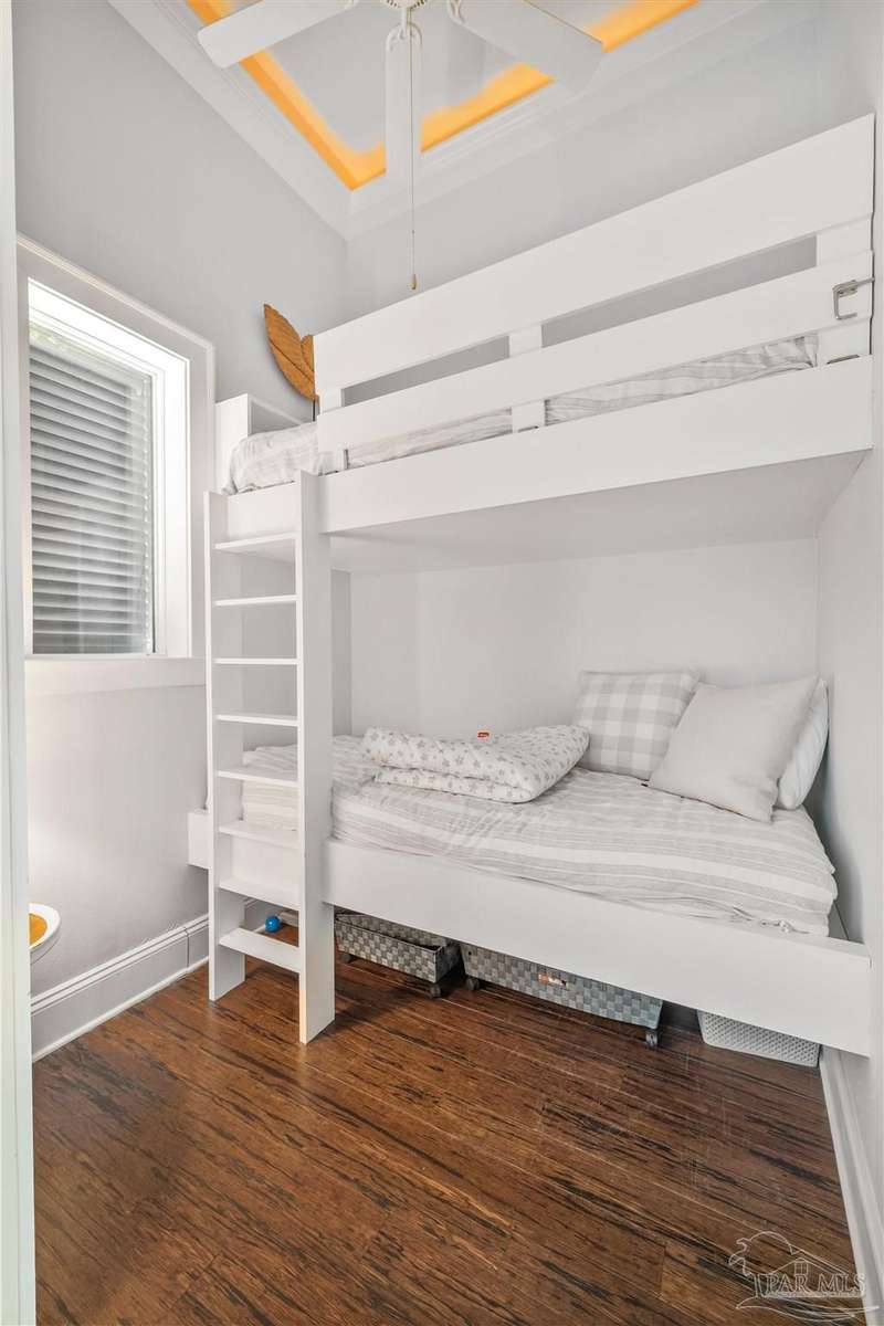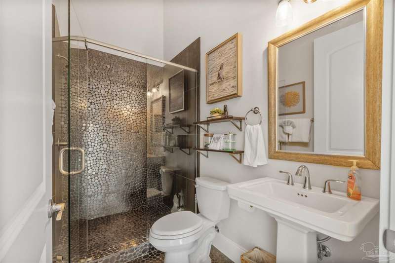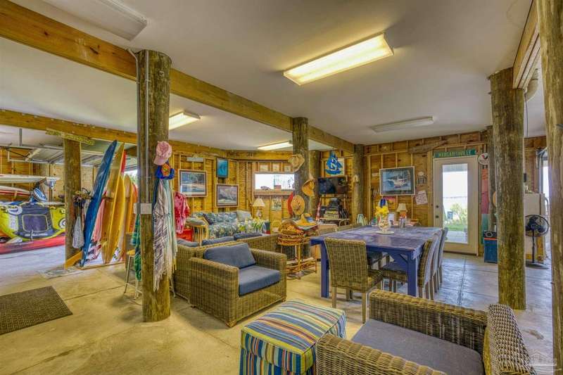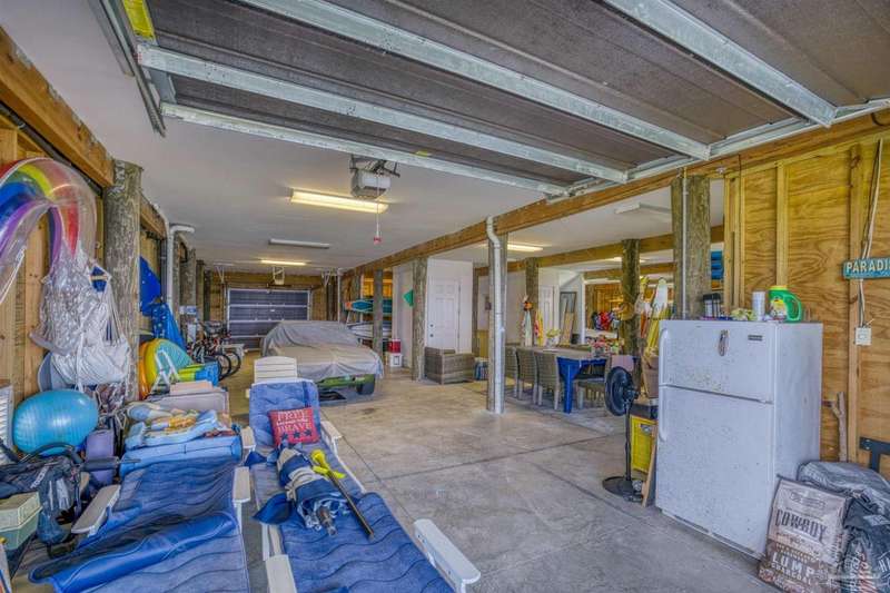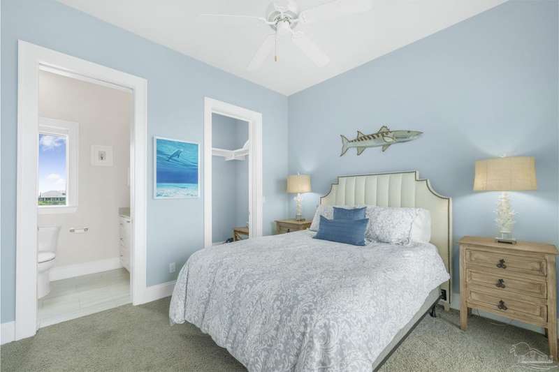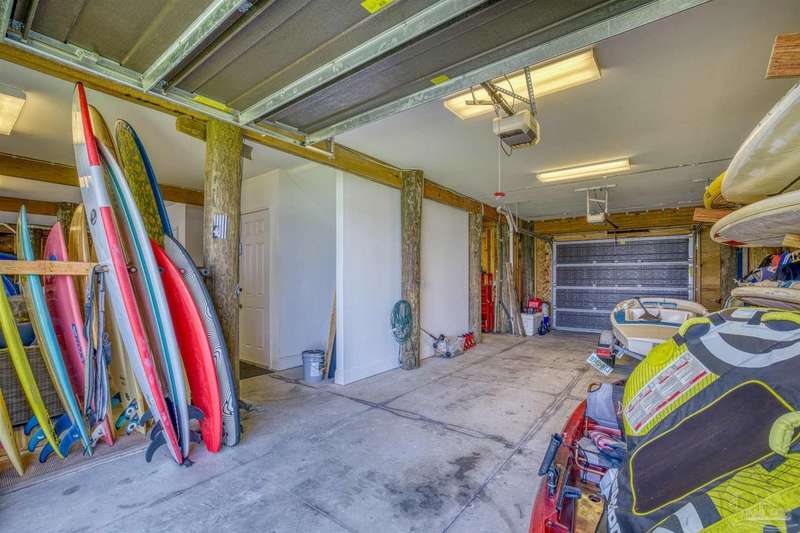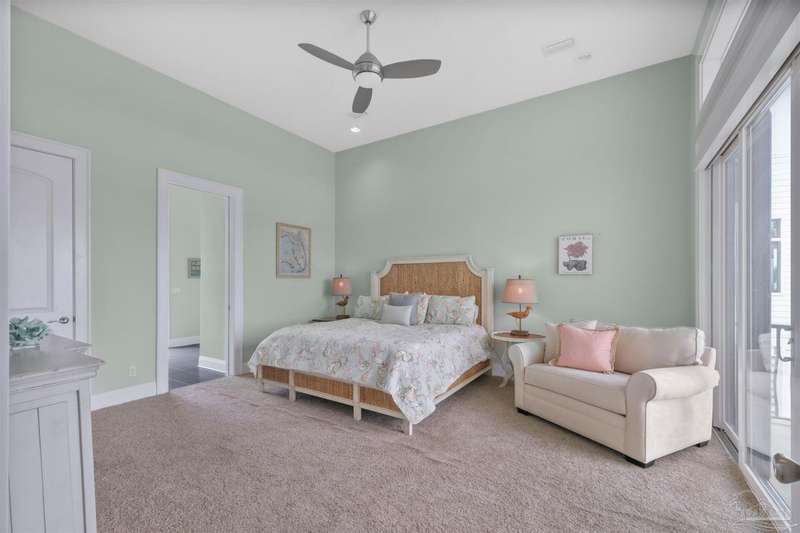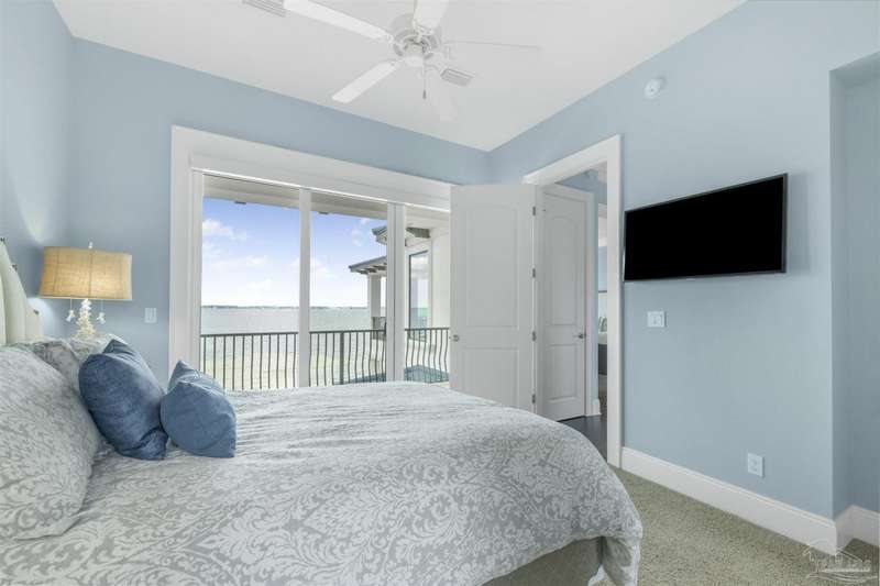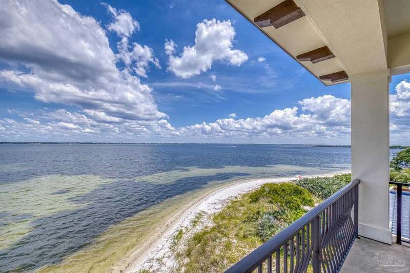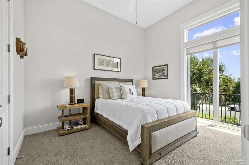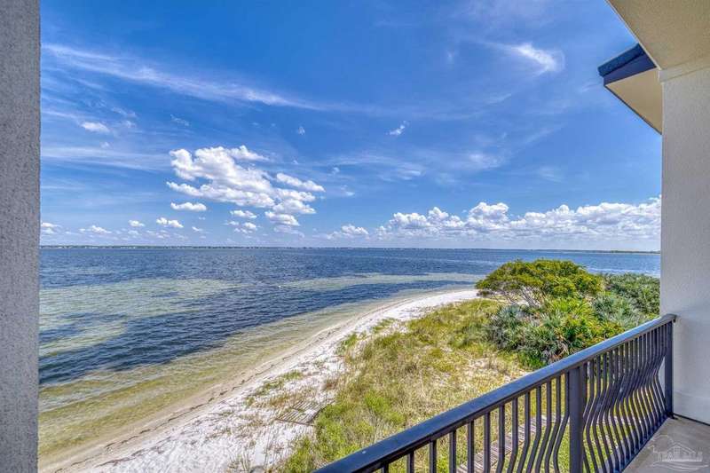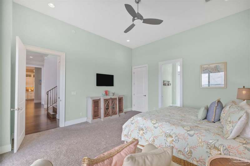 Magnificent custom beach home with breathtaking views of the white sandy beach and the tranquil Intracoastal Waterway. Walls of glass and multiple spacious balconies invite natural light and showcase the stunning coastal surroundings. An 8-foot solid wood entry door with intricate iron and tile work sets the tone for this one-of-a-kind residence. Guests are welcomed by a dramatic 22-foot foyer and grand staircase that opens into a spectacular two-story great room, featuring bamboo flooring, a sleek linear gas fireplace, and custom built-ins that conceal an integrated surround sound system. Designer details abound throughout: frosted glass elevator door, custom ironwork, triple crown molding, 8-foot interior doors, elegant trim, designer lighting, and premium tile, granite, Vetrazzo, and Cambria countertops. The chef's kitchen includes Delicatis Gold granite, custom cabinetry, a built-in KitchenAid refrigerator, gas cooktop, double ovens, microwave drawer, and wine cooler. Lighted upper cabinets and crown molding accentuate a coffered ceiling, while the dining area provides panoramic shoreline views. The home offers four spacious bedrooms, each with its own bathroom and private balcony. A second guest suite and full bath with dramatic silver tile, plus a built in bunk room are located on the main level. Upstairs, the luxurious primary suite features wood floors, a private balcony with an outdoor shower and a spa-like bath with quartz counters, marble tile, double vanities, jetted tub, oversized glass shower with dual shower heads and rain head feature, two walk-in closets. A fourth ensuite bedroom and a laundry room with a view of the Sugar Bowl preserve complete the upper level. The ground floor provides extensive parking for up to six vehicles, ample storage and a covered entertaining area. Built with high-quality, storm-ready materials including Jeld-Wen CWS triple-pane impact glass windows and a 50-year Decra metal roof.