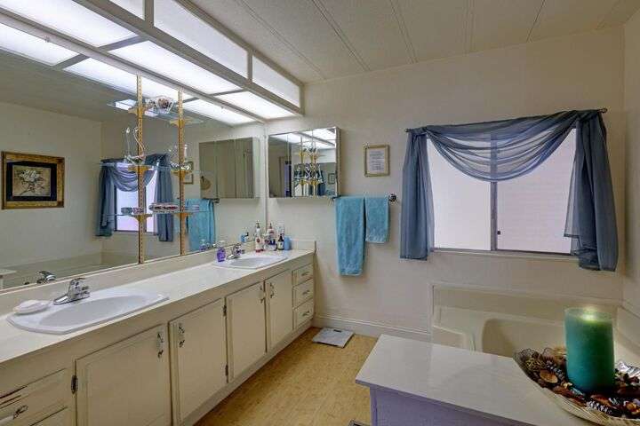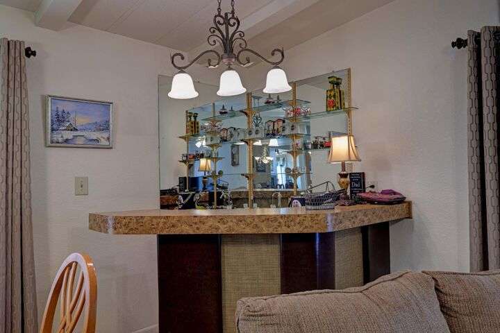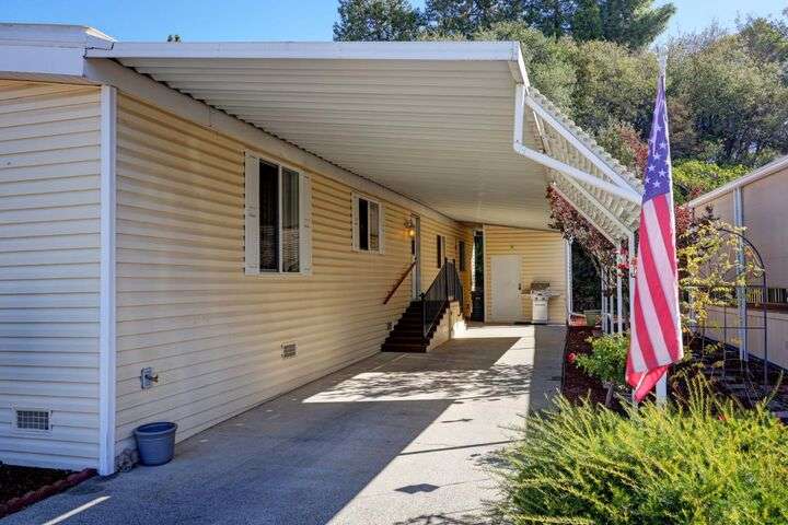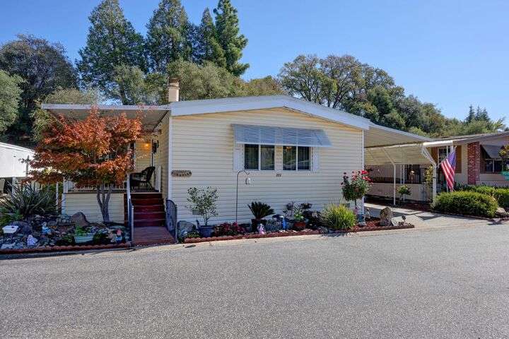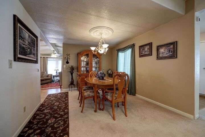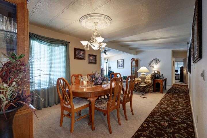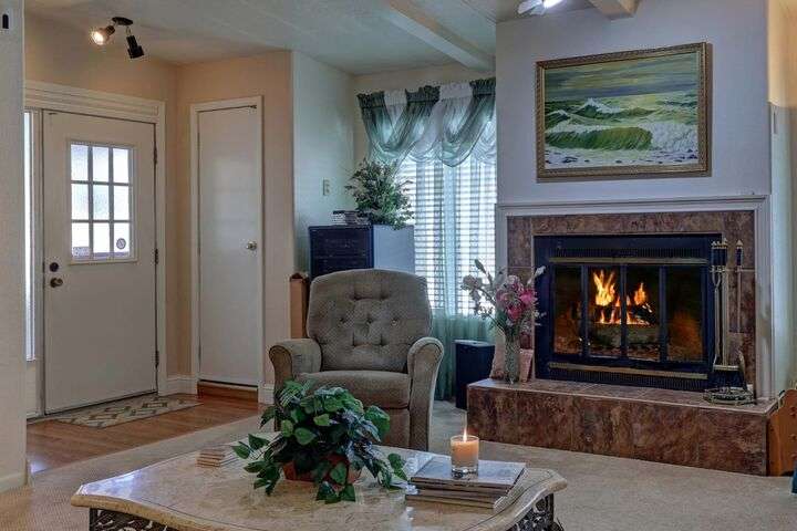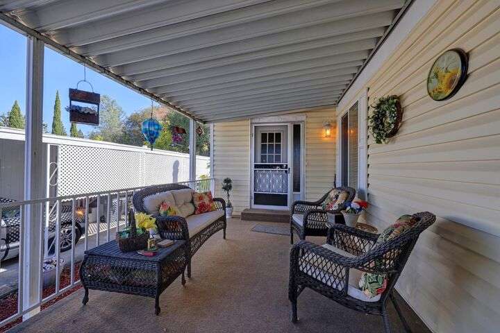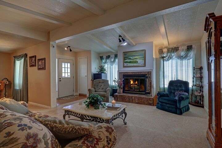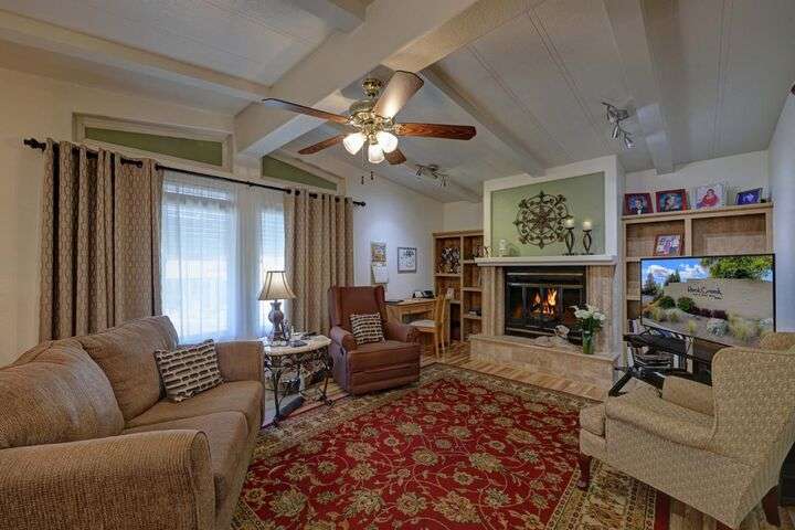Step into elegance and comfort in this exceptionally large & beautifully appointed manufactured home nestled within a peaceful 55+ senior park. From the moment you arrive, you'll be captivated by its charming curb appeal & welcoming front porch perfect for morning coffee or evening chats. Inside, the open-concept layout boasts soaring ceilings, abundant natural light & carefully thought out finishes throughout. The gourmet kitchen features sleek countertops, custom cabinetry, and modern appliances ideal for entertaining or quiet nights in. A generous living room boasts a fireplace and flows seamlessly into a formal dining area, creating a perfect space for gatherings. The spacious den off the kitchen offers a wet bar, fireplace & room for everyday dining. The primary suite is a true sanctuary, complete with a luxurious en-suite bath and ample closet space. Additional bedroom offer flexibility for guests, hobbies, or a home office. The extra large laundry room has a counter for folding clothes and lots of cabinets. Located in a highly desirable Rock Creek Mobile Home park with amenities like 2 clubhouses, pool, and social activities, this home offers both beauty and lifestyle. Whether you're downsizing or upgrading, this gem is a rare find that blends style, space, and serenit