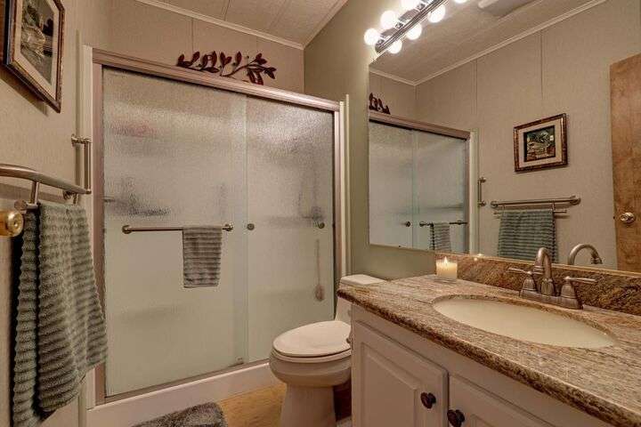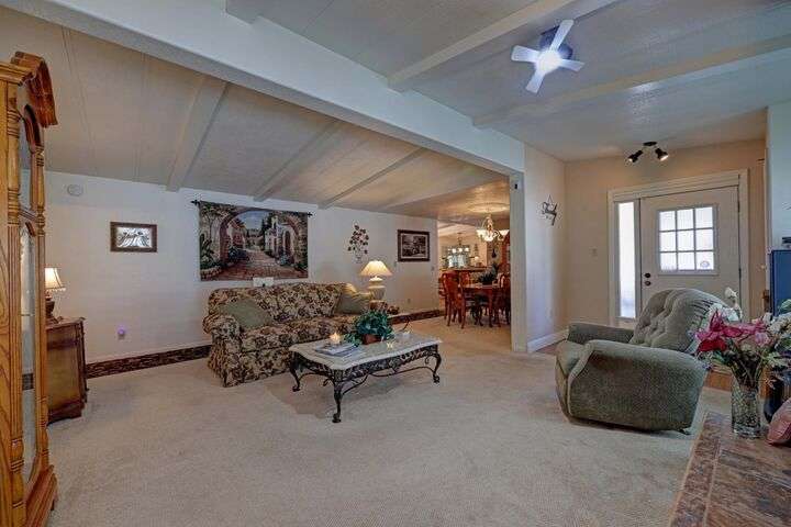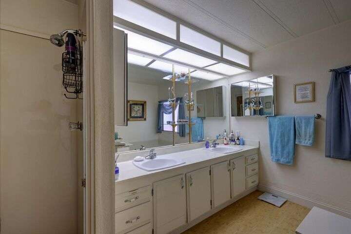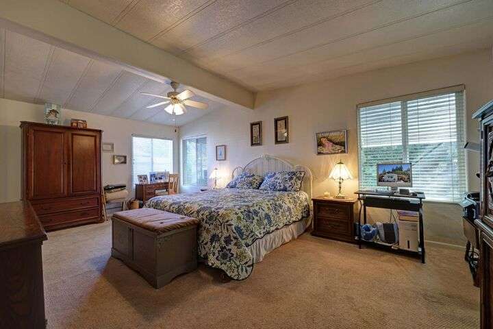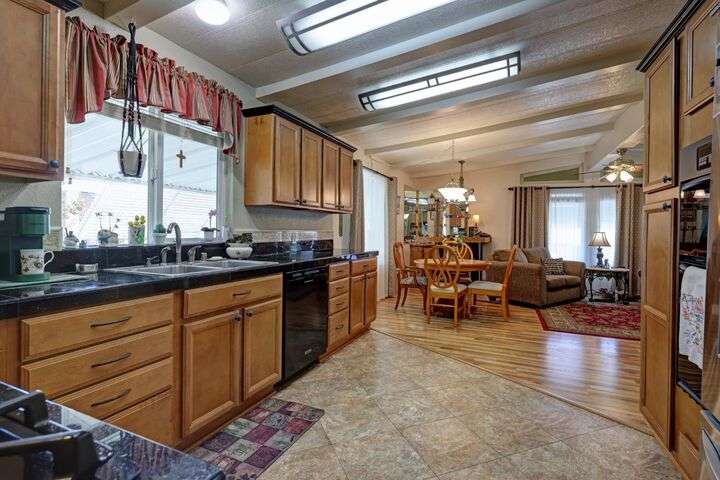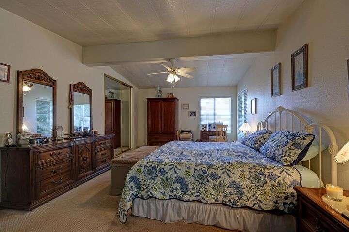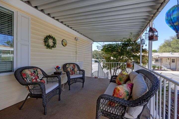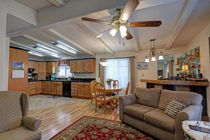 Step into elegance and comfort in this exceptionally large & beautifully appointed manufactured home nestled within a peaceful 55+ senior park. From the moment you arrive, you'll be captivated by its charming curb appeal & welcoming front porch perfect for morning coffee or evening chats. Inside, the open-concept layout boasts soaring ceilings, abundant natural light & carefully thought out finishes throughout. The gourmet kitchen features sleek countertops, custom cabinetry, and modern appliances ideal for entertaining or quiet nights in. A generous living room boasts a fireplace and flows seamlessly into a formal dining area, creating a perfect space for gatherings. The spacious den off the kitchen offers a wet bar, fireplace & room for everyday dining. The primary suite is a true sanctuary, complete with a luxurious en-suite bath and ample closet space. Additional bedroom offer flexibility for guests, hobbies, or a home office. The extra large laundry room has a counter for folding clothes and lots of cabinets. Located in a highly desirable Rock Creek Mobile Home park with amenities like 2 clubhouses, pool, and social activities, this home offers both beauty and lifestyle. Whether you're downsizing or upgrading, this gem is a rare find that blends style, space, and serenit
