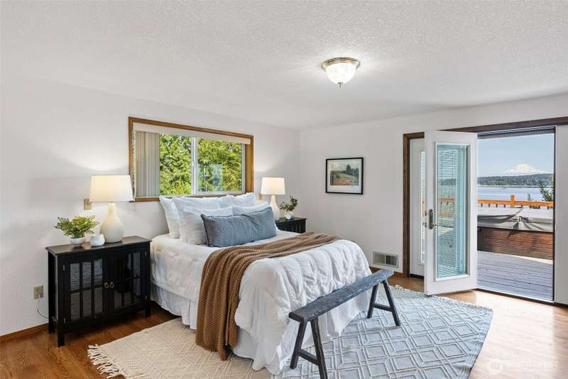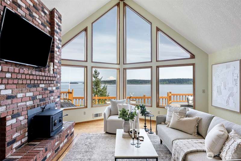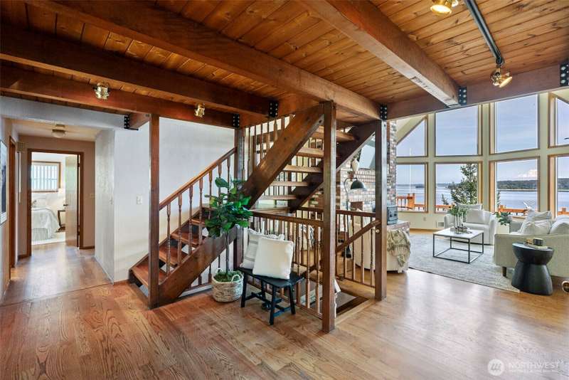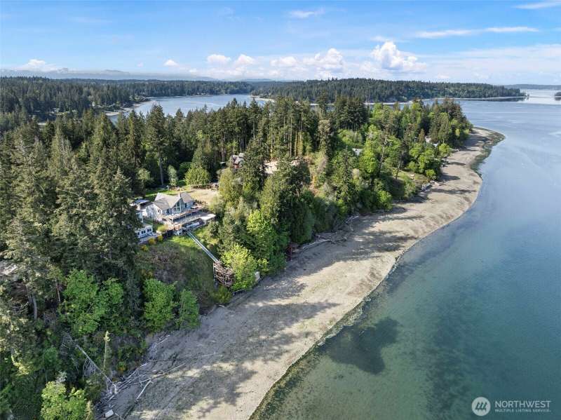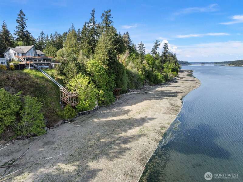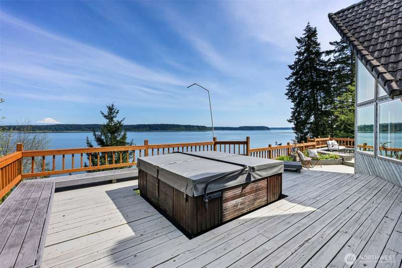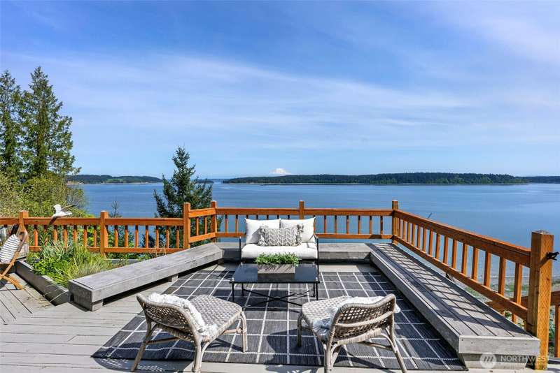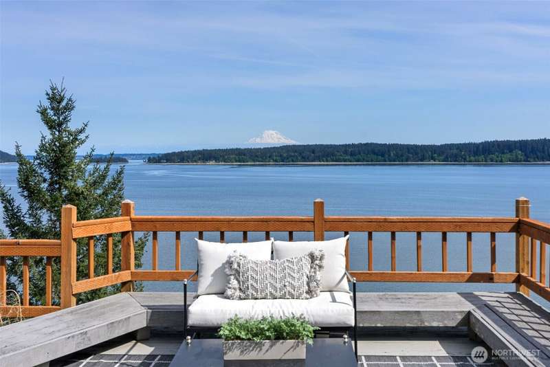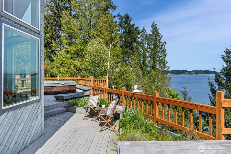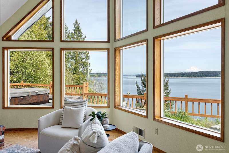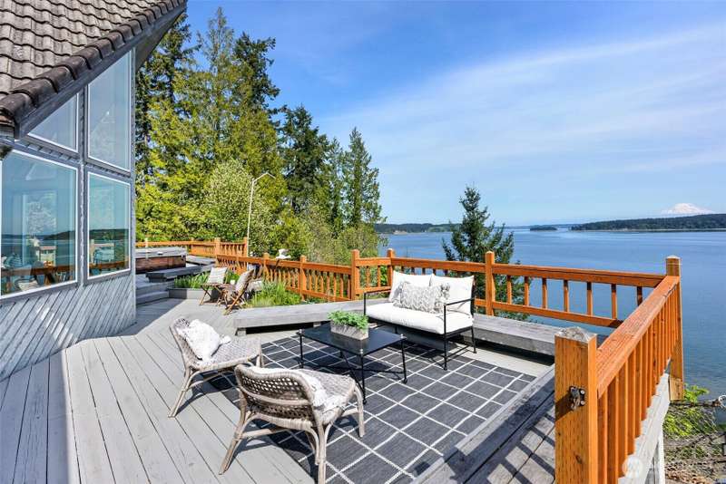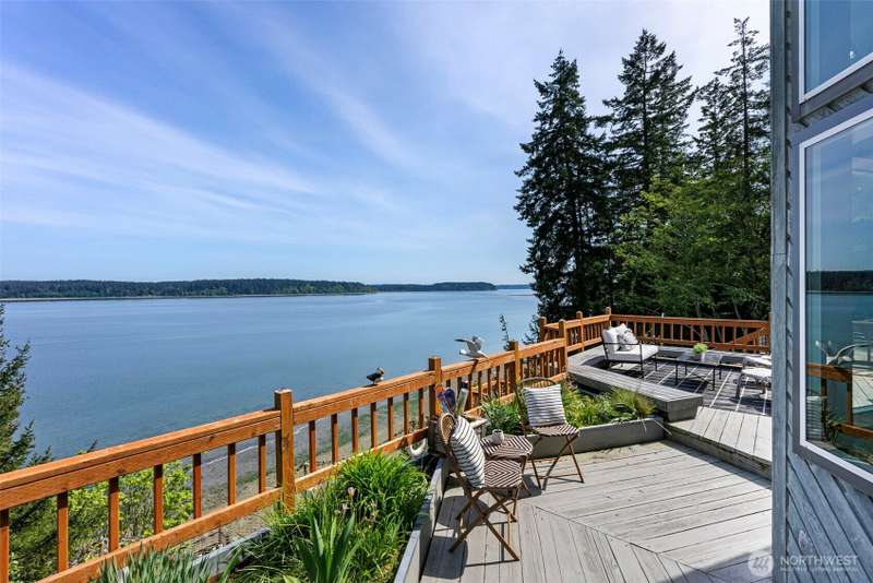 Escape to your custom waterfront home that offers breathtaking views. The timeless architectural design seamlessly blends craftsman elegance with modern elements, featuring expansive glass windows that allow for an abundance of natural light that showcase the most beautiful sunsets.The open-concept living space is perfect for entertaining, boasting a gourmet kitchen, a spacious dining area, and a cozy yet sophisticated living room, all framed by panoramic views of the water. This spacious custom home offers direct stairs to the beach. Enjoy breathtaking views of the mountains and sound from nearly every room. Relax in the private hot tub or unwind in the lush mature landscape or take a walk to the beach for sunset views and beach fires!