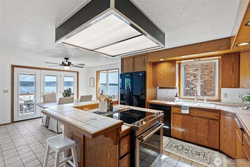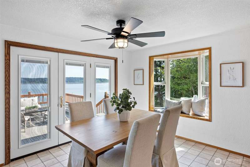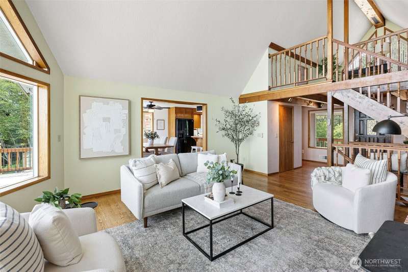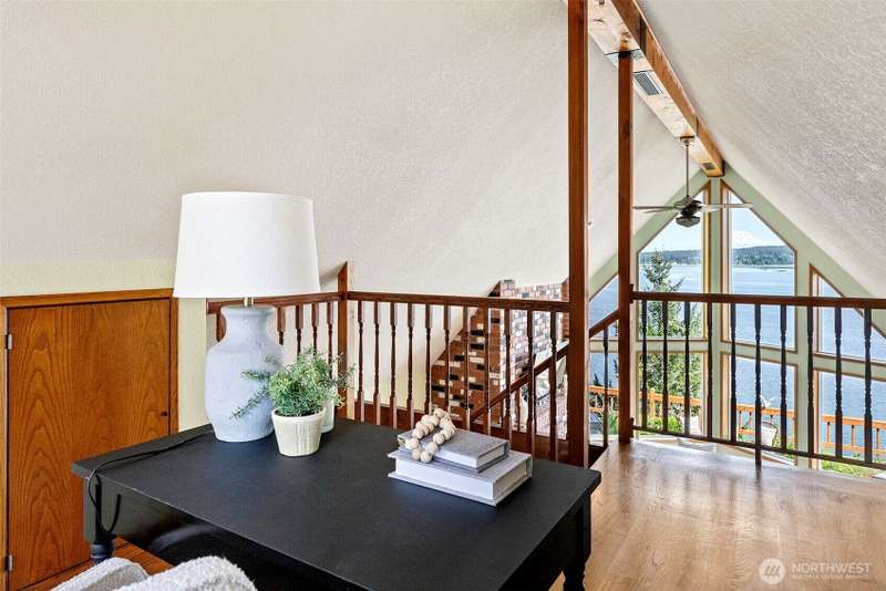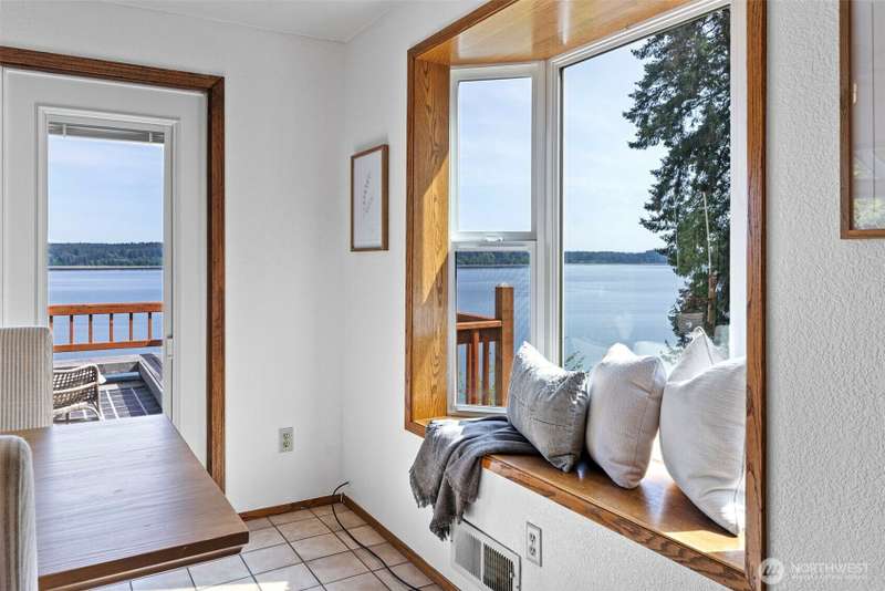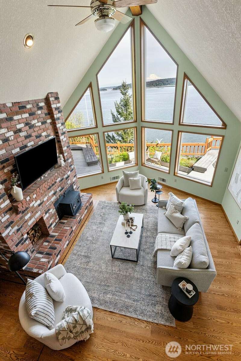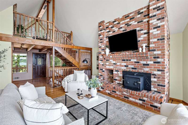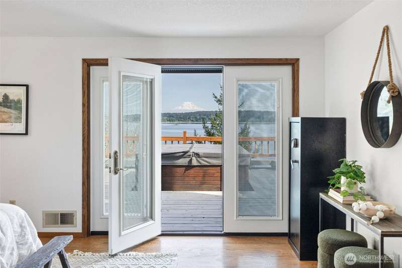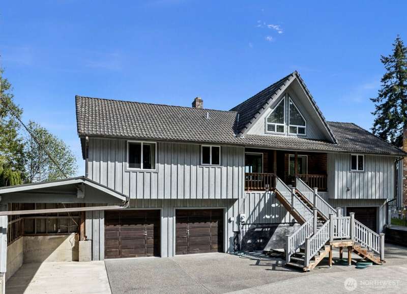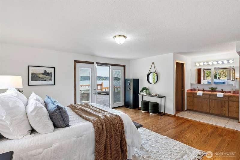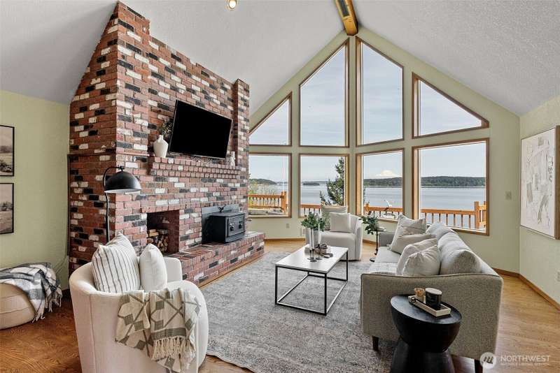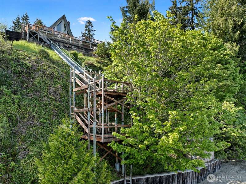 Escape to your custom waterfront home that offers breathtaking views. The timeless architectural design seamlessly blends craftsman elegance with modern elements, featuring expansive glass windows that allow for an abundance of natural light that showcase the most beautiful sunsets.The open-concept living space is perfect for entertaining, boasting a gourmet kitchen, a spacious dining area, and a cozy yet sophisticated living room, all framed by panoramic views of the water. This spacious custom home offers direct stairs to the beach. Enjoy breathtaking views of the mountains and sound from nearly every room. Relax in the private hot tub or unwind in the lush mature landscape or take a walk to the beach for sunset views and beach fires!