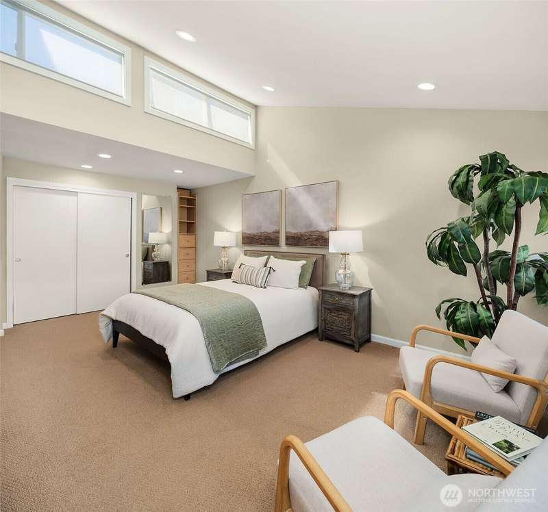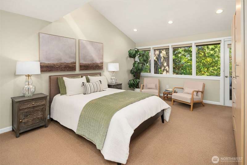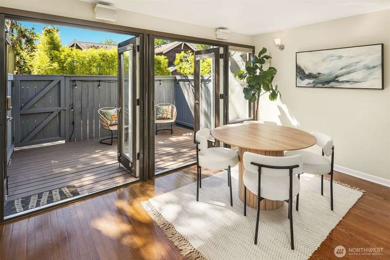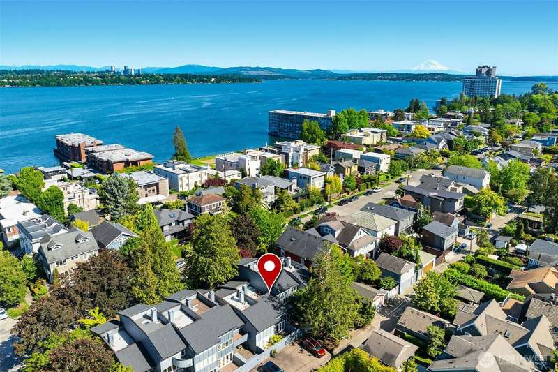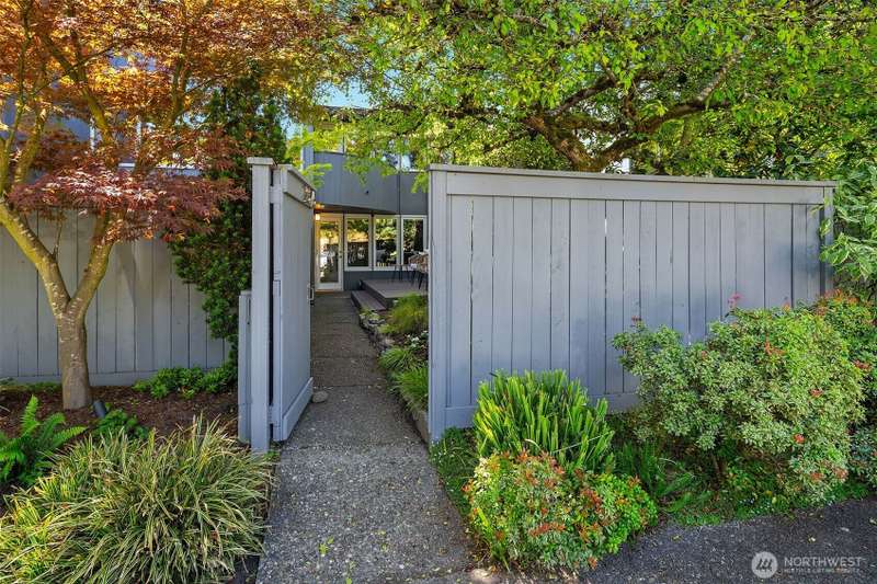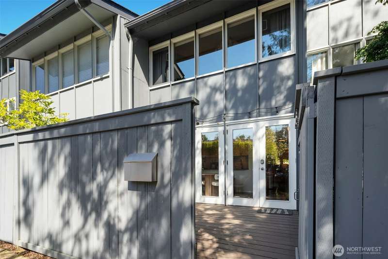 Welcome home to this spacious, quiet Madison Park townhouse, one block from Lake Washington. Enter through private gate to tranquil garden, mature trees, and large deck. Natural light pours through walls of windows. Kitchen with bar seating, dining area and double French doors to sunny back deck. Spacious primary bedroom features great storage with custom California Closet wall system, high ceilings with clerestory windows and treetop balcony overlooking courtyard below. Additional bedroom or office, full bath, and newer Samsung washer and dryer complete 2nd level. Designated parking space in back. Ideal location, just blocks to beach, shops, and dining. The best of Seattle living is waiting for you in Madison Park.