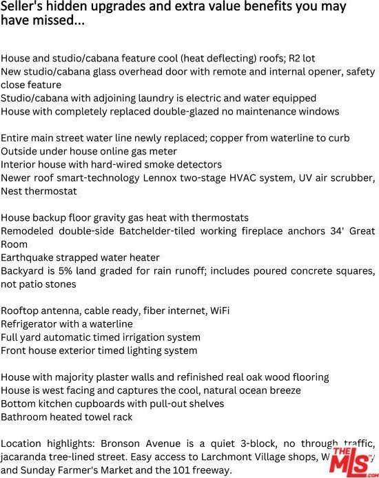 Step into a welcoming 34' full-house-wide great room, anchored by a coveted two-sided Batchelder working fireplace, making a grand statement for living, dining, and entertaining featuring a French door and skylight that flows into a chef's stone/gallery stainless kitchen.Larchmont Village life awaits in a light, airy, Spanish; public rooms in front, private in back with no street-facing bedrooms. Creatively curated, anything but ordinary; gated, hedged, landscaped yards, sculpture, city and working gardens, private backyard oasis plus a studio/cabana in greater Hancock Park. Quiet, Jacaranda tree-lined no though-traffic street, multiple cars driveway parking, close freeway access, not in a fire zone, R2 lot. Within prime Larchmont Village and its weekly markets for a well-tailored and convenient lifestyle. Everybody loves popular Larchmont!