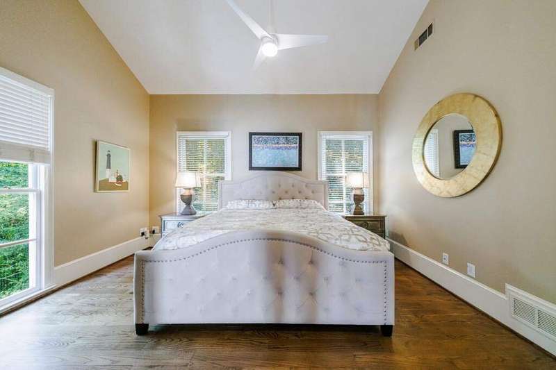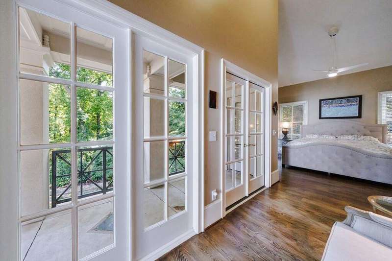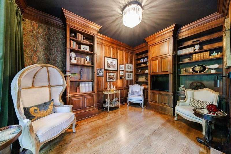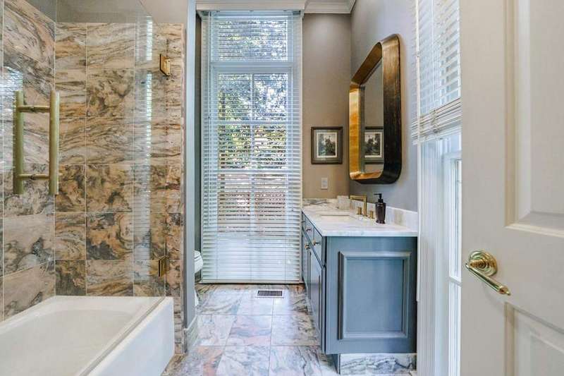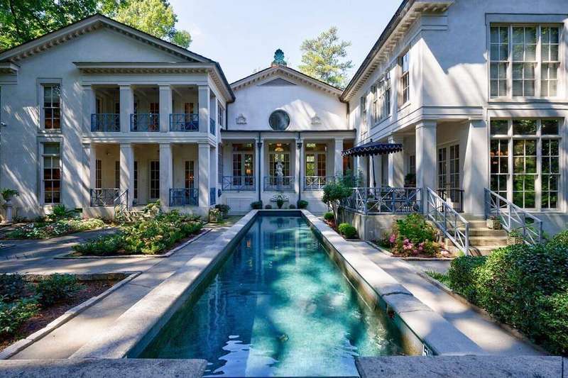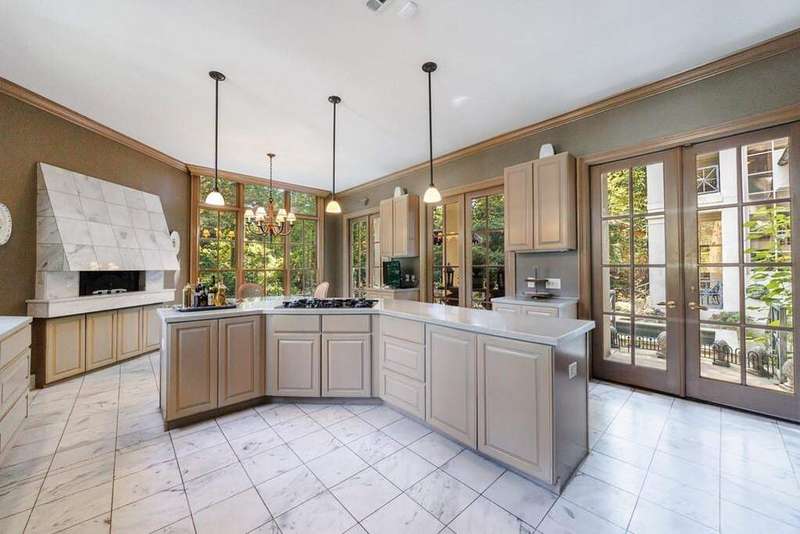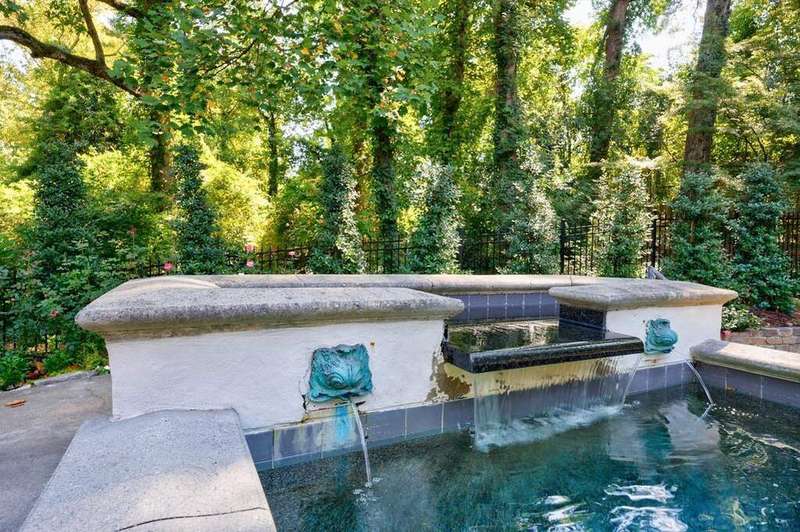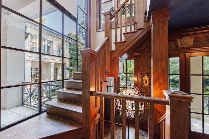 Inspired by Andrea Palladio's masterpiece, Villa Poiana, this Exquisite Tuxedo Park custom home offers truly beautiful and unique architecture throughout the property including custom window details, elegantly designed front entry and custom crown molding. Grand entrance foyer with marble flooring leads to oversized dining room and living room, both featuring a fireplace. Beautiful floor to ceiling windows through the home offers alot of natural light. French doors throughout the entire back of the house all open to the pool, ideal for entertaining. Kitchen opens to the breakfast room and includes island, gas range, wood burning oven from Provence, stone counters and marble flooring. Tucked away at the rear of the home, a richly paneled solid walnut den offers the perfect space for a private office or library. A spacious guest suite with full bath is located on the main level. Upstairs, the luxurious primary suite enjoys complete privacy via its own staircase and features a walk-in closet, dual-vanity en-suite bath with separate shower, and a serene private balcony. A second staircase on the opposite wing of the home leads to two additional bedrooms and a full bath-ideal for family or guests. The dual staircases do not connect, enhancing privacy and flexibility in layout. Basement has access to the 3 car garage (one garage in tandem). Gorgeous manicured grounds include lap pool, spa and level yard. Parking pad in the front of the house as well.