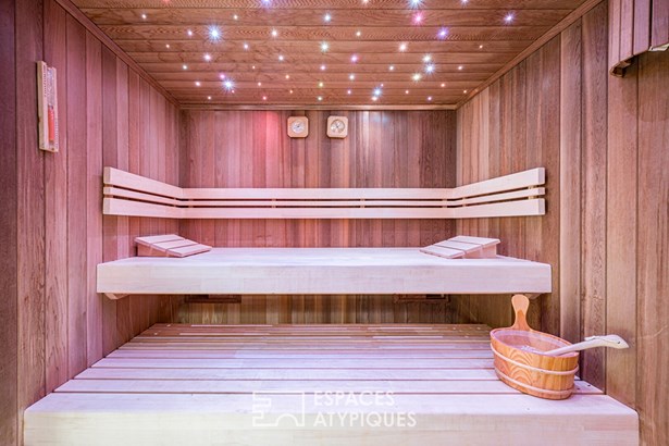 All of this extends onto a south-facing terrace with a secure swimming pool. A wellness area with a sauna and a cold bath further highlights the originality of the place.A wine cellar and two multipurpose rooms (gym, office, or bedroom) complete this level.